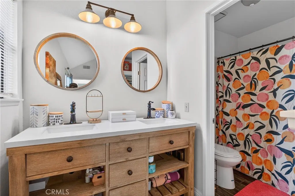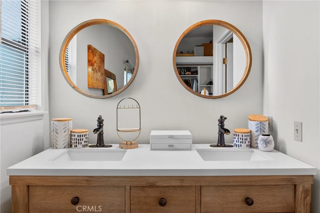 Filled with CHARM, this 2-bedroom + loft home in the Valencia Bungalows feels like home from the moment you step inside. The open floor plan creates a comfortable, easy flow, enhanced by upgraded flooring throughout. Natural light pours into the main living areas, creating a warm and welcoming atmosphere. The kitchen features newer appliances and opens seamlessly to the living and dining spaces. The downstairs primary offers a peaceful retreat with a beautifully updated vanity and mirrors in the primary bathroom. A second bedroom and full bathroom are also conveniently located downstairs for the functionality of a single story. Upstairs, there is a spacious LOFT that can add flexibility and can easily serve as a third bedroom, home office, or cozy creative nook. Enjoy walks along nearby paseos and easy access to parks, the community pool, shopping, restaurants, and Valencia Town Center. This Valencia gem offers comfort, convenience, and truly GREAT VIBES.