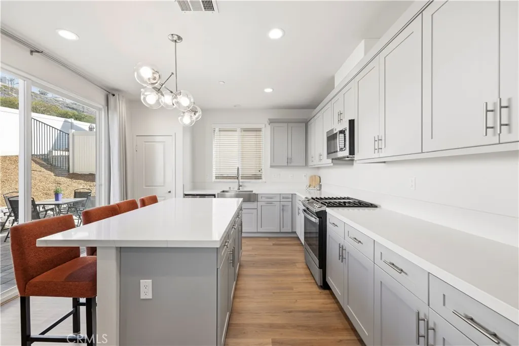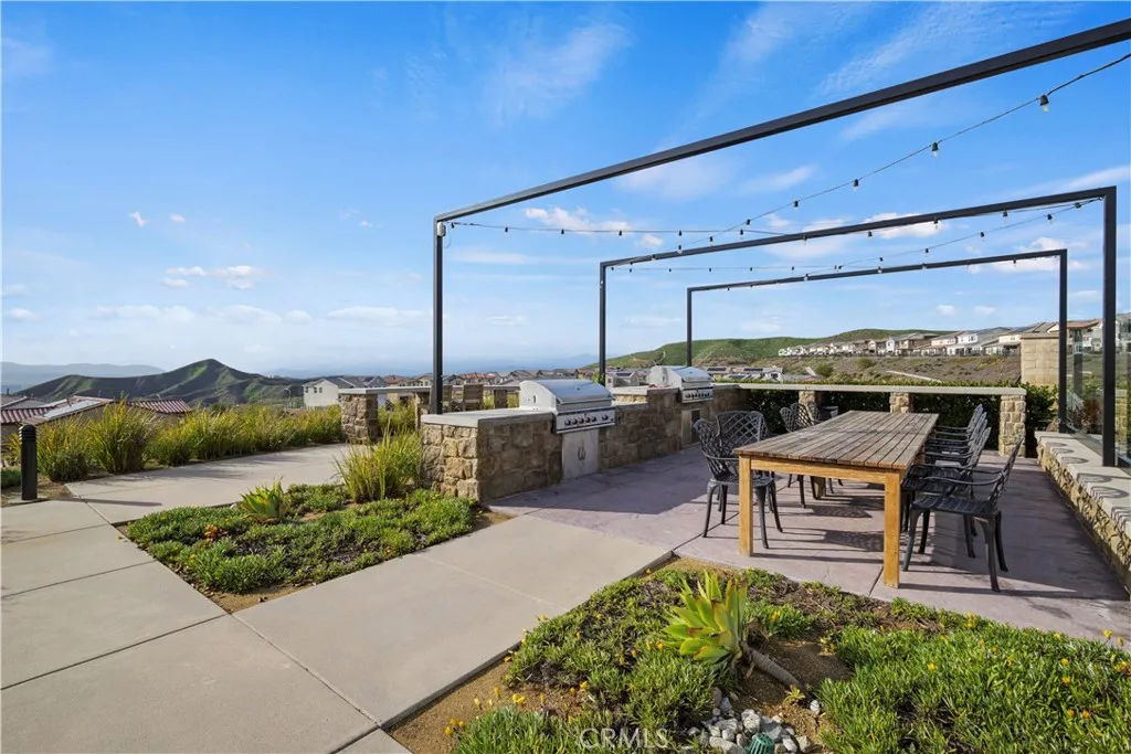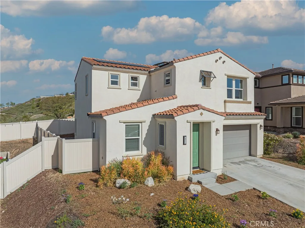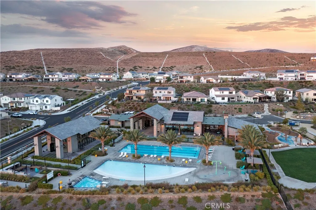This stunning beauty is located in the Sola community of the highly sought after Skyline Ranch community and includes OWNED SOLAR! It boasts 3 bedrooms, 2.5 baths, PLUS a downstairs den/office space, and an already landscaped backyard. Your open concept kitchen includes quartz countertops, grey shaker style cabinetry, stainless steel appliances and farmhouse sink, a center island doubling as a breakfast bar, and a pantry. Natural light pours in through the large picture window in the living room. Backyard sliders take you to your low maintenance, hardscaped backyard with pavers and a side yard with artificial turf. Upstairs you'll find your 3 bedrooms, 2 full bathrooms each with double sink vanities, and a dedicated laundry room for added convenience. Your spacious primary suite features its own ceiling fan, a walk-in shower, soaking tub, and a large walk-in closet. Your home also features a tankless water heater. Located walking distance to the Skyline Ranch park which has a full size basketball court, two tennis/pickleball courts, a baseball diamond, multi-purpose field, playground, walking trails, and a gazebo with picnic benches. Two streets up youll find Basecamp, Skylines newest community addition, featuring panoramic views of SCV and resort-style amenities including a lap pool, spa, grill station, a covered open air oasis, clubhouse, and kids room. Additionally, residents have access to Skyline's larger clubhouse known as The Lookout (featuring a fitness center, BBQ area, pool, spa, splash pad, playground, fire pit, and entertainment areas), Sunset Park (featuring a