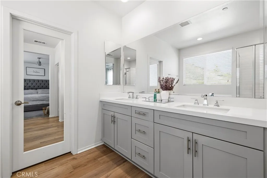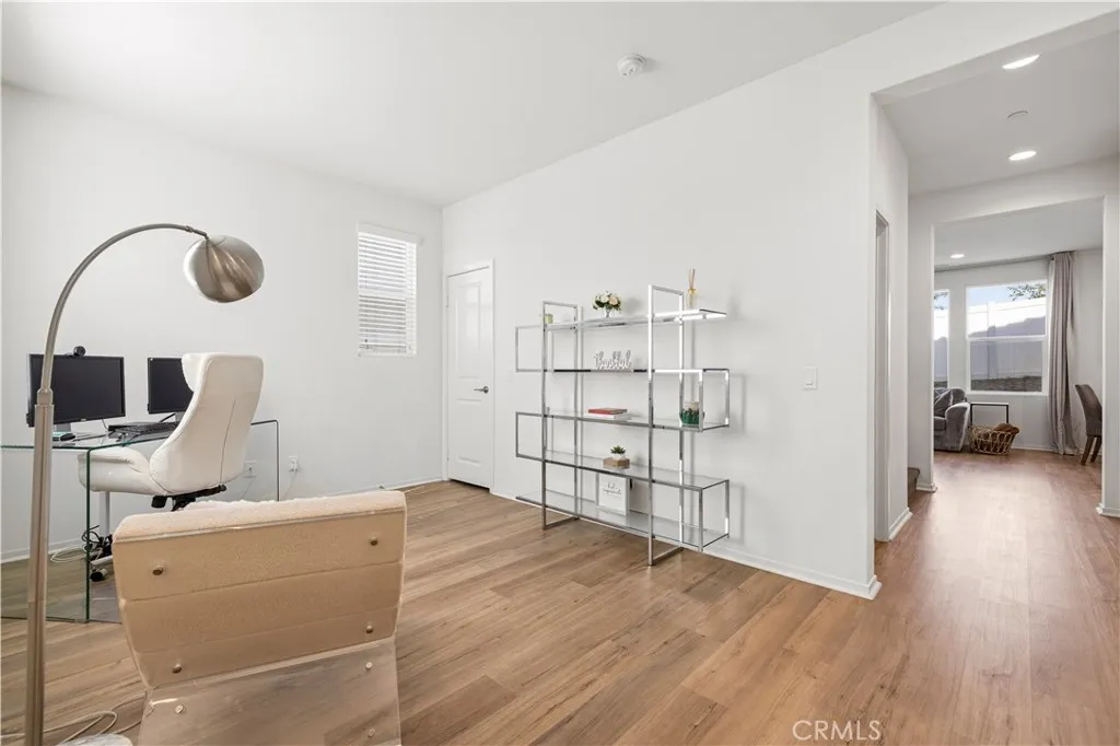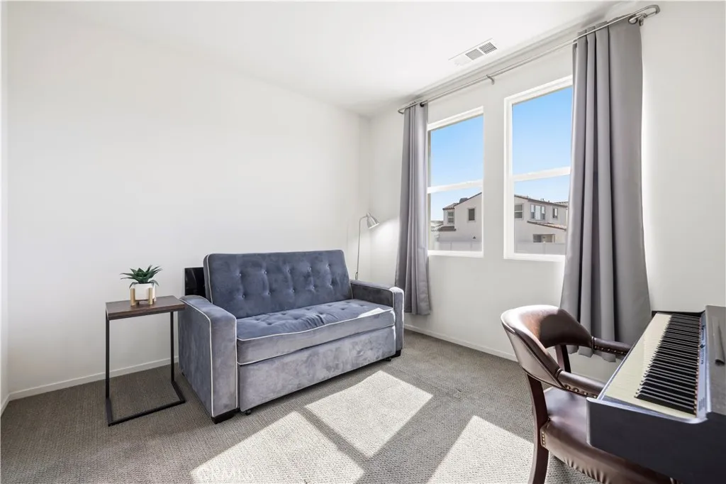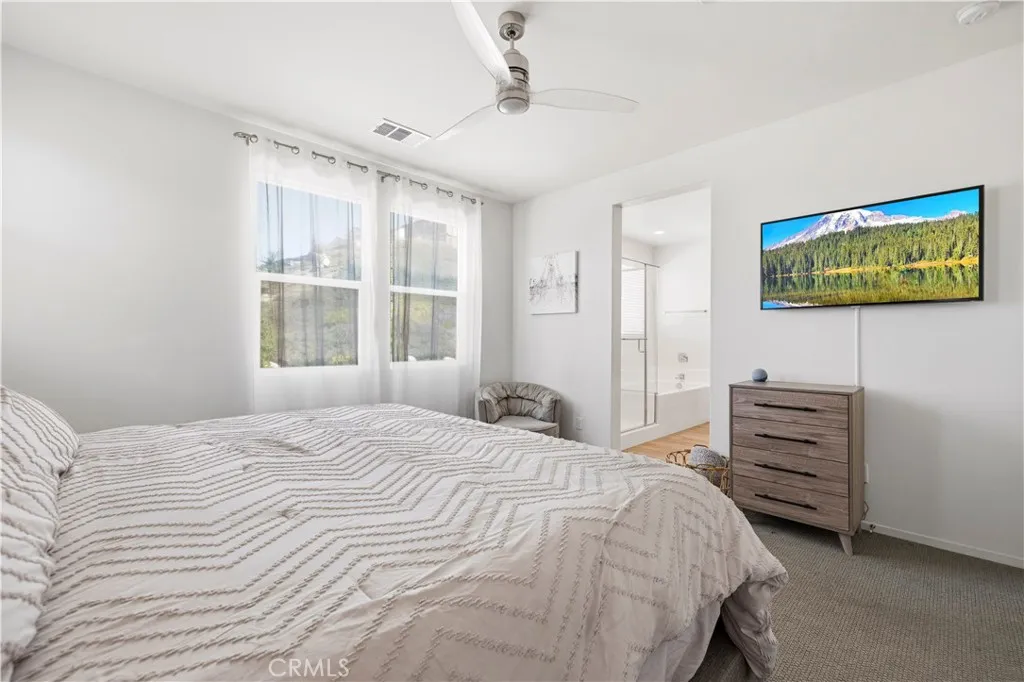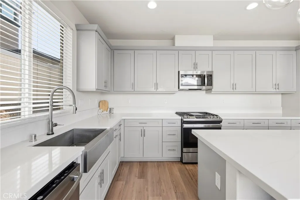 This stunning beauty is located in the Sola community of the highly sought after Skyline Ranch community and includes OWNED SOLAR! It boasts 3 bedrooms, 2.5 baths, PLUS a downstairs den/office space, and an already landscaped backyard. Your open concept kitchen includes quartz countertops, grey shaker style cabinetry, stainless steel appliances and farmhouse sink, a center island doubling as a breakfast bar, and a pantry. Natural light pours in through the large picture window in the living room. Backyard sliders take you to your low maintenance, hardscaped backyard with pavers and a side yard with artificial turf. Upstairs you'll find your 3 bedrooms, 2 full bathrooms each with double sink vanities, and a dedicated laundry room for added convenience. Your spacious primary suite features its own ceiling fan, a walk-in shower, soaking tub, and a large walk-in closet. Your home also features a tankless water heater. Located walking distance to the Skyline Ranch park which has a full size basketball court, two tennis/pickleball courts, a baseball diamond, multi-purpose field, playground, walking trails, and a gazebo with picnic benches. Two streets up youll find Basecamp, Skylines newest community addition, featuring panoramic views of SCV and resort-style amenities including a lap pool, spa, grill station, a covered open air oasis, clubhouse, and kids room. Additionally, residents have access to Skyline's larger clubhouse known as The Lookout (featuring a fitness center, BBQ area, pool, spa, splash pad, playground, fire pit, and entertainment areas), Sunset Park (featuring a