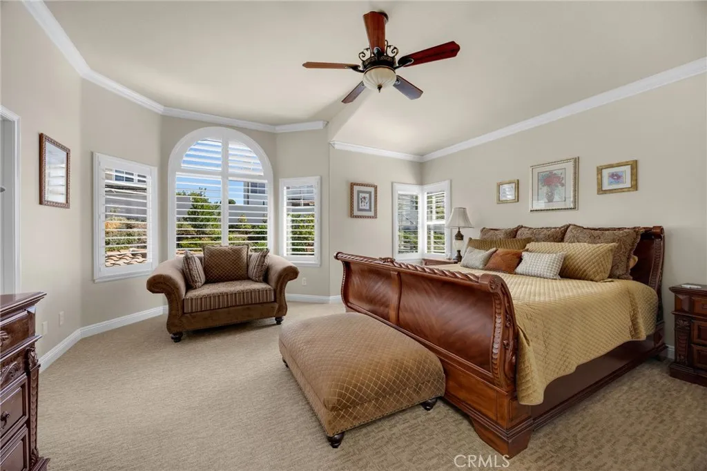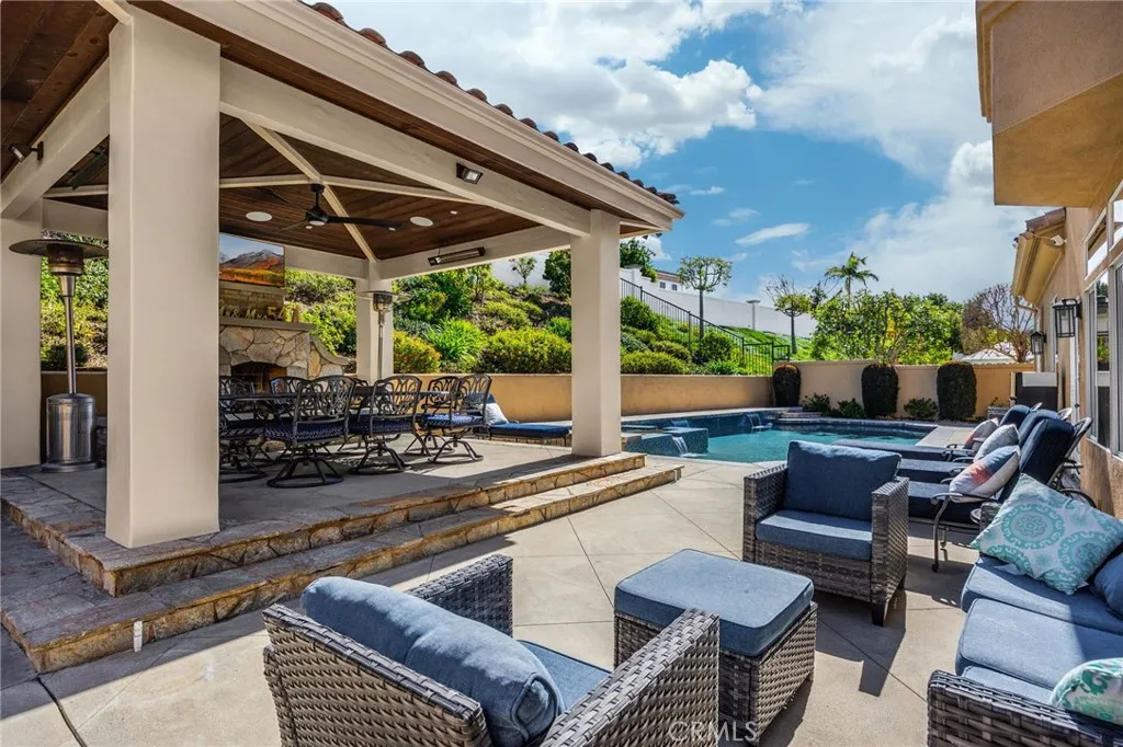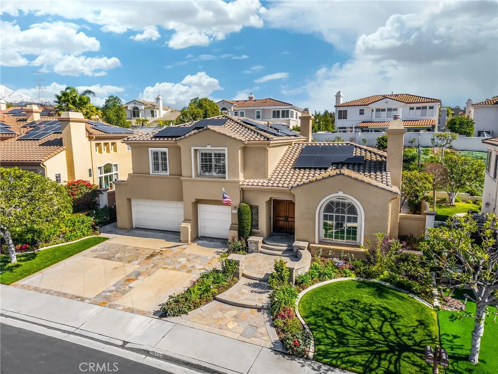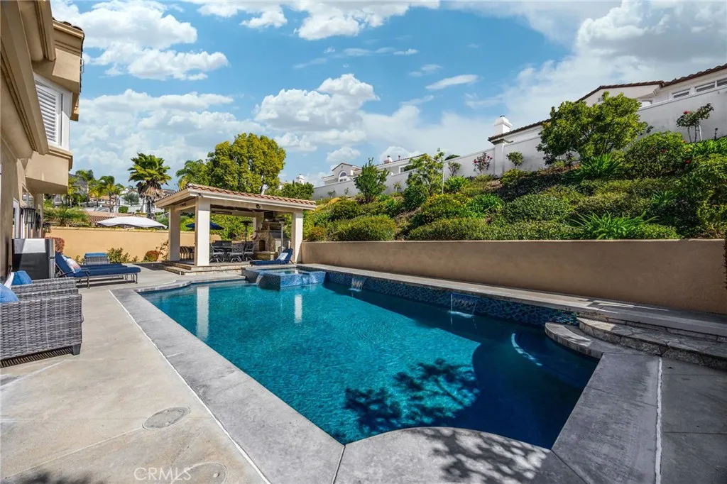 Welcome to Luxury Living in La Verne Heights! This impeccably upgraded 4-bedroom, 3-bathroom home in the prestigious gated community of La Verne Heights offers approximately 2,735 sq ft of refined living paired with a stunning resort-style backyard. Enter through elegant double doors into a warm living room that flows seamlessly into the formal dining areaperfect for everyday living and entertaining. The adjacent gourmet kitchen features top-of-the-line appliances, generous counter space, and a large quartz natural stone island, opening to the inviting family room with fireplace and built-in entertainment center. A convenient downstairs bedroom sits near a full bath and laundry room, ideal for guests or multi-generational living. Upstairs, the serene primary suite provides a private retreat with plush carpeting, crown molding, and a spa-inspired bath with dual vanities, soaking tub, and separate shower. Two additional spacious bedrooms share a dual-vanity hall bath, and the versatile loft is perfect for a home office, den, or play area. Pride of ownership shines throughout with a high-efficiency solar system, custom paint, upgraded lighting, rich hardwood flooring, and extensive crown molding. Step outside to your private oasis designed for year-round enjoyment. The breathtaking backyard features a saltwater Pebble Tec pool and spa, expansive decking, lush illuminated landscaping, and automatic sprinklers. The oversized gazebo is fully equipped with a fireplace, lighting, space heaters, and surround sound, while the adjacent BBQ center offers additional quartz countertops a