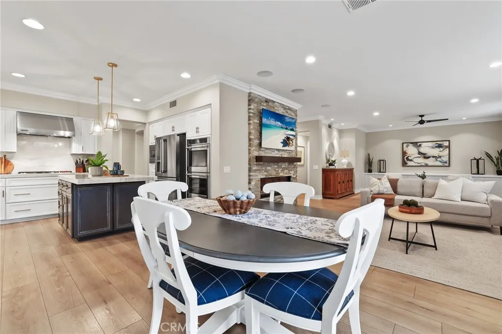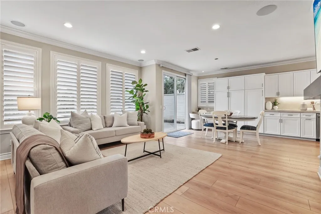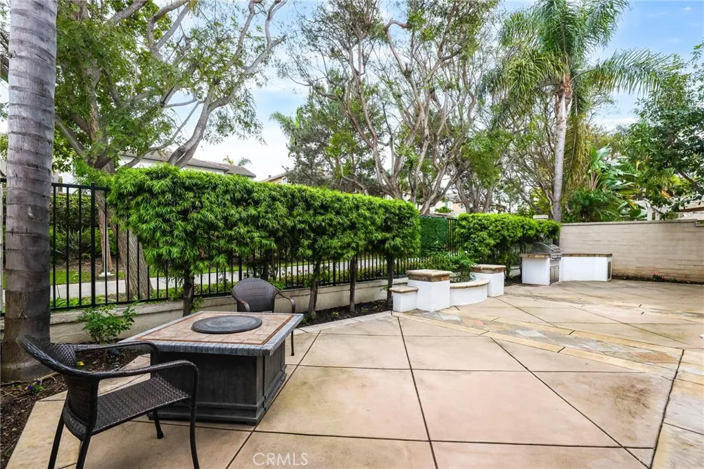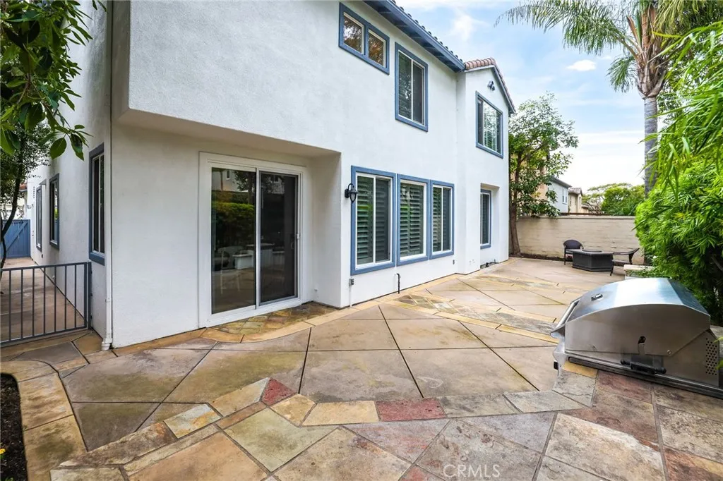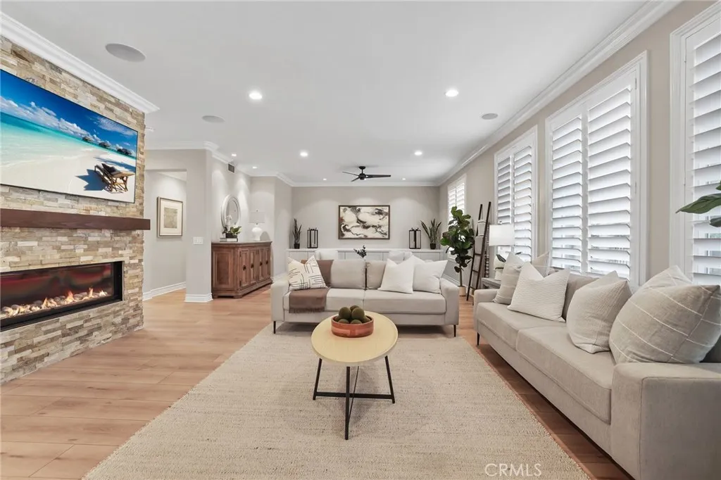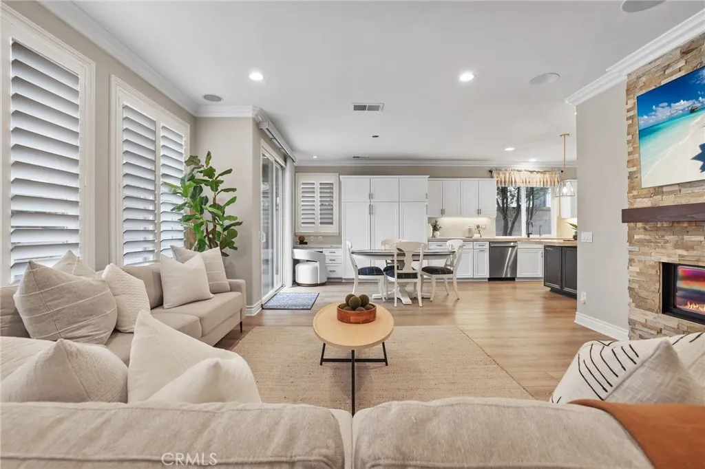 Welcome to coastal elegance in the exclusive gated community of Crystalaire, just moments from the sand and vibrant Downtown Huntington Beach. Ideally positioned on the only cul de sac in the neighborhood and backing to a peaceful greenbelt, this beautifully refreshed residence offers rare privacy and one of the most desirable floor plans. Of the three architectural models in Crystalaire, only this design features both a private courtyard entry and a traditional three car garage, creating a distinctive blend of charm, function, and outdoor living. The welcoming courtyard sets the tone for relaxed coastal living, offering a quiet space to enjoy morning coffee or evening gatherings before stepping inside. Soaring ceilings and natural light create an inviting first impression, enhanced by fresh interior paint and updated finishes throughout. The thoughtfully designed floor plan features wide plank flooring, new plush carpet upstairs, and a striking linear fireplace anchoring the expansive great room. The spacious great room was originally designed by the builder with an option for a downstairs bedroom, allowing a future owner to convert the space if desired. Plantation shutters add warmth and character, while vertical blinds frame the sliding doors leading to the backyard. The open concept kitchen is designed for everyday living and entertaining, appointed with quartzite countertops, stainless appliances, a new GE Caf dishwasher, new GE Caf double ovens, and generous cabinetry. Upstairs, the private primary suite offers a spa inspired retreat with marble finishes, soaking tub,