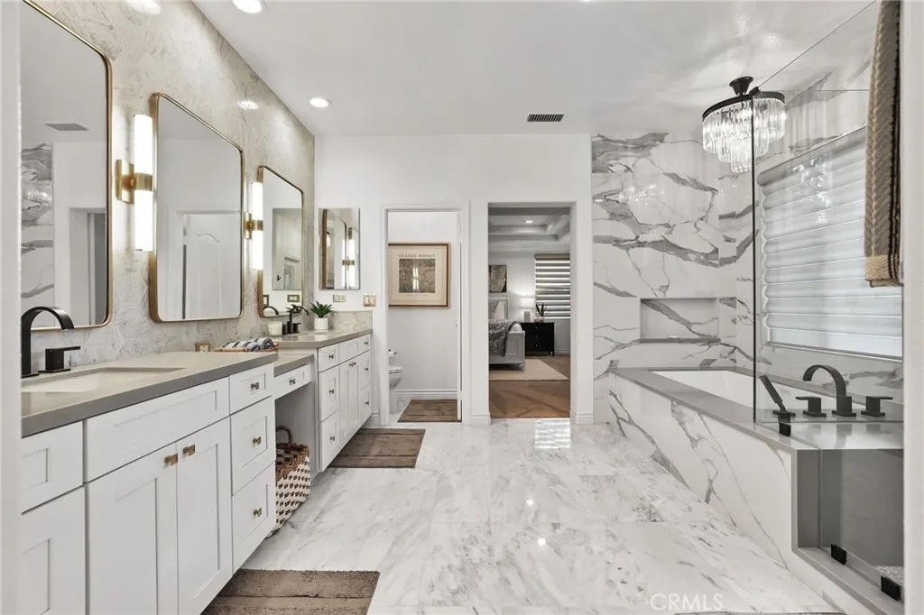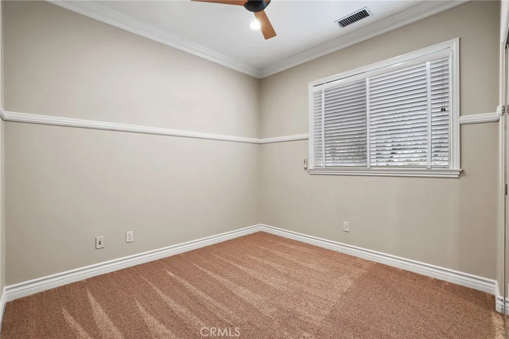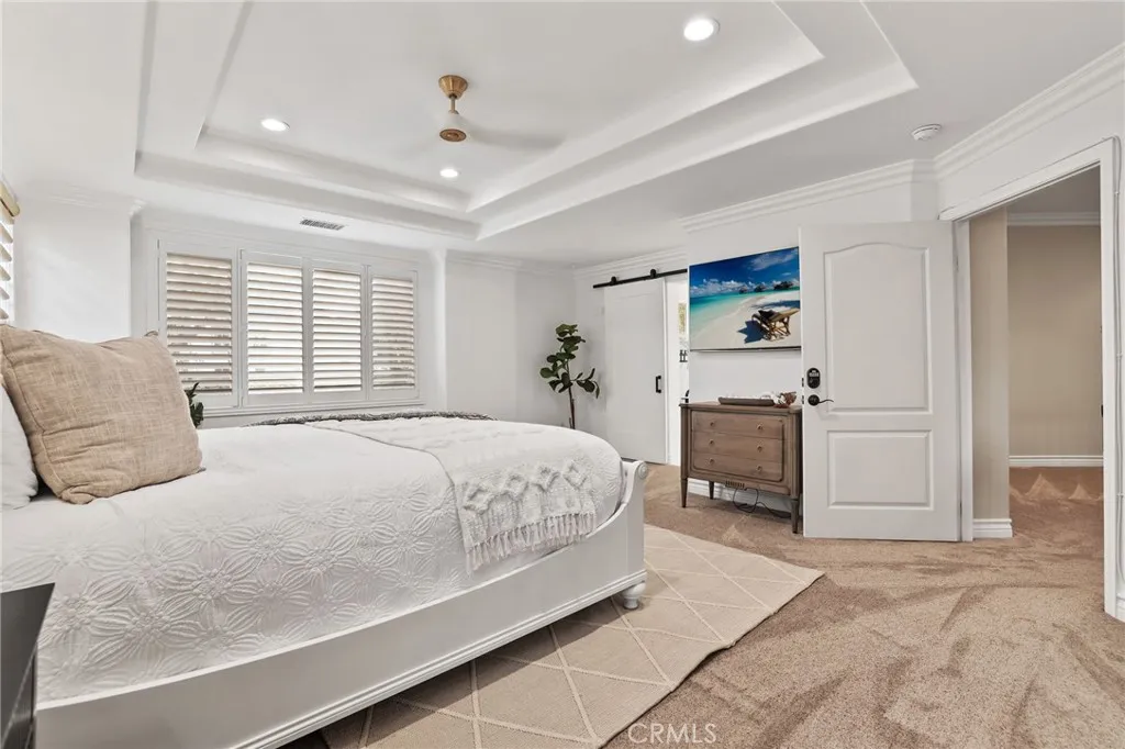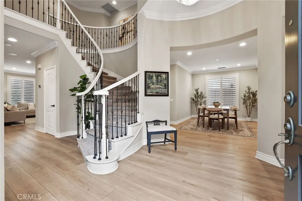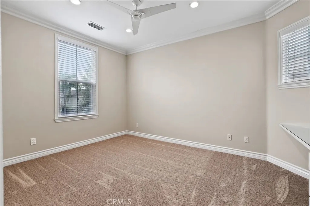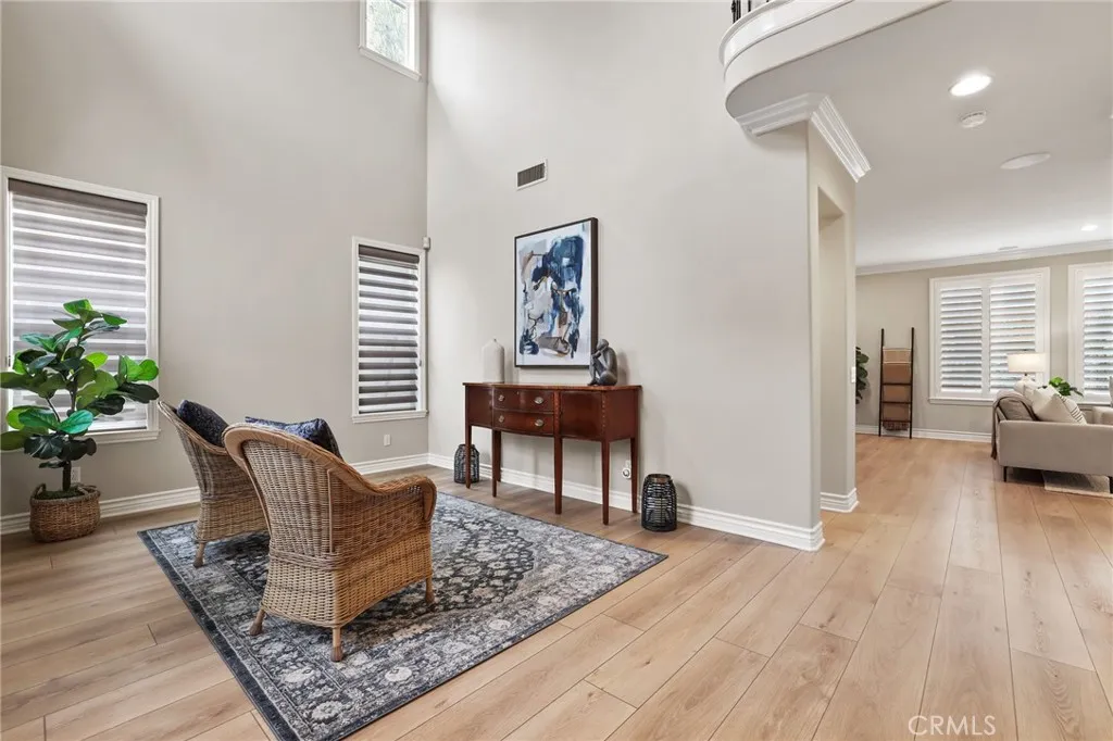 Welcome to coastal elegance in the exclusive gated community of Crystalaire, just moments from the sand and vibrant Downtown Huntington Beach. Ideally positioned on the only cul de sac in the neighborhood and backing to a peaceful greenbelt, this beautifully refreshed residence offers rare privacy and one of the most desirable floor plans. Of the three architectural models in Crystalaire, only this design features both a private courtyard entry and a traditional three car garage, creating a distinctive blend of charm, function, and outdoor living. The welcoming courtyard sets the tone for relaxed coastal living, offering a quiet space to enjoy morning coffee or evening gatherings before stepping inside. Soaring ceilings and natural light create an inviting first impression, enhanced by fresh interior paint and updated finishes throughout. The thoughtfully designed floor plan features wide plank flooring, new plush carpet upstairs, and a striking linear fireplace anchoring the expansive great room. The spacious great room was originally designed by the builder with an option for a downstairs bedroom, allowing a future owner to convert the space if desired. Plantation shutters add warmth and character, while vertical blinds frame the sliding doors leading to the backyard. The open concept kitchen is designed for everyday living and entertaining, appointed with quartzite countertops, stainless appliances, a new GE Caf dishwasher, new GE Caf double ovens, and generous cabinetry. Upstairs, the private primary suite offers a spa inspired retreat with marble finishes, soaking tub,