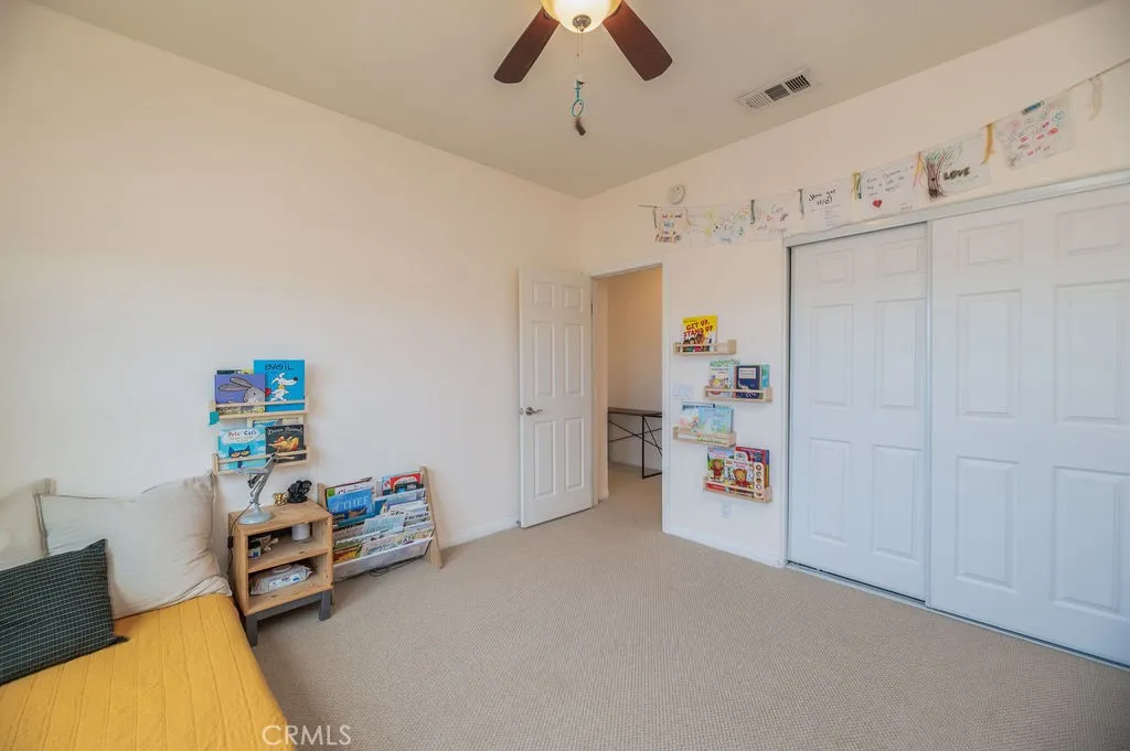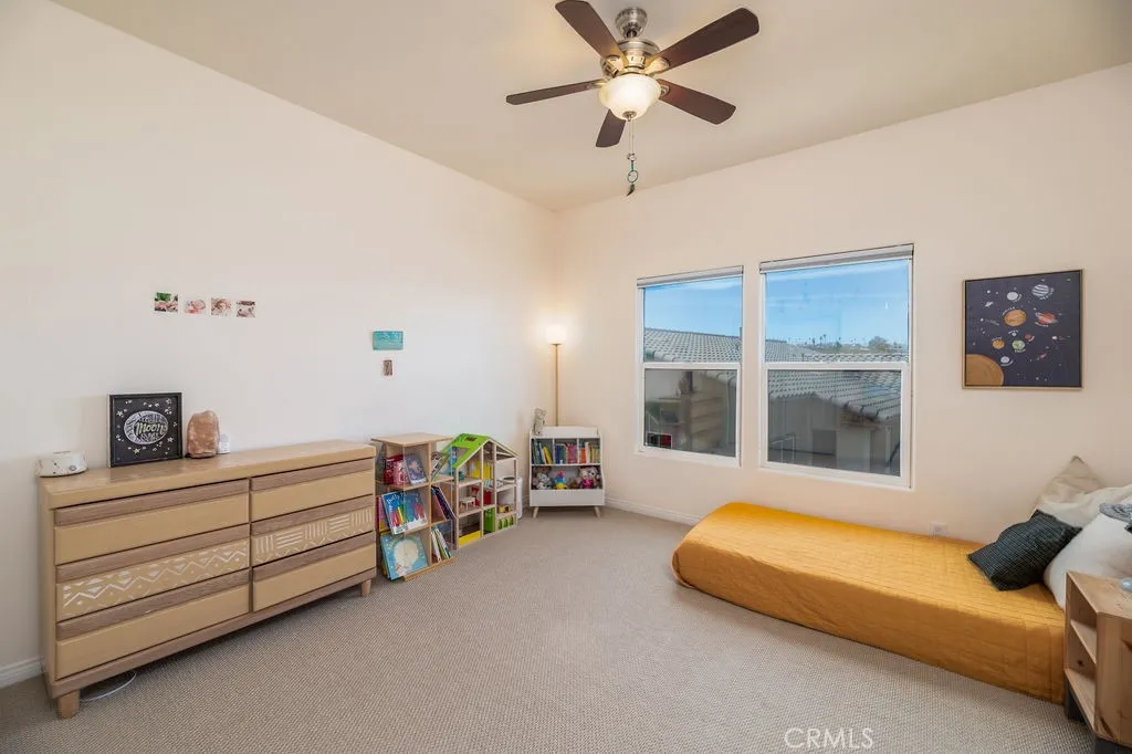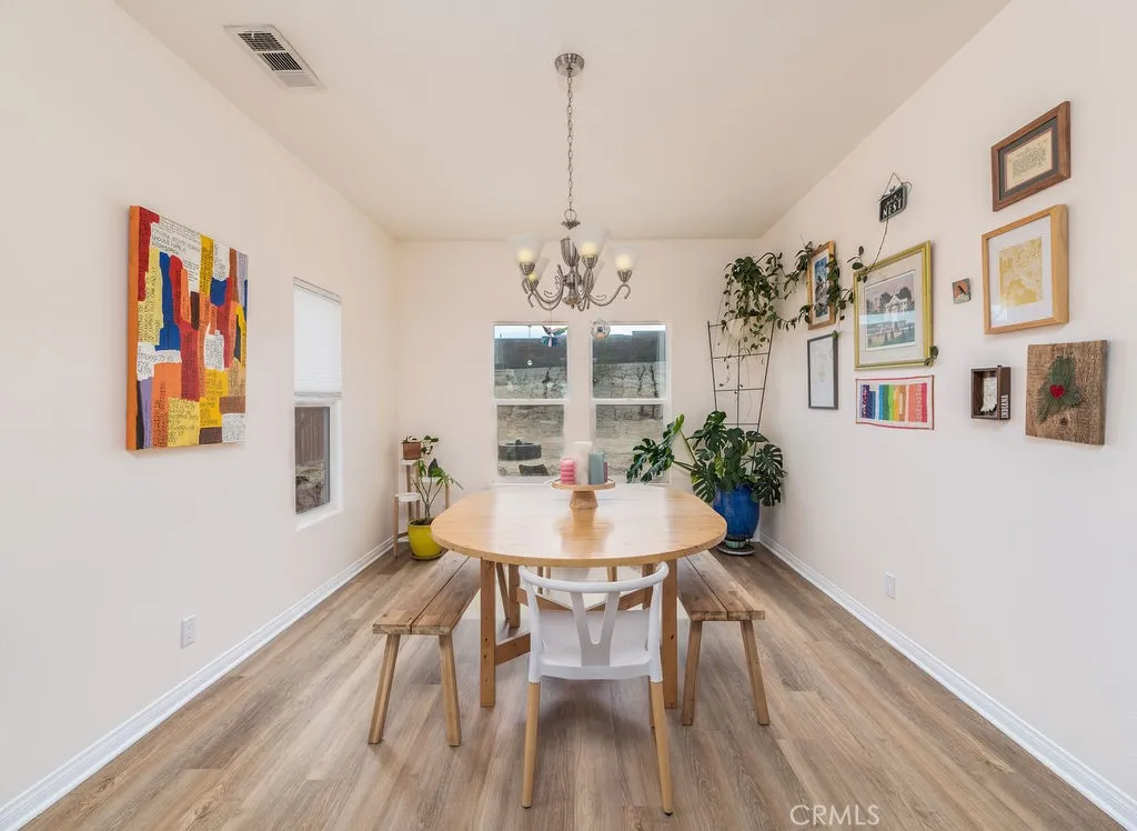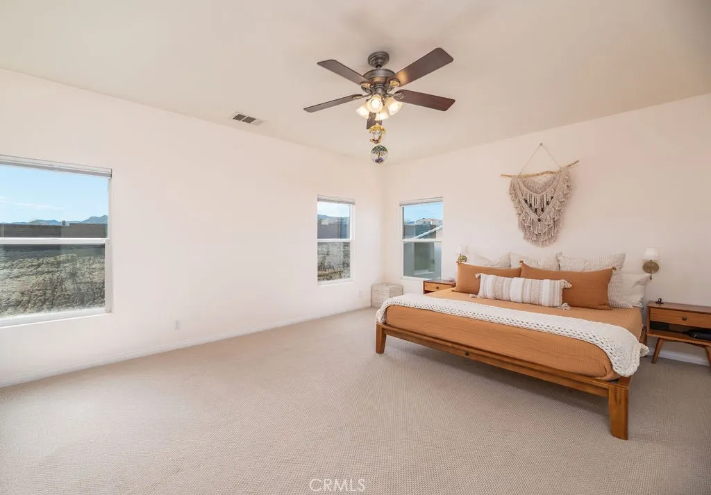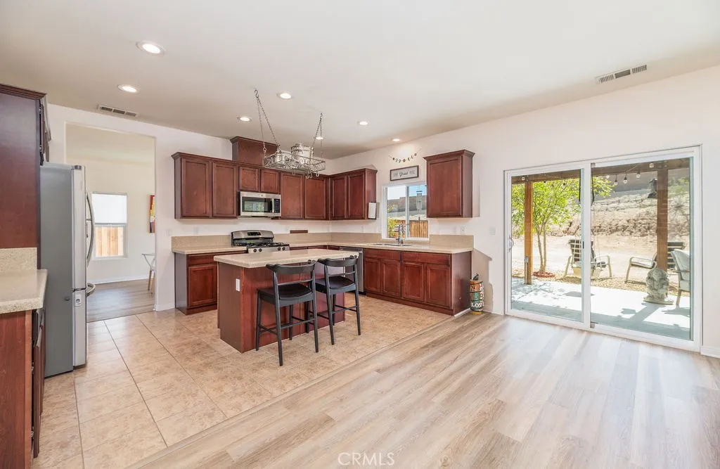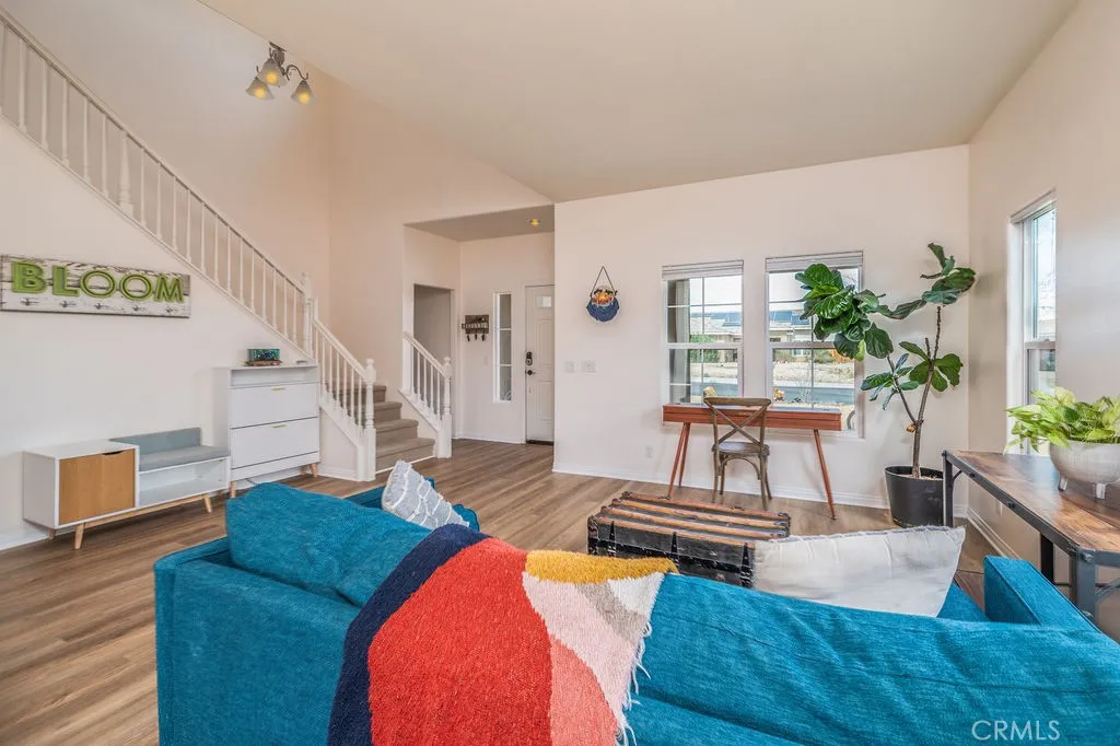Desirable two-story home in Desert Knolls, offering over 2,800 sq ft of living space, just minutes from the 29 Palms Marine Corps base, downtown, and the southeast entrance to Joshua Tree National Park. This spacious 4-bedroom, 3-bath home features a living room, dining room, and family room with direct access to the spacious backyard with semi-covered patio. Large bonus room on the first floor ideal for an office, gym, or flex space. The well-appointed kitchen features ample cabinetry and counter space, perfect for everyday living and entertaining. A dedicated upstairs laundry room adds convenience. Newly installed luxury vinyl plank on the first floor, carpeted second floor, double-pane windows, and central A/C and heating. Drywalled garage includes an EV charger and overhead storage for added functionality. The leased solar system includes two whole-house batteries for enhanced energy efficiency and backup. Attractively landscaped with easy-maintenance irrigation. Located on a quiet cul-de-sac in one of 29 Palms most sought-after neighborhoods, within walking distance to schools.