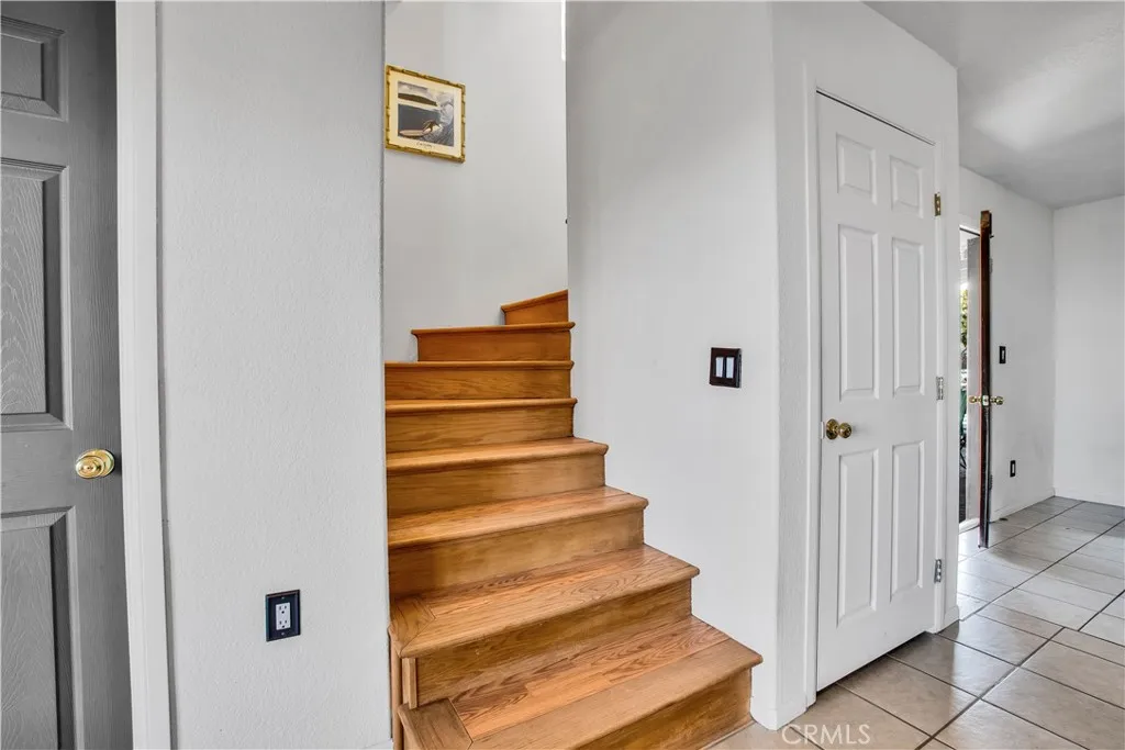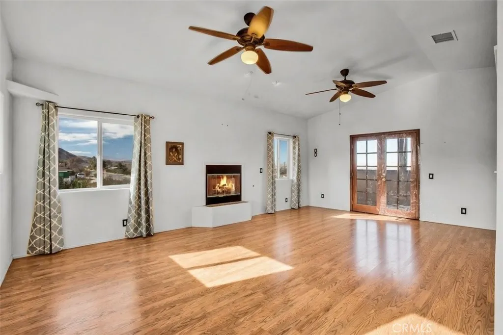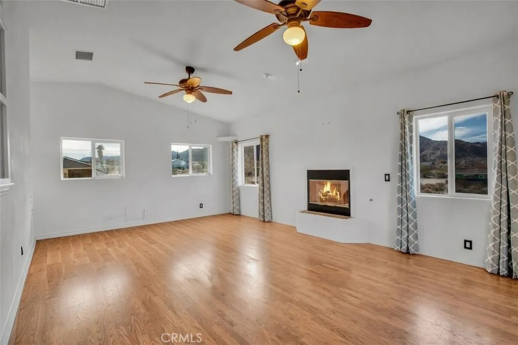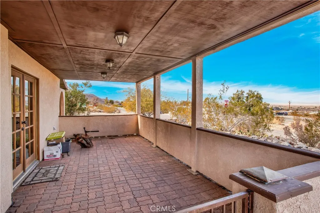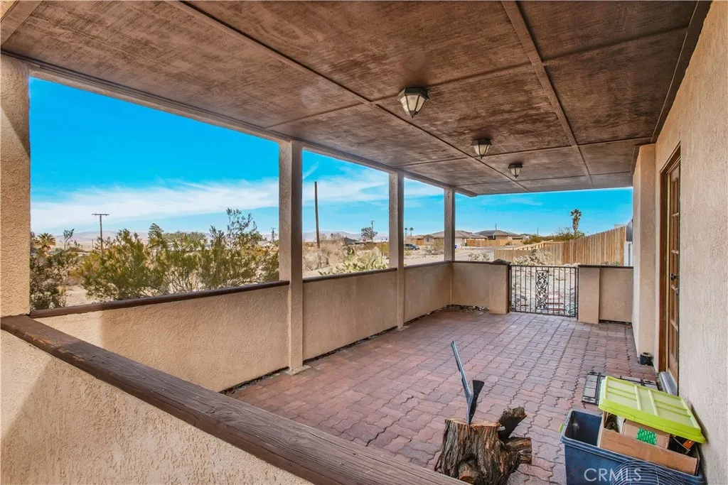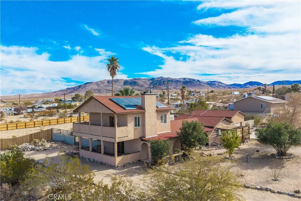 Welcome to 7565 Sherman Hoyt Ave in Twentynine Palms, a stunning two-story home offering incredible 180-degree views stretching from Big Bear and the San Bernardino Mountains to Goat Mountain, Landers, and across the entire Twentynine Palms basin and military base. This spacious property features three bedrooms downstairs plus a private upstairs master suite, totaling four bedrooms and two and a half bathrooms. The expansive living room offers a gas fireplace (currently wood burning), ceiling fan, French doors to the covered patio, and a storage closet tucked neatly under the staircase. The kitchen has been upgraded with granite slab countertops, center island, built-in storage cabinetry, pull-out faucet, dishwasher, gas oven and stove with overhead microwave, and opens to a dedicated dining area. Downstairs includes three bedrooms with mirrored closet doors and ceiling fans (one with light only), a full bathroom, and an additional half bath powder room. Upstairs, the master suite offers vaulted ceilings, two ceiling fans, a cozy fireplace with gas log set, walk-in closet, updated walk-in tile shower, and French doors leading to a wraparound balcony showcasing breathtaking panoramic desert views. The suite also features its own private entrance, creating potential for multigenerational living or possible second unit use. The home is equipped with dual cooling systems including central HVAC plus multiple evaporative coolers, along with paid-off and owned solar for energy efficiency. Additional features include a custom front door, covered front porch with paver walkway, one-
