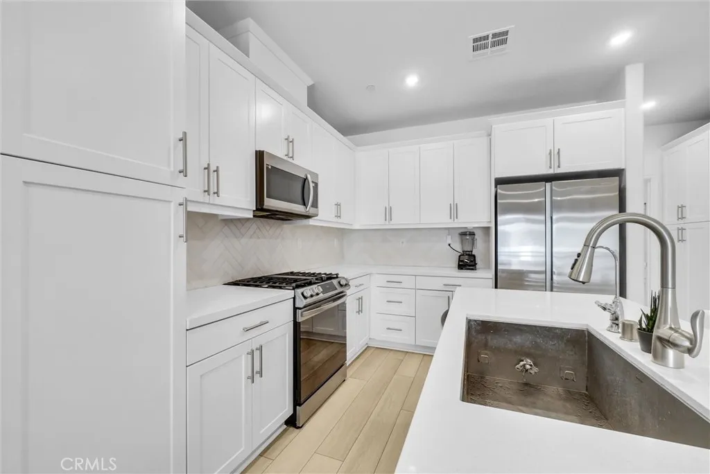 Location, Location, Location! Paid-off solar system and upgraded luxury vinyl flooring set the tone for this stunning tri-level 2024-built, nearly new 3-bedroom, 3-bath condominium offering approximately 1,480 sq. ft. of modern living. Each bedroom features its own private bath, including two ensuite bedrooms, providing ideal comfort and privacy. The open-concept layout showcases a granite kitchen with center island flowing seamlessly into the dining and living areas, perfect for everyday living and entertaining. A versatile downstairs space is ideal for a home office or flex area, while the spacious primary suite boasts dual walk-in closets. Enjoy a generous private balcony and the convenience of a tandem garage. Located in a gated community in desirable La Verne, near top-rated schools, abundant shopping and dining, easy access to Interstate 210, and just minutes from University of La Verne, this home offers the perfect blend of comfort, style, and location.