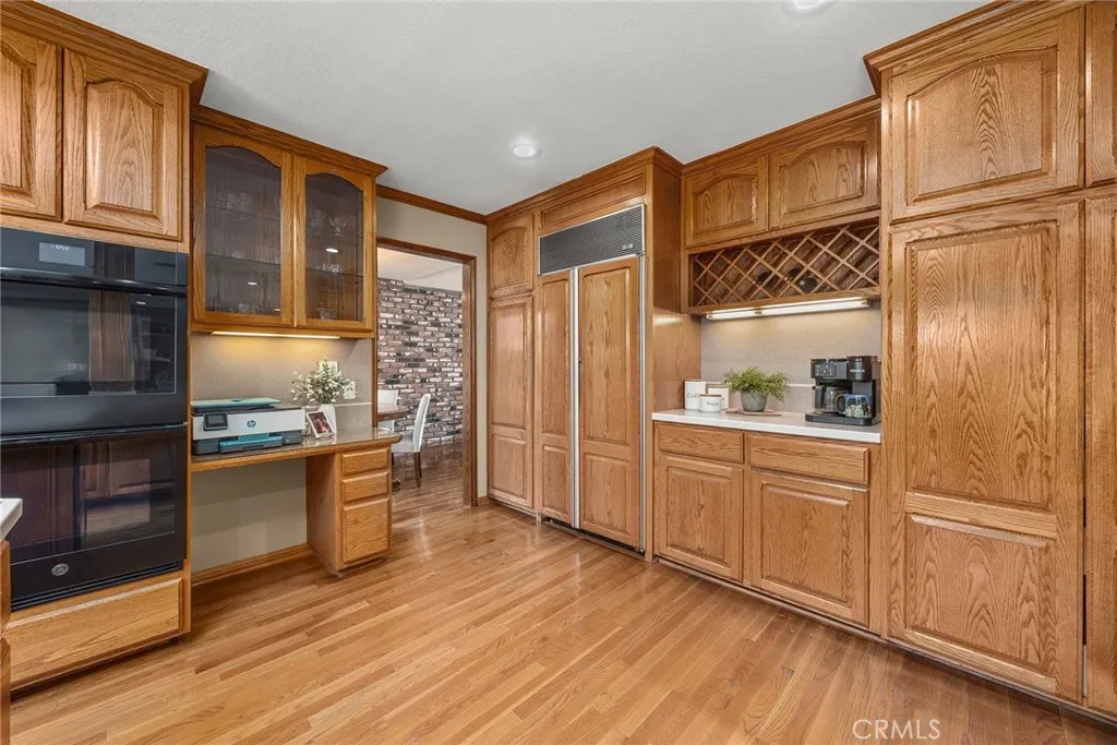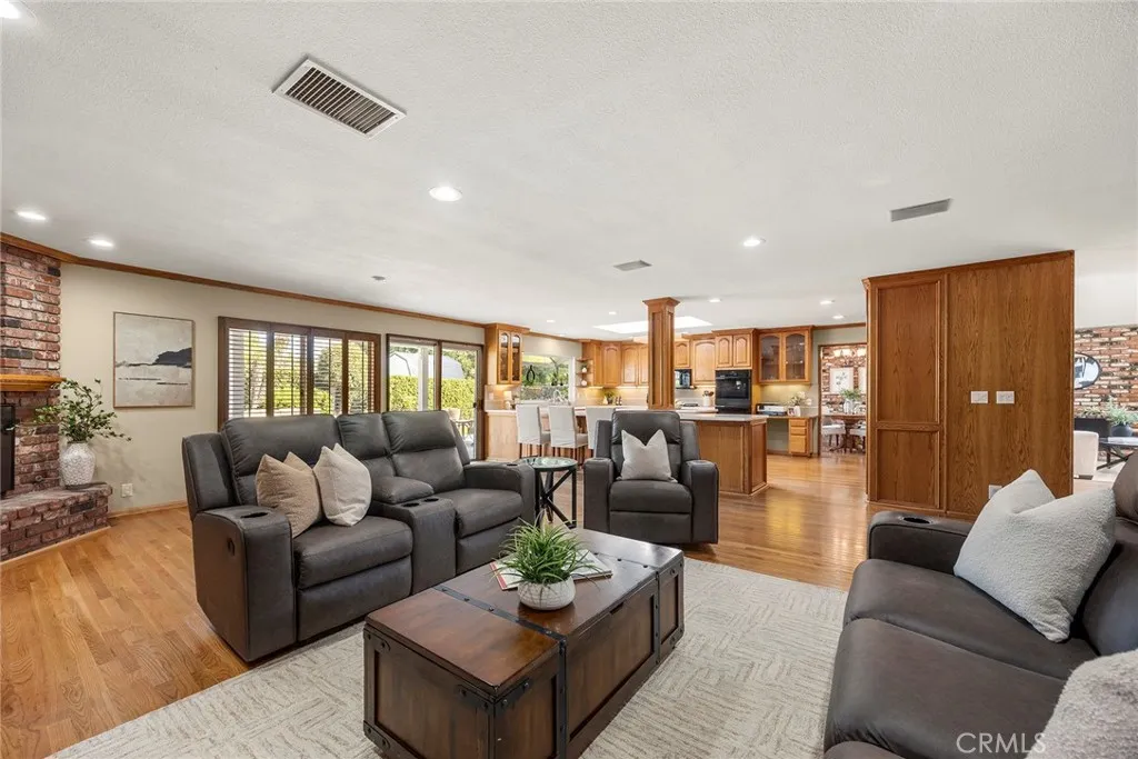 Welcome to 130 N Avenida Veracruz in Anaheim Hills, a rare opportunity to own a truly one of a kind 4 bedroom 3 bathroom home in one of the areas most sought after neighborhoods. This thoughtfully expanded residence offers an oversized kitchen and family room design that creates exceptional flow for everyday living and unforgettable entertaining. Rich wood flooring adds warmth and character while the chefs kitchen becomes the heart of the home featuring a large center island, double ovens, gas range, built in refrigerator and a charming garden window overlooking the backyard patio. A custom bar opens to the spacious family room, creating the perfect setting for gatherings, celebrations and holiday traditions. The formal living room and dining room showcase a beautiful brick accent wall and a second fireplace, adding architectural interest and inviting ambiance. A downstairs bedroom and full bathroom provide flexible living options for guests, extended stays or a private home office. The large inside laundry room offers functionality and storage. Upstairs, the expansive primary suite captures views and includes a private bathroom and two walk in closets. Secondary bedrooms are generously sized and designed for comfort. Recent updates include the roof (5 years) and appliances, offering peace of mind. Situated on a large lot with room for a future pool, the backyard is designed for entertaining with epoxy patio flooring and a built in BBQ. The front yard is equally impressive, complemented by two storage sheds, a two car garage with epoxy floors and an oversized driveway with