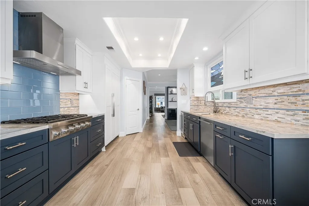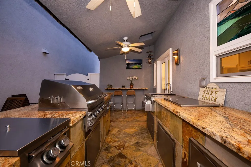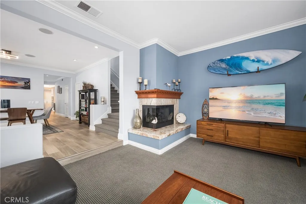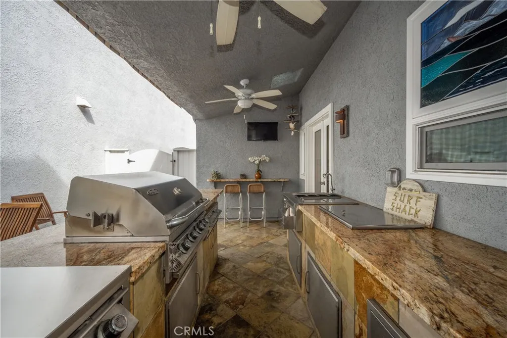 Just steps from the sand in the heart of Old Town Seal Beach, this exceptional coastal residence captures the essence of luxury beach livingwhere ocean breezes, walkable Main Street charm, and refined design come together in one remarkable home. Spanning approximately 2,848 square feet on a 3,080 square foot lot, this four-bedroom, three-and-a-half-bath residence has been thoughtfully upgraded to deliver both elegance and comfort, creating the perfect setting for relaxed coastal living and effortless entertaining. Inside, custom coastal influencesincluding stained glass accents, rich finishes, and two fireplacescreate warmth and character throughout. The remodeled gourmet kitchen serves as the centerpiece, featuring custom shaker cabinetry, a built-in refrigerator, premium Thermador appliances including a six-burner range and oven, wine cooler, and a striking stacked stone backsplash. The kitchen flows seamlessly into expansive living and dining areas designed for both everyday living and hosting. Adjacent spaces include a welcoming den with a floor-to-ceiling stacked stone fireplace and custom built-ins, while the main living room offers a second fireplace and motorized blackout blinds. New flooring, carpet, and dual-pane windows enhance both style and efficiency. The roofline has been extended to create a covered outdoor patio with a retractable awning, enhancing indoor-outdoor living. The backyard is an entertainers dream, featuring a fully equipped outdoor kitchen and BBQ area with cooktop, refrigerator, wet bar, granite counters, and elegant teak furnishingsperfect for