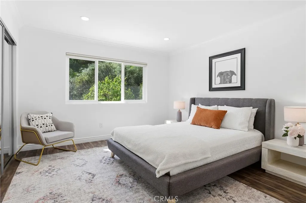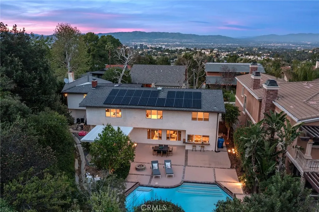 Located South of the Boulevard in the idyllic and coveted quiet neighborhood of Woodland Crest sits this sprawling 5 bedroom, 3,256 SF pool home situated on a 26k SF cul-de-sac lot with completely owned/paid off solar panels that provide no electricity bills! The property sits elevated above the street with mature landscaping and a sweeping paver stone driveway that leads to the 2-car garage with direct access. A covered front porch greets you before entering the sunlit 2-story entry with oversized windows that bask the home with natural light. The spacious living room features fireplace, tiled accent wall, and glass sliders that open to the backyard. The formal dining room can accommodate large dinner parties, while a separate formal living room/den provides a great space to unwind and enjoy more quiet conversation. The upgraded kitchen has quartz counters, custom cabinetry, stainless appliances, peninsula with breakfast bar seating, breakfast nook with exterior access, and expansive windows that open to the yard with pass-through serving counter. A guest powder bathroom is conveniently located off the living spaces. Upstairs you will find 5 well appointed bedrooms, including the expanded primary suite which boasts separate sitting room, bedroom with fireplace and peak-a-boo mountain views, large walk-in closet with built-ins + second wardrobe closet, and luxurious remodeled en-suite bathroom with dual sinks, spa tub, and separate walk-in shower. A second junior primary suite features vaulted ceiling and en-suite bathroom with walk-in shower. Three additional secondary bed