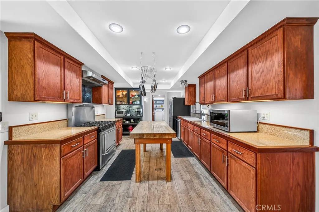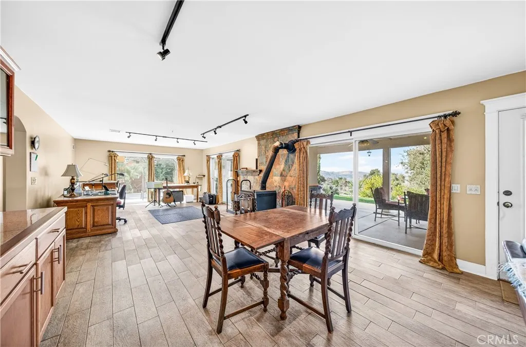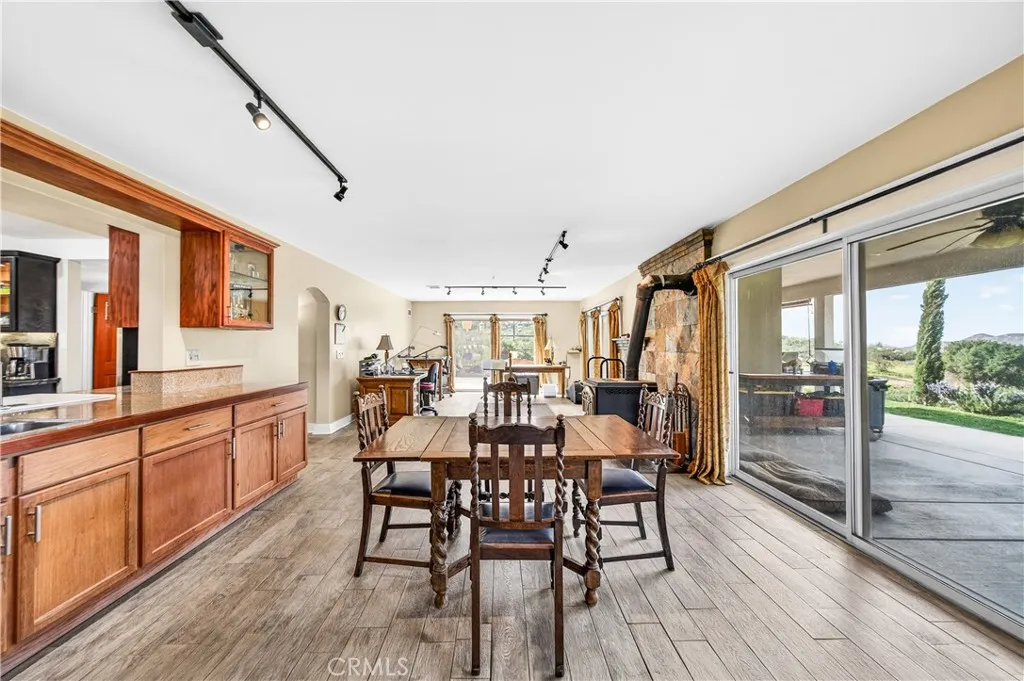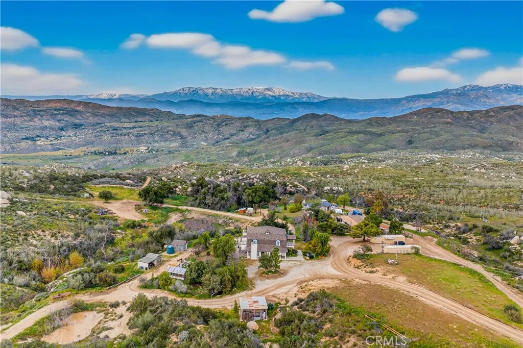An extraordinary opportunity awaits at 33620 Oak Dr, Hemet, CA 92544 an exceptional 47.85-acre retreat privately situated at the end of a dedicated easement and embraced by a stunning 360-acre nature preserve and national forest. This remarkable property features three beautifully designed residences, creating the ultimate private sanctuary for multi-generational living, rental income, or a peaceful escape. The main residence spans approximately 3,400 square feet and offers four spacious bedrooms, three full bathrooms, two dining areas, and a thoughtfully designed kitchen that opens seamlessly into a breathtaking great room with a built-in bar and panoramic views through three expansive sliding glass doors perfect for unforgettable gatherings. Solid wood plank flooring enhances the inviting family room, complete with a cozy wood-burning stove, while the downstairs features tile flooring and the home boasts a total of two wood-burning stoves and one fireplace. Upstairs, four bedrooms one ideal for a home office provide comfort and flexibility. The second residence, an approximately 1,450-square-foot manufactured home, includes two bedrooms, two bathrooms, a generous living room, a family room with a wood-burning stove, a spacious kitchen with an island, and an indoor laundry area. The third residence, affectionately known as The Cottage, offers approximately 850 square feet of charming living space with one bedroom, one bathroom, a brand-new kitchen, and a wood-burning stove that enhances its cozy cabin ambiance. The land itself is a nature lovers dream, featuring seasonal c