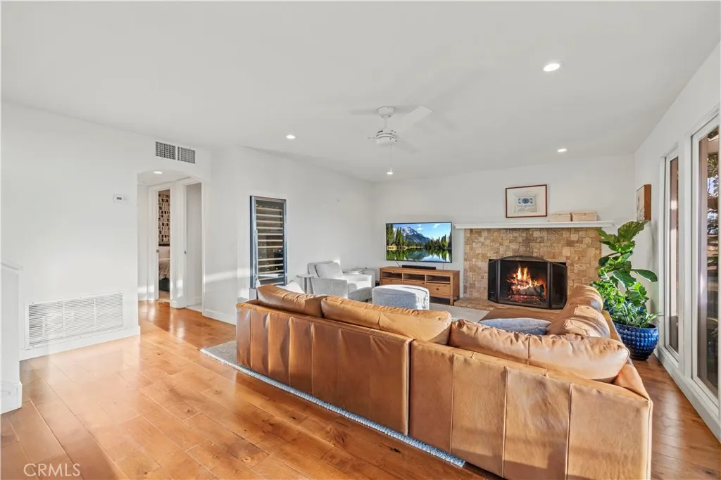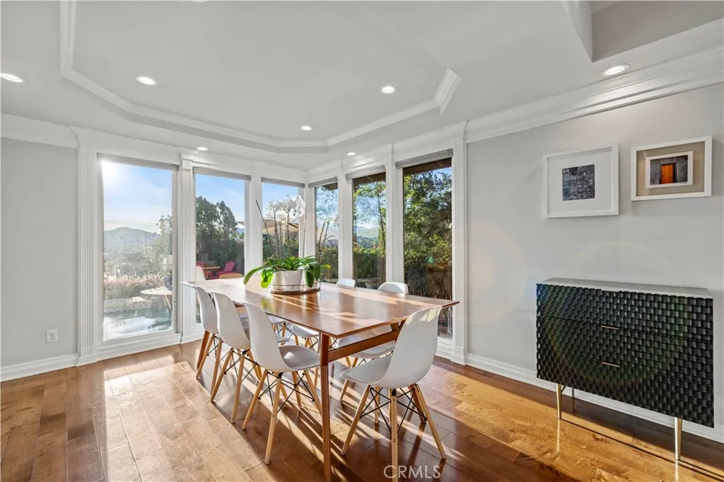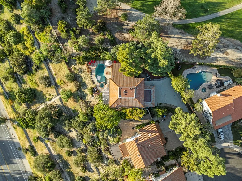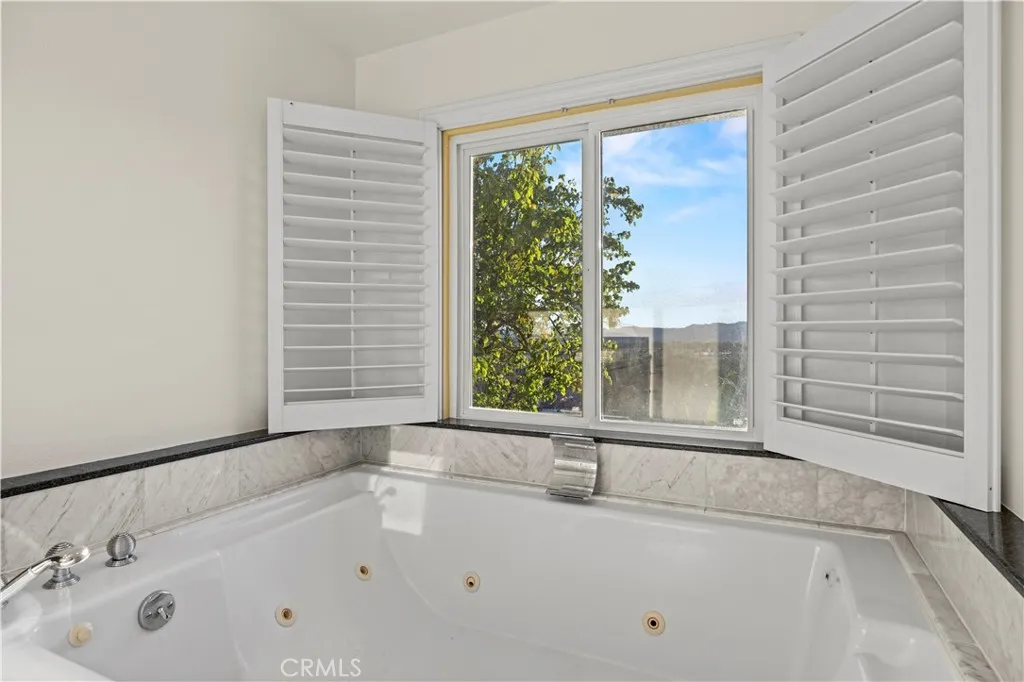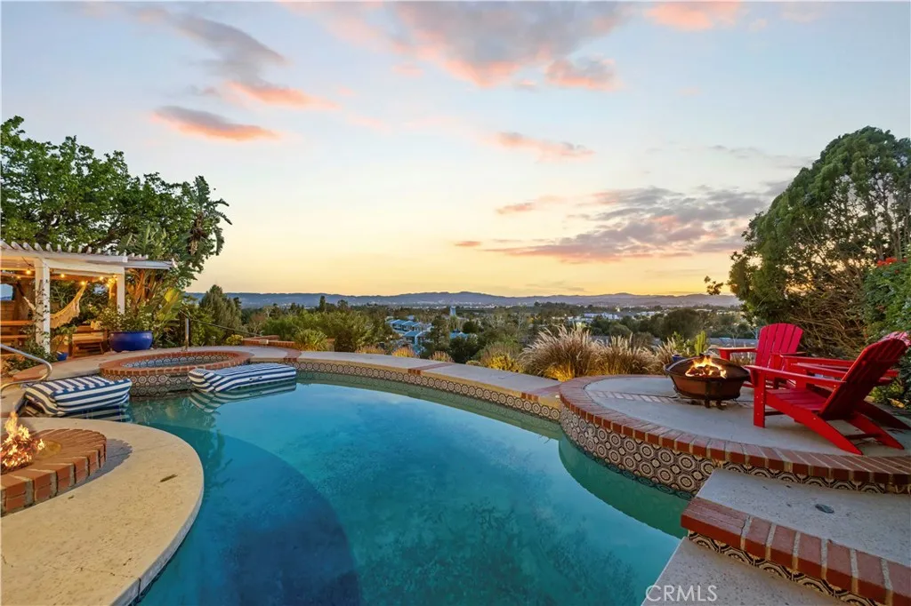 Here's your chance to own this AMAZING SUNSET VIEW HOME located in the hills of the prestigious Porter Ranch Community! Tucked away on a 30,000 sq foot flag-lot and settled next to the Porter Valley Country Club is this Luxurious 4 bed & 3 bath home featuring a split-level design gleaming with hardwood flooring throughout. The grand foyer with soaring high ceilings and chandelier greets you to a spacious living, separate dining room with coffered ceilings and floor to ceiling windows perfect for entertaining guests. The gourmet kitchen is designed with beautiful Quartz countertops, subway tile backsplash, custom cabinetry, high end Wolf range with griddle, double ovens, a built in Sub-Zero refrigerator and a breakfast bar. The family room offers a cozy stone fireplace and a large dual-zoned wine refrigerator perfect for those intimate gatherings. One bedroom located on the 1st floor is perfect for an office or guest bedroom. Three additional bedrooms on the 2nd level include an expansive Primary-Suite that is sure to impress, highlighted by an outdoor balcony, plantation shutters and large walk-in closet. The Primary bath features, jetted soaking tub and a separate steam room/ shower combo. Beyond the family room downstairs are floor to ceiling sliding doors which open up to the Luxury Outdoor living patio. Relax, unwind, or entertain your guests in your backyard featuring magnificent sunset mountain/ city light views, and your own private pool and spa. AN ENTERTAINER'S DREAM! Other features include; attached 2-car garage, laundry room inside, and large front yard for endle