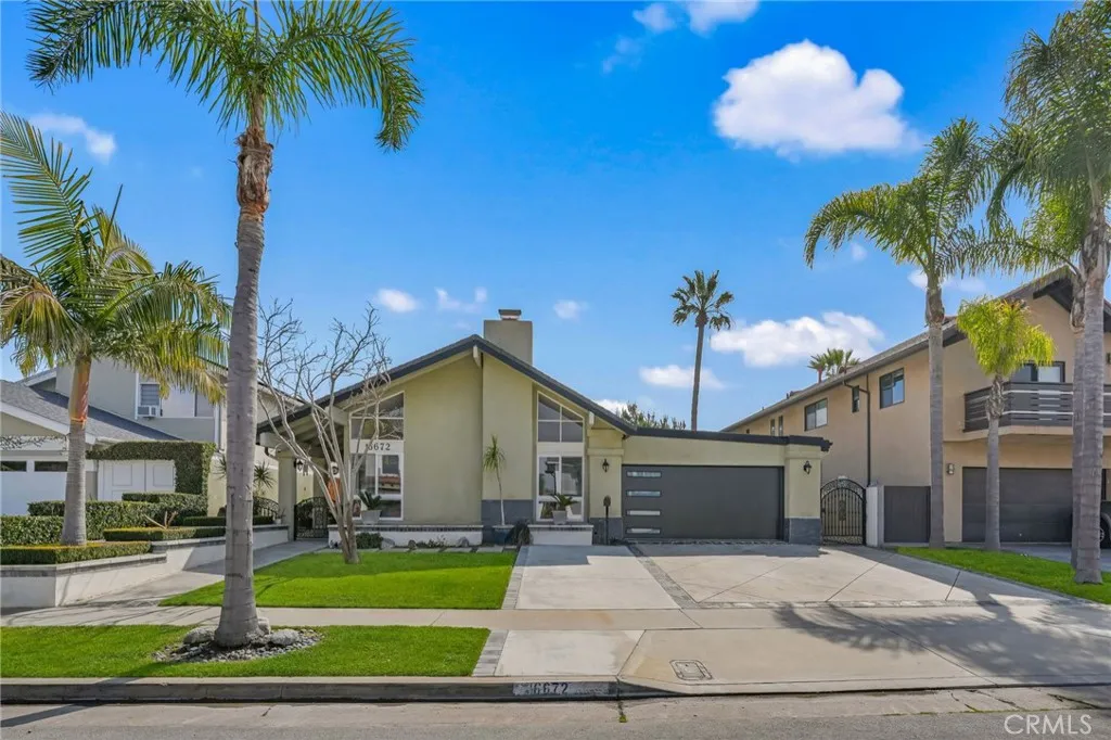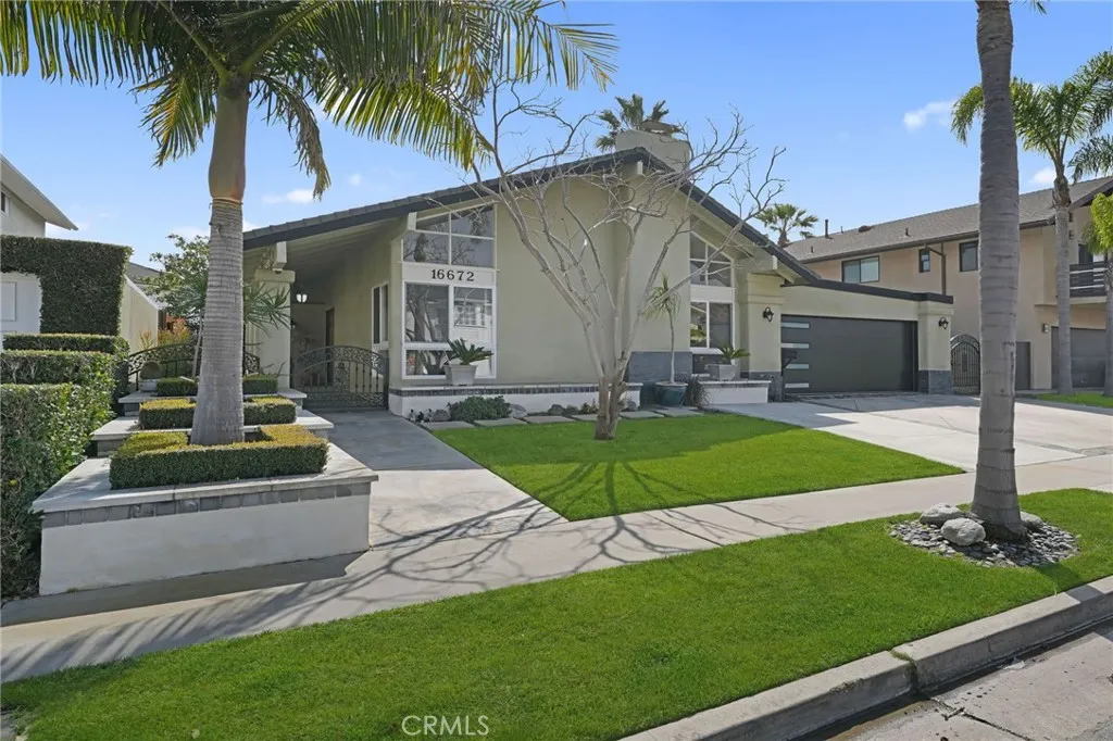 16672 Bolero Lane Davenport Island, Huntington Harbour Curb appeal stands out on this detached single-family home, featuring a light stucco exterior, vaulted rooflines, and a striking front chimney. Additional highlights include a custom garage door, refreshed planter beds, newly finished concrete front and back, and sprinklers front and back. The backyard offers an inviting space for entertaining beneath the charming pergola. Inside, the light-filled living room features soaring cathedral ceilings, a cozy gas fireplace, plush new carpet, and a formal dining area. The kitchen offers granite countertops, abundant oak cabinetry, recessed lighting, and updated appliances. The spacious primary suite boasts vaulted ceilings, a private bath, a generous walk-in closet, and a sliding glass door to the backyard, inviting soft natural light and tranquil ocean breezes. Beautifully updated 3-bedroom, 2-bath single-story home designed for effortless, accessible living. Ramps, wide doorways, and strategically placed grab bars are seamlessly integrated into the floor plan for comfort, safety, and ease of mobility. Set in the highly desirable coastal community of Huntington Harbour, enjoy parks, open green spaces, and easy access to Davenport Beach, plus a boating lifestyle unique to this harbor community. The area is served by well-regarded schools with above-average ratings, and Huntington Harbour Mall is just minutes away for convenient shopping and dining. This home blends modern updates, spacious design, and relaxed coastal comfortall in one exceptional single-story package.