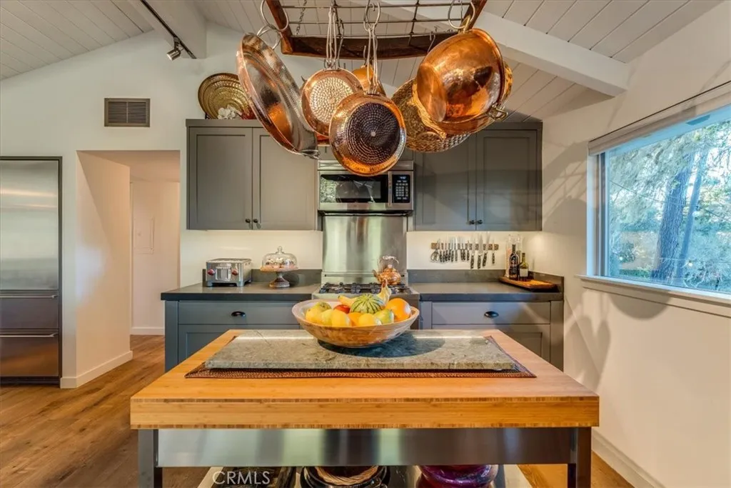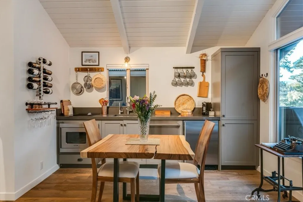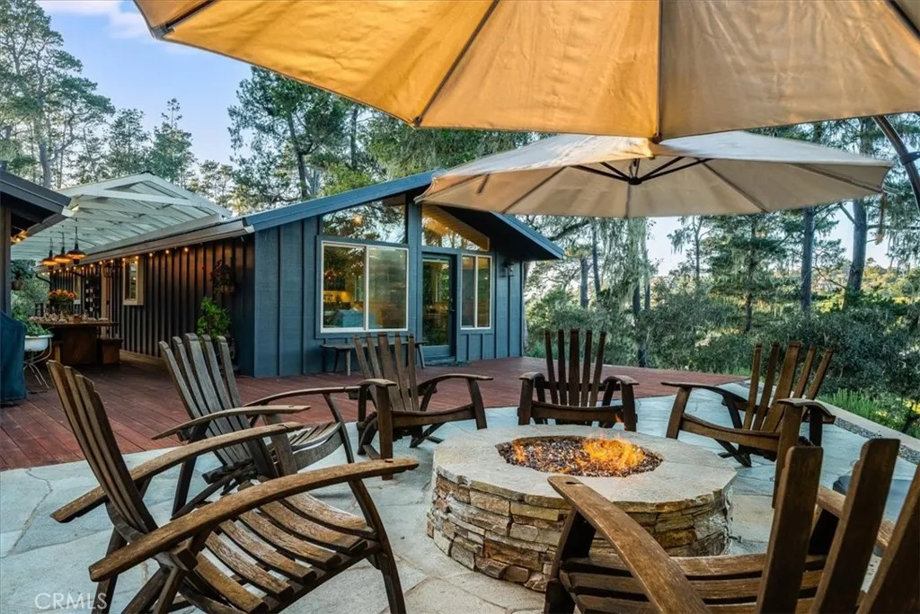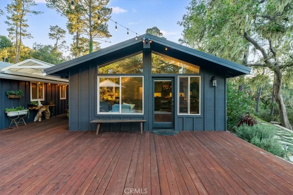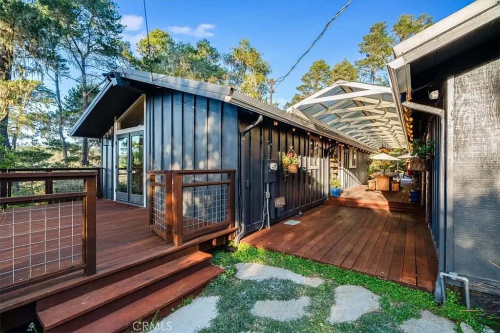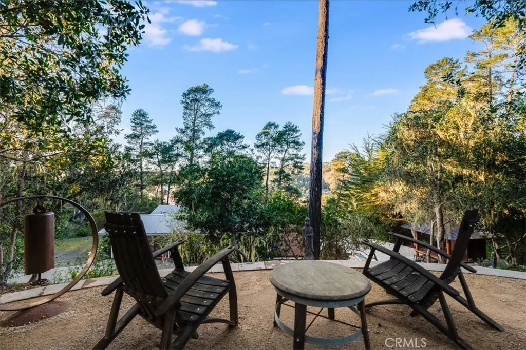 Set on approximately 1.75 acres in the desirable East Village of Cambria, this secluded sanctuary offers privacy, single-level living, and beautifully designed indoor and outdoor spaces. Extensively remodeled inside in 2018 and later enhanced with a thoughtful redesign of the exterior entertaining areas, the property blends comfort, style, and connection to nature. Conveniently located close to town, the Fiscalini Ranch trails, Moonstone Beach, and the Cambria Dog Park, it provides the perfect balance of seclusion and accessibility. The property features two separate homes filled with abundant natural light, a two-car garage, and a light-filled covered breezeway connecting the homes, complete with outdoor heating for year-round enjoyment. Inside both residences are custom-built European kitchen cabinets, high-end European appliances, and quartz countertops. Flooring includes 8-inch plank hardwood throughout the main living areas, tile in the bathrooms, and a heated floor in the primary bathroom for added comfort. Additional amenities include a durable metal roof, dimmer switches throughout, a reverse osmosis system, soft water system, and a natural gas barbecue line for easy outdoor grilling. The grounds have been thoughtfully improved with new retaining walls, stonework, and French drains designed to handle heavy rains, allowing the property to remain well-drained even during the strongest storms. Adding a unique artistic element, the property features beautiful mosaics by local artist Leslie McKenna. One mosaic depicts the seven chakras, two celebrate the wildlife and nat
