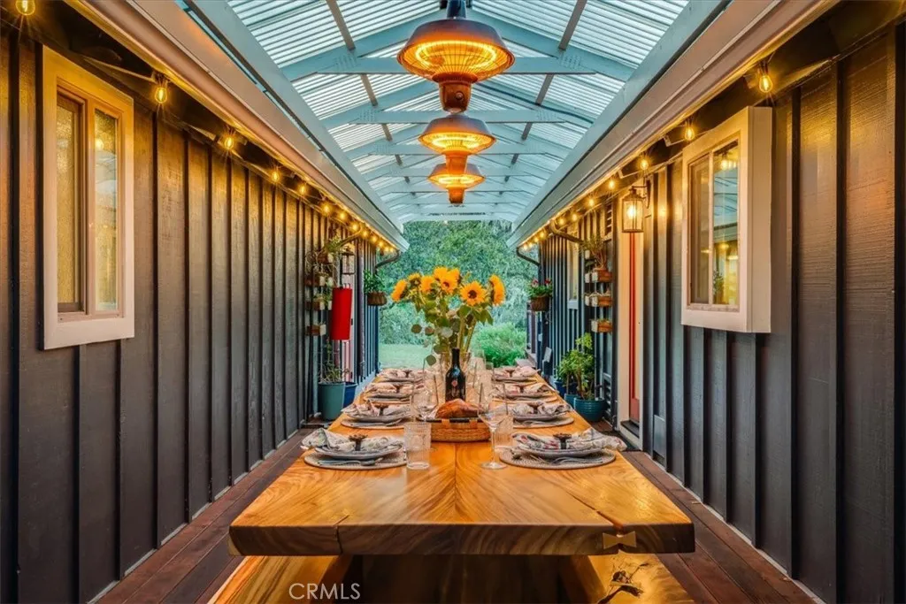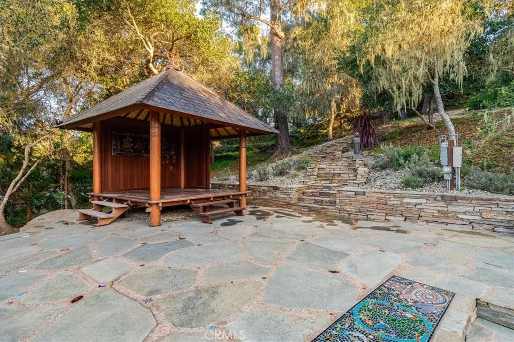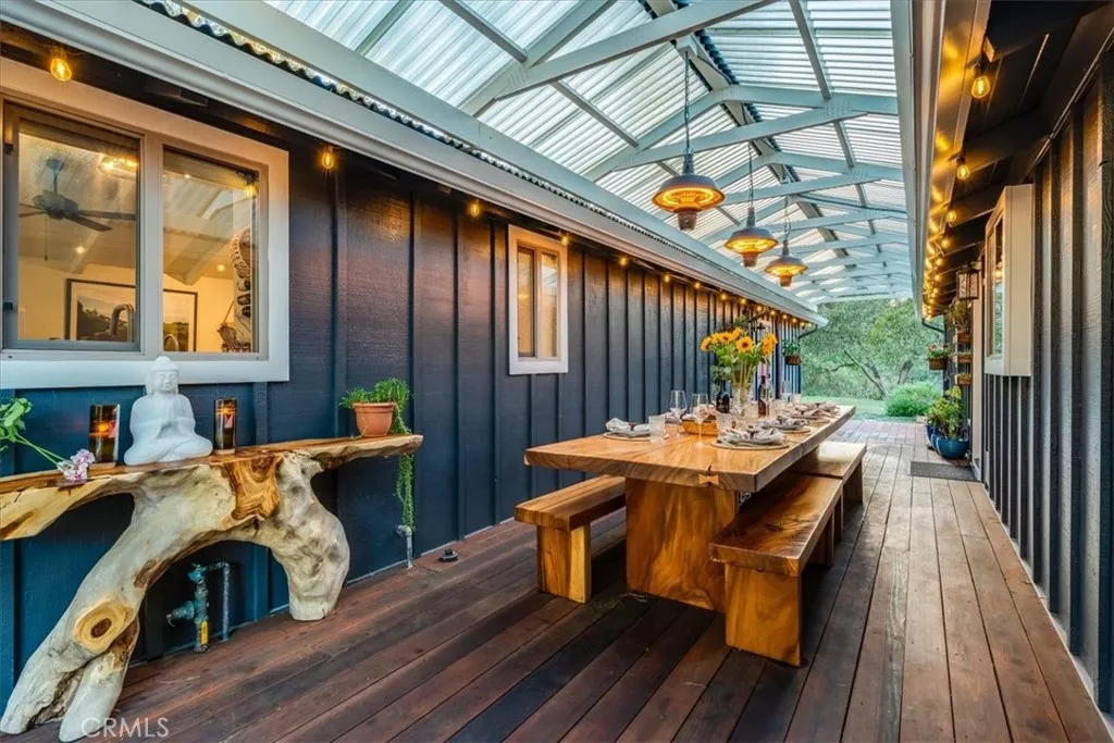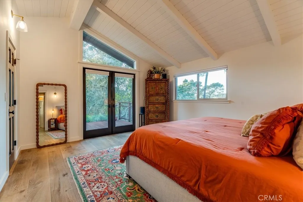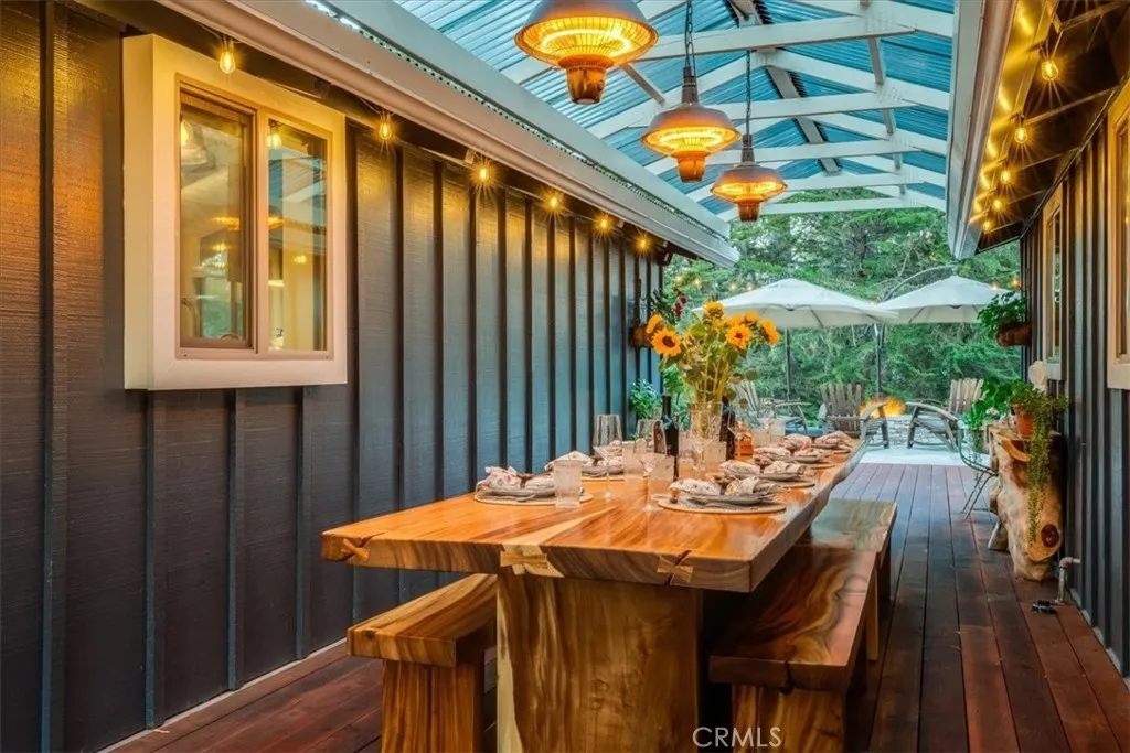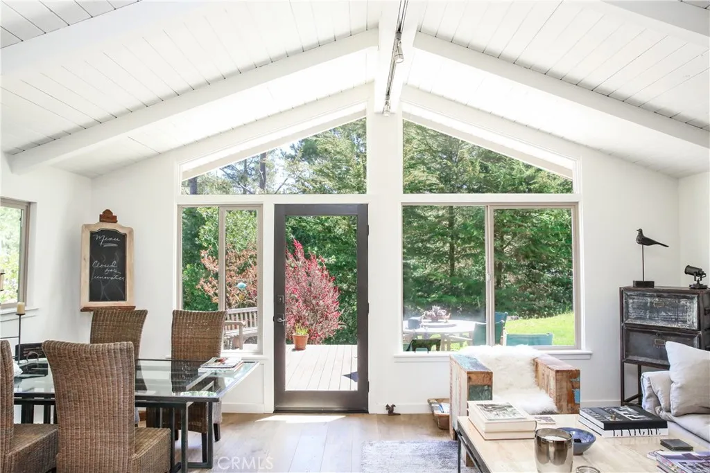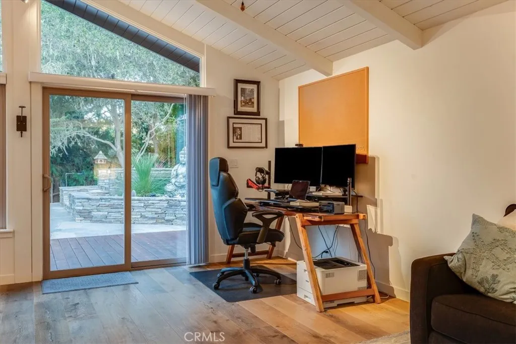 Set on approximately 1.75 acres in the desirable East Village of Cambria, this secluded sanctuary offers privacy, single-level living, and beautifully designed indoor and outdoor spaces. Extensively remodeled inside in 2018 and later enhanced with a thoughtful redesign of the exterior entertaining areas, the property blends comfort, style, and connection to nature. Conveniently located close to town, the Fiscalini Ranch trails, Moonstone Beach, and the Cambria Dog Park, it provides the perfect balance of seclusion and accessibility. The property features two separate homes filled with abundant natural light, a two-car garage, and a light-filled covered breezeway connecting the homes, complete with outdoor heating for year-round enjoyment. Inside both residences are custom-built European kitchen cabinets, high-end European appliances, and quartz countertops. Flooring includes 8-inch plank hardwood throughout the main living areas, tile in the bathrooms, and a heated floor in the primary bathroom for added comfort. Additional amenities include a durable metal roof, dimmer switches throughout, a reverse osmosis system, soft water system, and a natural gas barbecue line for easy outdoor grilling. The grounds have been thoughtfully improved with new retaining walls, stonework, and French drains designed to handle heavy rains, allowing the property to remain well-drained even during the strongest storms. Adding a unique artistic element, the property features beautiful mosaics by local artist Leslie McKenna. One mosaic depicts the seven chakras, two celebrate the wildlife and nat