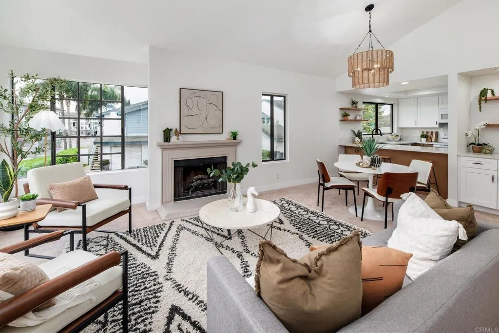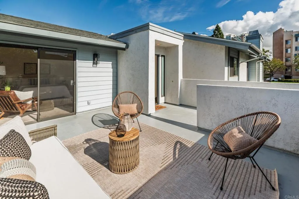 Tucked within the highly sought-after La Jolla Village Park community, this beautifully refreshed end-unit residence offers an exceptional blend of privacy, natural light, and outdoor living. With only one shared wall and no neighbors above, the home lives peacefully while remaining just moments from the best of La Jolla and University City. Vaulted ceilings and expansive windows fill the home with natural light, creating an airy, welcoming atmosphere throughout. A thoughtfully redesigned kitchen, completed in December 2025, serves as the heart of the home with timeless shaker cabinetry, quartz countertops, new appliances, and a raised ceiling with modern can lighting that enhances both style and functionality. Recent updates continue throughout the home, including refreshed primary and guest bathrooms with quartz countertops, updated fixtures, and painted cabinetry. The main living areas feature updated flooring, while brand-new plush carpeting creates comfortable and inviting retreats. Fresh interior paint, updated lighting, and new vanity countertops, hardware and mirrors complete the move-in-ready feel. One of the homes most standout features is its exceptional outdoor living. Two private patios surrounded by greenery offer abundant sunshine and the largest private outdoor space in the community, perfect for morning coffee, hosting friends, or simply unwinding at the end of the day. Additional highlights include spacious bedrooms, a private one-car garage with storage located conveniently at the base of the stairs, and an additional parking space. Residents of La Jolla