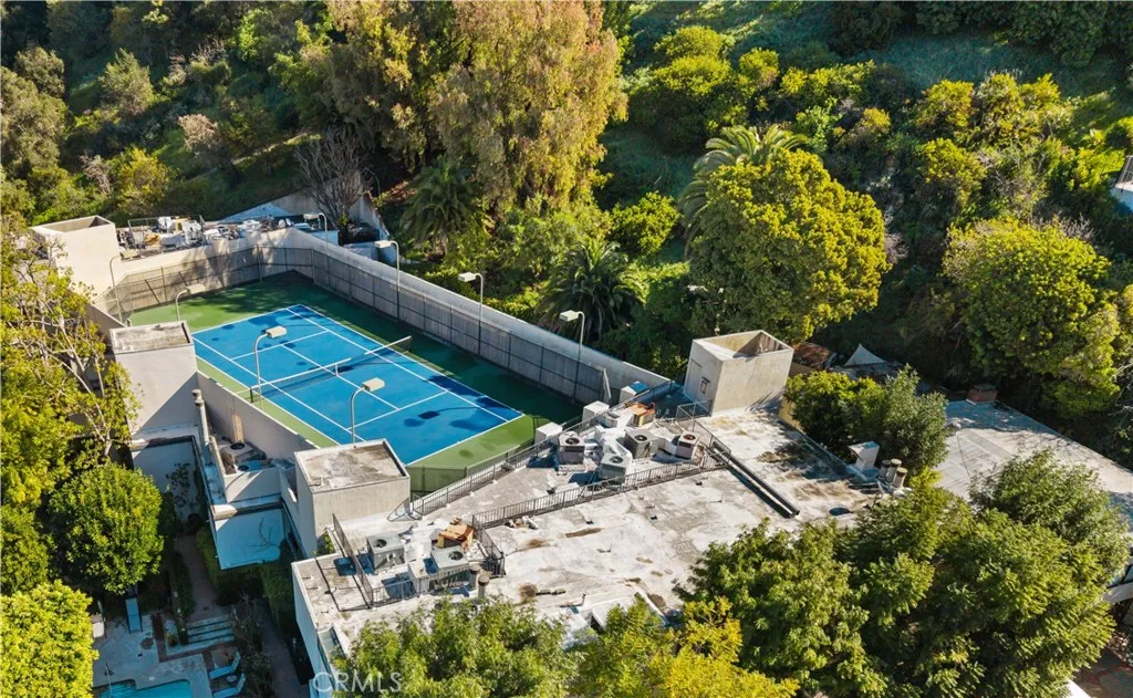 Rarely available within Bel Air Courtside, an intimate 16-residence enclave tucked into the hillside of Bel Air and surrounded by multi-million dollar homes and views of the Getty! This expansive residence offers almost 2,300 sq.ft. of single-level living and 300+ sq.ft. of outdoor living, totaling almost 2,600 sq.ft. of indoor/outdoor entertaining! Semi-private elevator opens directly to your entry landing, shared with only one neighboring residence, creating a sense of privacy and exclusivity. The great room, anchored by a fireplace and generous seating hearth, flows into the formal dining area and out to the front balcony through corner-positioned sliding glass doors. Floorplan offers flexibility to re-imagine or expand functionality over time (buyer to verify). A built-in bar with sink connects the living areas to the kitchen, allowing easy entertaining. The kitchen includes breakfast bar seating, buffet counter, dual ovens, refrigerator, granite countertops, stainless hood, GE Profile cooktop, and coffered ceiling. Adjacent multi-purpose nook with a built-in desk offers flexible space for a home office, creative studio, or additional living space. Private hallway, lined with plenty of storage closets and cabinetry, separates the third guest bathroom and the bedroom suites that open directly to the rear balcony overlooking the Bel Air hillside. Primary suite offers double-door entry, high ceilings with skylights, walk-in closet plus additional closet, spa-inspired bath with oversized jetted soaking tub, dual sinks with seated vanity, separate shower area, and private wa