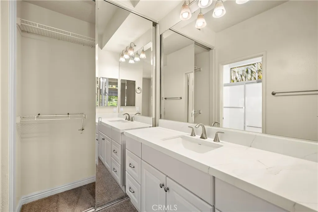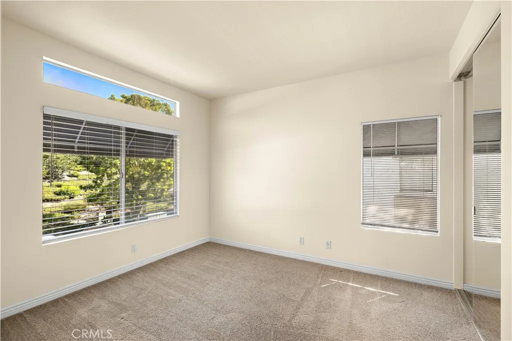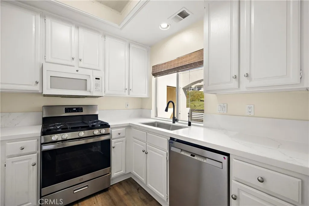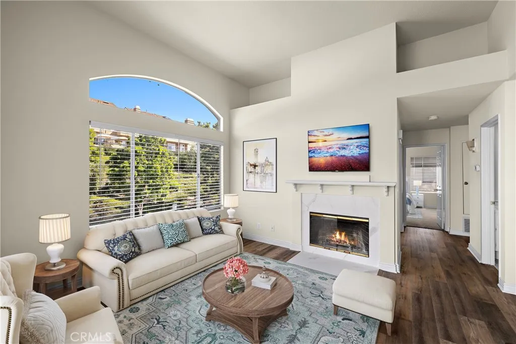 Newly refurbished Mirador upper-level condo with no upstairs neighbor. Bright and cheerful with lots of natural light. Luxury plank vinyl flooring in living room, kitchen, dining area and hallway. Carpet in bedrooms. Living room with fireplace, Adjacent dining area with new fan light. Kitchen with new quartz counter tops and new ranch style sink, gas range, microwave and dishwasher. Neutral decor throughout. Both bathrooms have new quartz counter tops and sinks, and both have new toilets as well. Spacious master bedroom has 2 closets with mirrored closet doors. The second bedroom has a wardrobe closet, double entry doors and could make an ideal office space as well. The home has central heating and AC. The private front balcony features a storage closet and lattice gate. Parking is a reserved carport #193 and features a large closet for storage of trash container. HOA fees include water and trash. The Mirador community features its own pool and spa and the property is also included in the Rancho Niguel Master Association with many additional amenities. The location of the property is ideal with easy access to the 73 Toll Road, Shopping, restaurants, theaters. Walking distance to an elementary school.