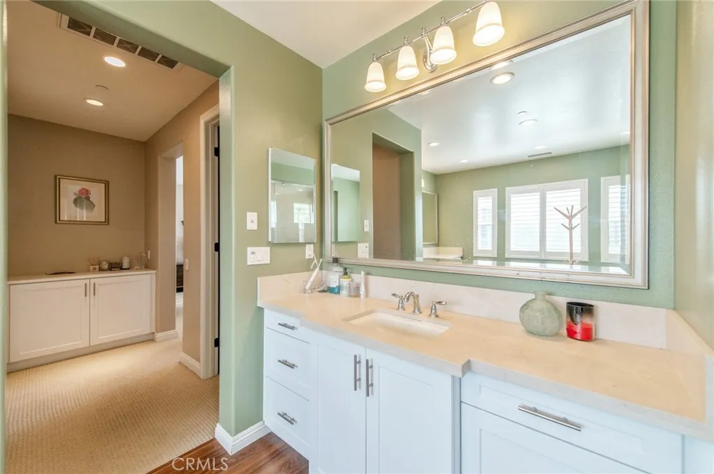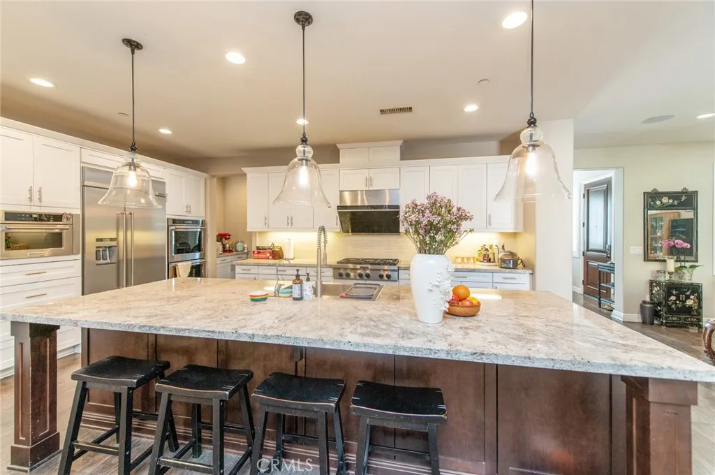 Welcome to modern luxury and versatile living in the highly sought-after Greenwood Community. This expansive residence captivates with a sun-drenched open floor plan designed for daily living and entertaining. The home is further elevated by custom plantation-style shutters throughout, offering a clean, modern aesthetic while enhancing privacy, light control, and long-term durability. The heart of the home is a true chefs kitchen, appointed with professional stainless steel appliances, rich espresso cabinetry, and exquisite Bianca Romano granite countertops. Seamlessly flowing from the great room, spectacular panoramic doors open to a covered outdoor space, blurring the lines between indoors and out to create the ultimate Southern California retreat. Step outside to a private, well-maintained backyard oasis designed for entertaining. This beautiful, low-maintenance courtyard features elegant stone tile hardscaping and is equipped for cookouts with a built-in barbecue island, stacked-stone detailing, and a custom wood pergola. Accentuated by fruit trees and tasteful landscaping, this serene space offers a sophisticated aesthetic without extensive upkeep. A highly desirable feature of this property is the flexible guest suite layout, including its own living area, kitchenette, private bedroom, and bathroom, making the home perfect for multi-generational living or accommodating guests with ease. Upstairs, the lavish primary suite serves as a tranquil sanctuary. Reflecting the premium upgrades found throughout the entire residence, the spa-inspired en-suite bath showcases high-