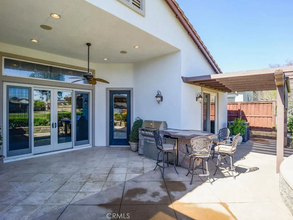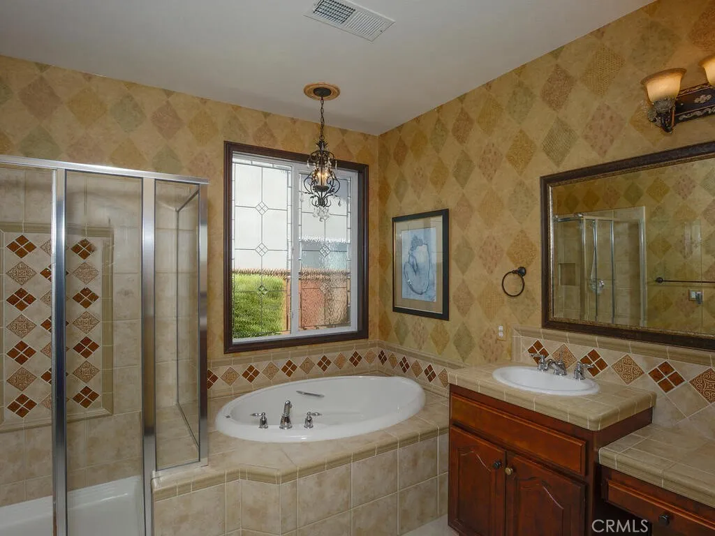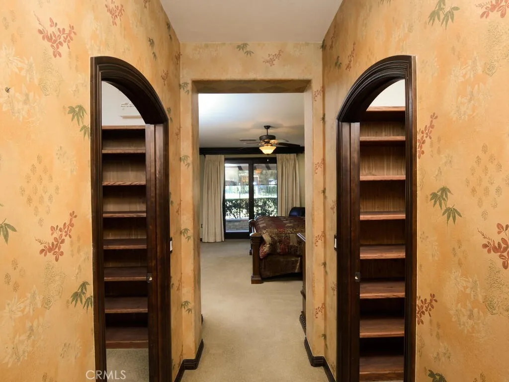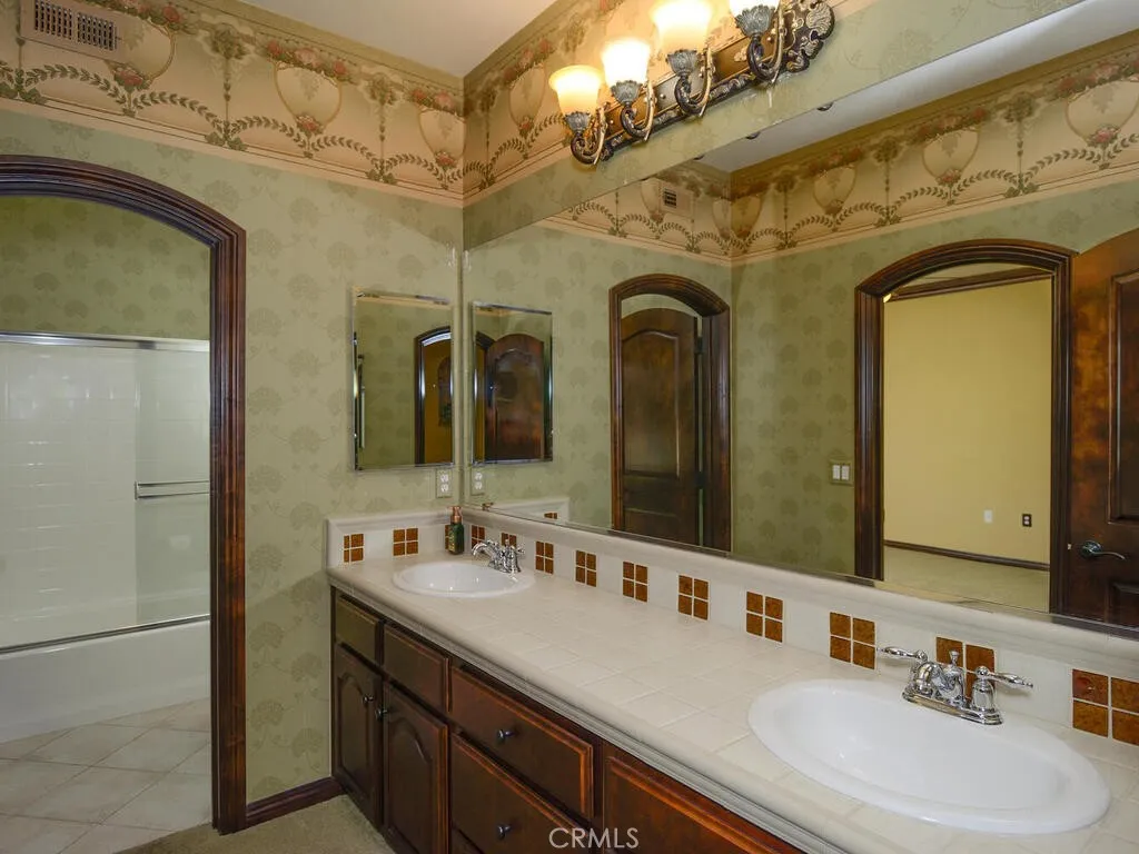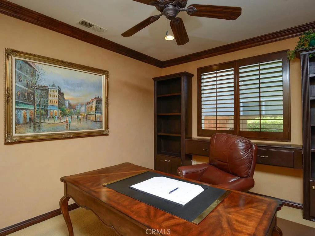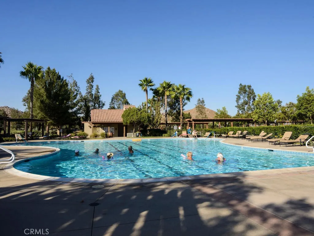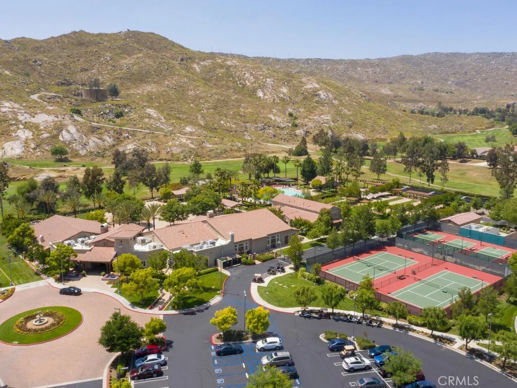 Championship Plan 3, the largest plan in the community, which has 3 bedrooms, and 3 bathrooms, plus an office, in 2755 square feet. The home is located in the highly sought after Four Seasons of Hemet, with view of the 13th tee box right outside the rear patio. This home has been highly upgraded in so many ways, but to list just a few designer touches, all the woodwork has been replaced with rich dark wood, the doors are all arched to add to the theme of an Italian Tuscan villa, all cabinets, and many built ins are designer grade. The tile flooring has several designs from the foyer through the living room to the huge French doors out to the back patio. Notice the coffered ceilings The primary bedroom closets are oversized and have thoughtfully designed closet organizers installed, and there is a jetted spa tub to relax away all your worries. In addition to all this, there is PAID OFF SOLAR. Be sure to tour The Lodge, and experience the amenities, which include The Bistro, onsite restaurant with sit down service, billiards, movie theater, library, craft room and game rooms. The huge ballroom is always busy getting ready for the next program being held there...Banquets, bingo, live productions, dancing and much more. Outside the Lodge, we find the open patio area, offering concerts and summer programs, the pool with exercise classes or lap swimming, the gym building with hair salon. Behind the gym building, you find the shuffleboard, bocce ball, tennis and pickleball.