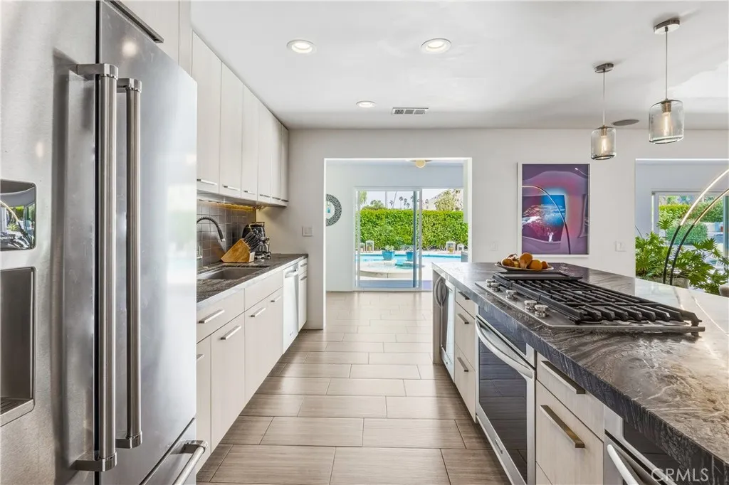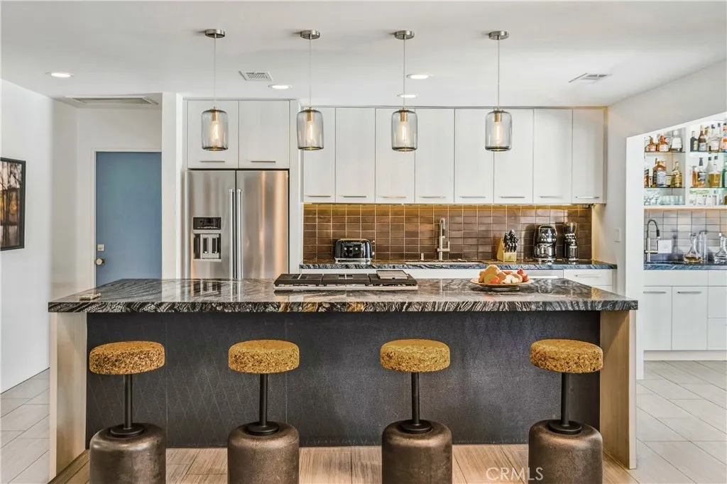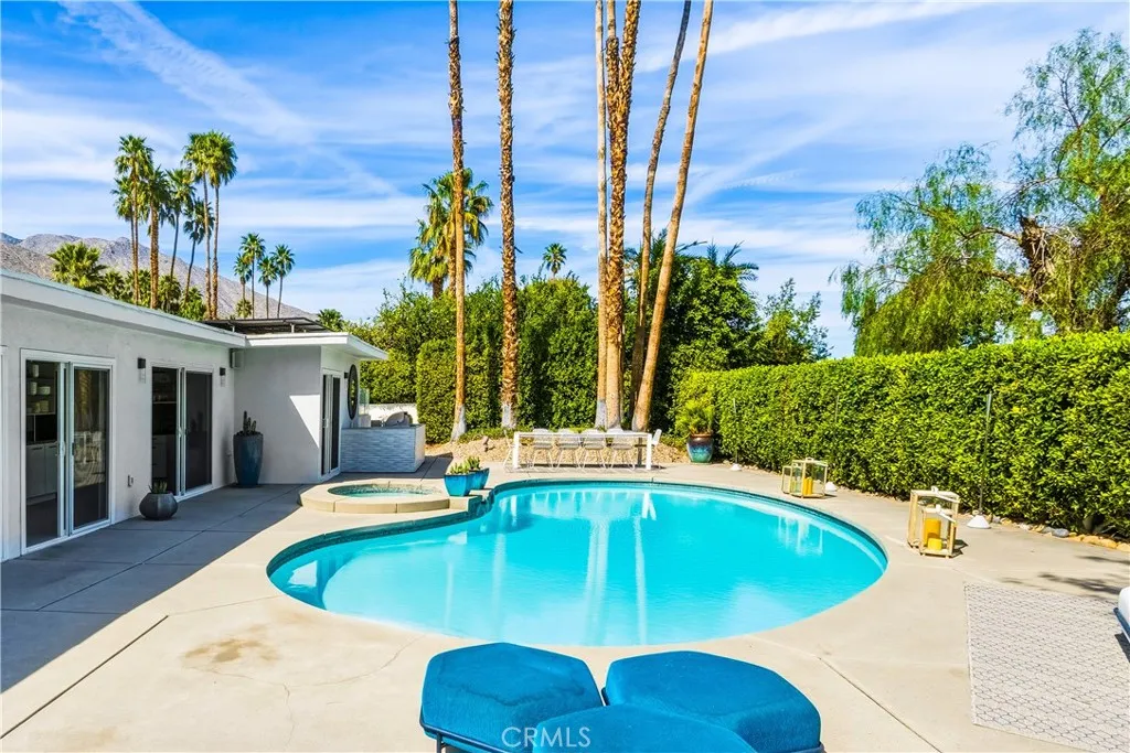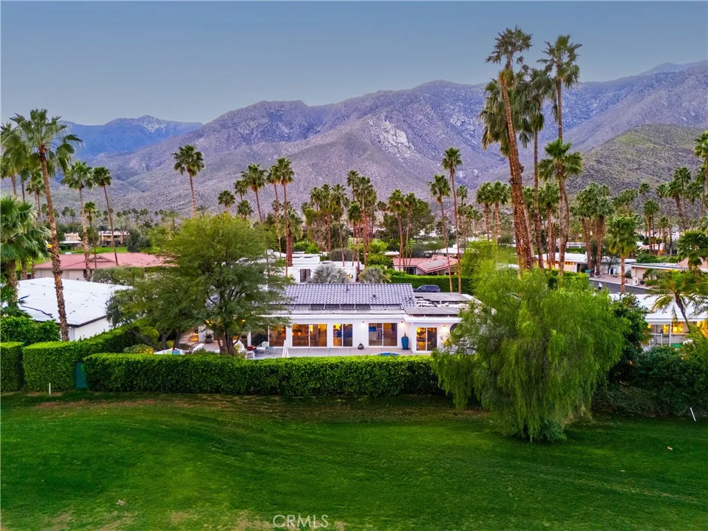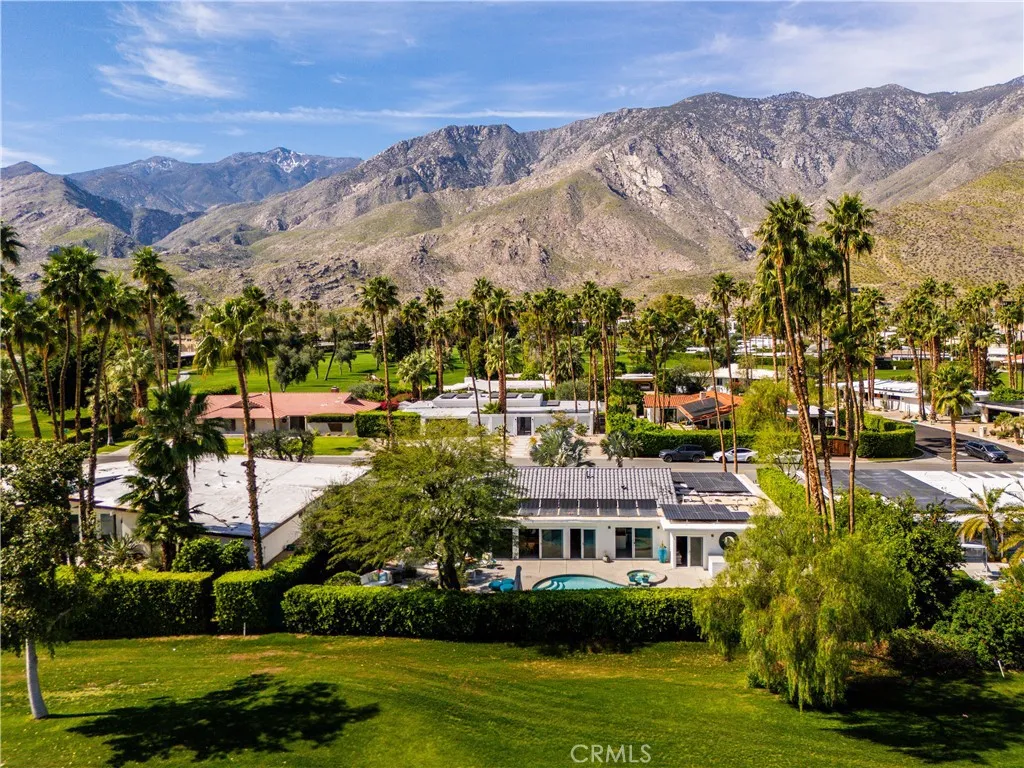 LOW LAND LEASE $5,796.12 ANNUALLY. This stunning **mid-century designer home** in the coveted Indian Canyons neighborhood of Palm Springs and backs up to the prestigious Indian Canyons Golf Resort, perfectly positioned along the 2nd fairway of the North Course for exceptional privacy and scenic golf course views. Guests are welcomed through an Albert Freyinspired concrete and stone entry with portico, where floor-to-ceiling glass floods the home with natural light and creates a seamless indoor-outdoor connection. Inside, the thoughtfully designed interior features smooth-texture drywall, frameless solid-core doors, and sleek Intek door hardware, creating a refined and modern aesthetic throughout. The gourmet kitchen showcases striking black Nike marble countertops, European-style cabinetry, and all stainless steel appliances, complemented by a spacious butlers pantry for added storage and prep space. A stylish wet bar enhances the homes entertaining appeal. Luxurious finishes elevate every space. 3D ceramic tile from Ukraine accents the front entry and select bedrooms, while premium Ann Sacks tile highlights the bathrooms. The primary suite bathroom offers illuminated LED mirrors and breathtaking views of the snow-capped San Gorgonio Mountains. Designed for both relaxation and entertainment, the home features Polk Audio ceiling speakers throughout, with pre-wiring for a 9.2 theater audio system, as well as outdoor and primary bedroom speakers. A spacious laundry room/pantry with skylight brings additional natural light into the home. Step outside to a private resort-style b