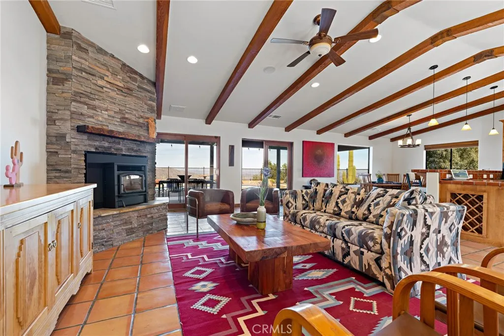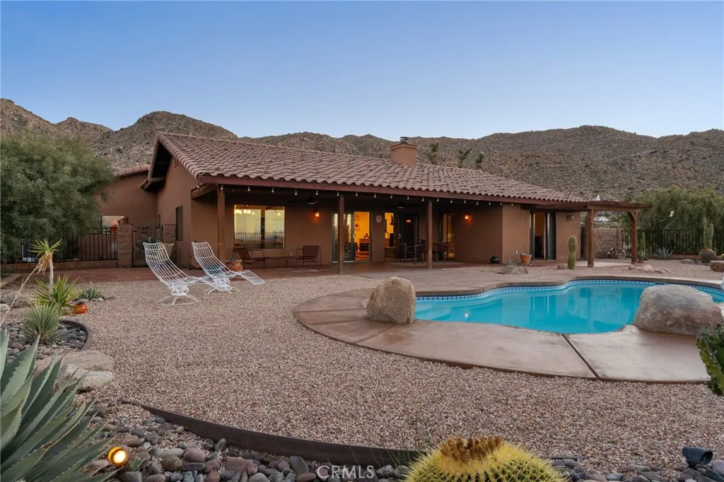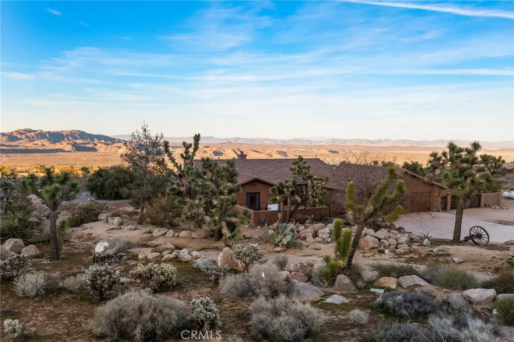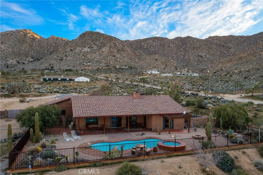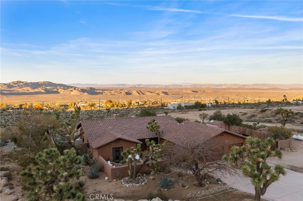 Welcome to a true desert masterpiece in the highly coveted Upper Friendly Hills of Joshua Tree. This stunning 2007 Santa Fe-style home offers 3 bedrooms, 2 bathrooms, and 1,735 square feet of thoughtfully designed living space, perfectly situated on 2.24 acres of pristine High Desert landscape. From the moment you arrive, mature landscaping and iconic Joshua Trees frame the property, while saguaro cacti and curated garden spaces create a setting that feels both intentional and inspiring. Inside, Spanish tile flows throughout the home, complemented by exposed beams, a warm fireplace in the living room, and an effortless feng shui that makes the space feel balanced and inviting. The kitchen offers generous prep space and seamless indoor dining and entertaining areas designed for gathering. The layout is ideal, with two guest bedrooms positioned toward the front of the home, while the primary suite enjoys privacy and direct access to the backyard oasis. Step outside to a breathtaking pool and hot tub overlooking the valleyarguably some of the best views in all of Joshua Tree. Whether you're entertaining on the expansive front porch, hosting sunset dinners out back, or relaxing under the desert sky, every angle of this property is designed to impress. The three-car garage offers flexibility, with the two-car portion currently converted into an art or music studio, easily convertible back if desired. Paid solar adds efficiency and long-term value. Located just minutes from the West Entrance of Joshua Tree National Park, this is more than a homeits a classical work of art set aga