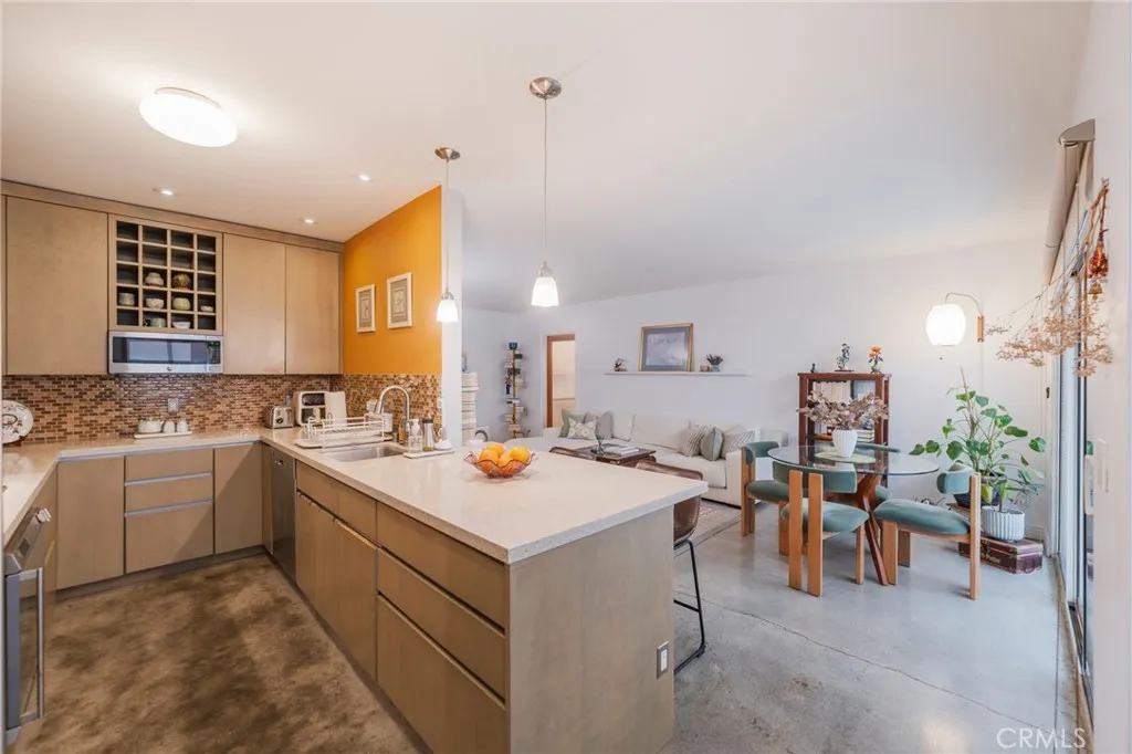 Live in this modern, upgraded and oversized 1 bedroom, 1 1/2 bathroom condo located only a few blocks from the beach, bike path, restaurants and shops. The European-style kitchen remodel is a chefs dream with terrazzo counter tops, Sub-Zero refrigerator, Miele electric range, Gaggenau convection oven, Bosch dishwasher, custom cabinets with thoughtful built-in features and recessed lighting. The condo's main living, kitchen and dining areas have polished concrete floors and double-paned sliding glass doors that take you out to the oversized balcony, perfect for your morning coffee and entertaining friends. This ground floor unit is quiet with double paned windows throughout and only one shared common wall. Bamboo flooring covers the hallway, the huge bedroom and walk-in closet floor. The primary bathroom is spacious and remodeled featuring a full bath and a separate shower, new quartz countertop and tile floor. The rare extra half bathroom has stone flooring and is perfect for guests. The well-maintained mid-century era 32-unit condo building offers a shared rooftop sundeck with ocean and mountain views. The condo also comes with a storage locker and assigned parking in the gated subterranean parking garage. It is one of the only units in the building with a pre-installed 240v outlet ready for EV charging. Water and trash are included in the low monthly HOA dues.
