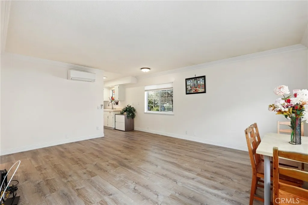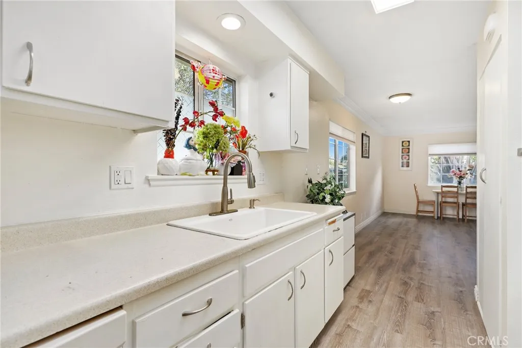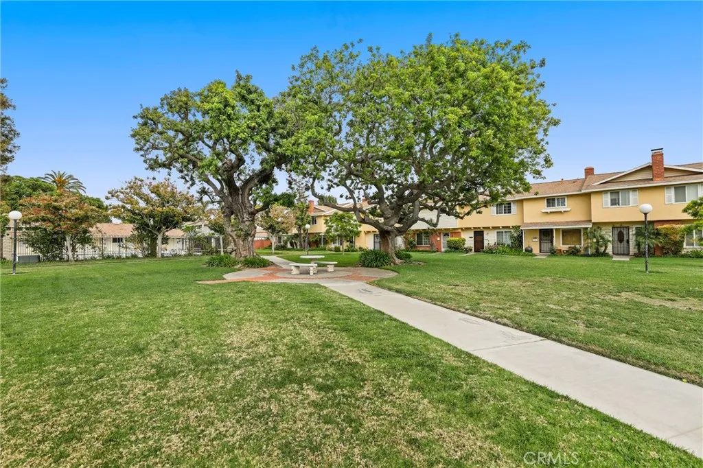 Welcome to this beautifully maintained single story townhouse located in the desirable Harbor Valley community of Fountain Valley. This rare end unit offers privacy, natural light, and a peaceful setting with views of the community's open green space, pool area, and sport courts. The home features a comfortable and efficient floorplan with one bedroom and one bathroom, designed with an open layout that connects the kitchen and living area for an inviting living space. The galley style kitchen includes laminate countertops and ample cabinet storage while remaining open to the main living area, making it ideal for everyday living and entertaining. Recent improvements include new hard surface flooring throughout the interior, creating a clean and modern feel from the moment you enter. The bathroom has been thoughtfully updated and features a stunning walk in shower with stylish finishes. The home is also equipped with a newer split system HVAC providing both heating and cooling for year round comfort, along with a newer upgraded electrical panel. The private patio offers a versatile outdoor space and includes a large storage shed that can serve as additional storage, a hobby room, craft space, or small workshop. From the patio you have direct access to the two-car garage, which includes laundry hookups and plenty of room for parking and storage. This desirable end unit location provides beautiful views of the expansive community open space and recreation areas. Harbor Valley is a well established and well maintained community with mature landscaping, plenty of guest parking, a