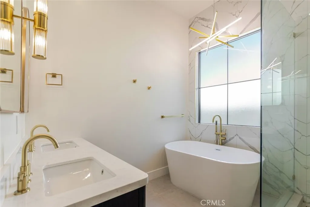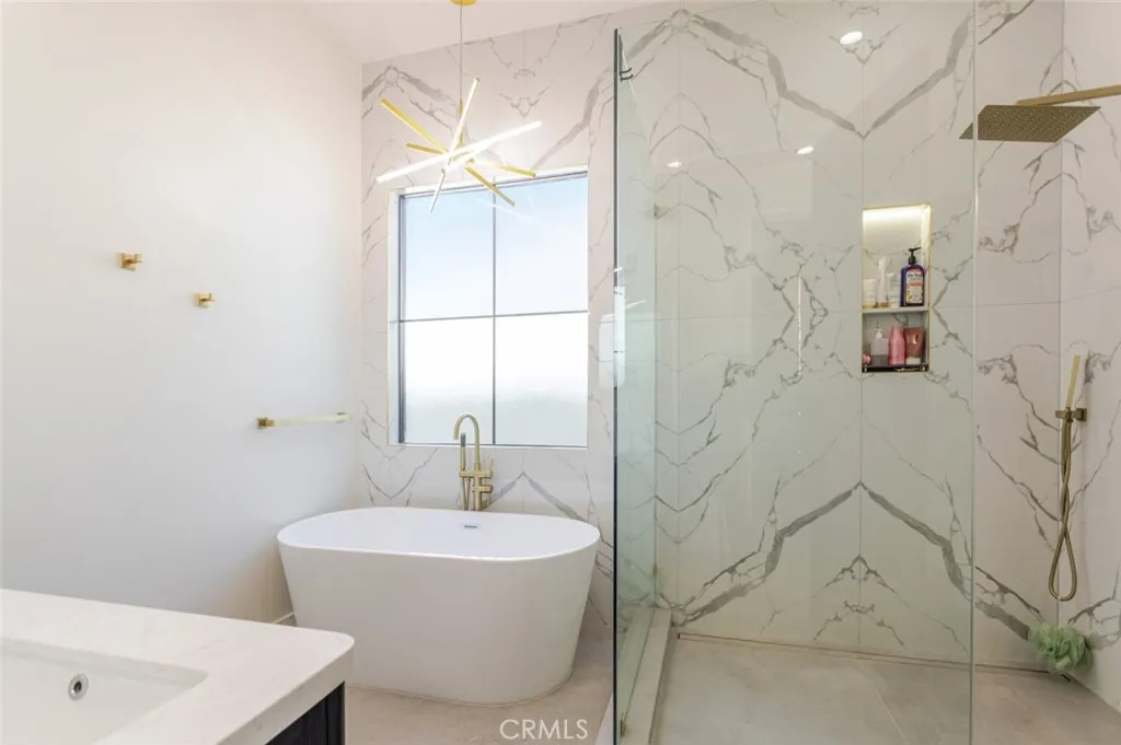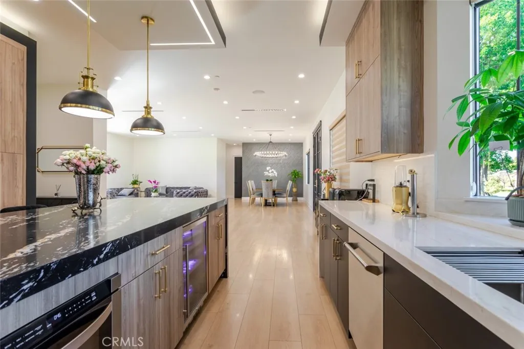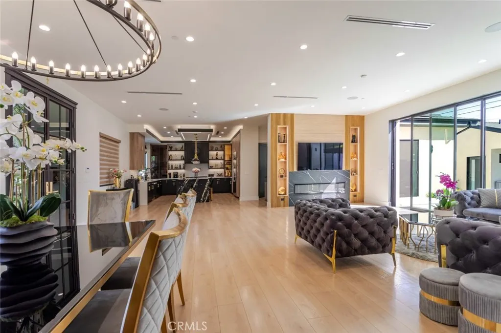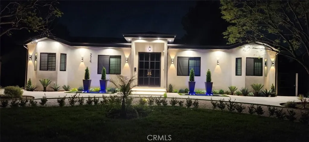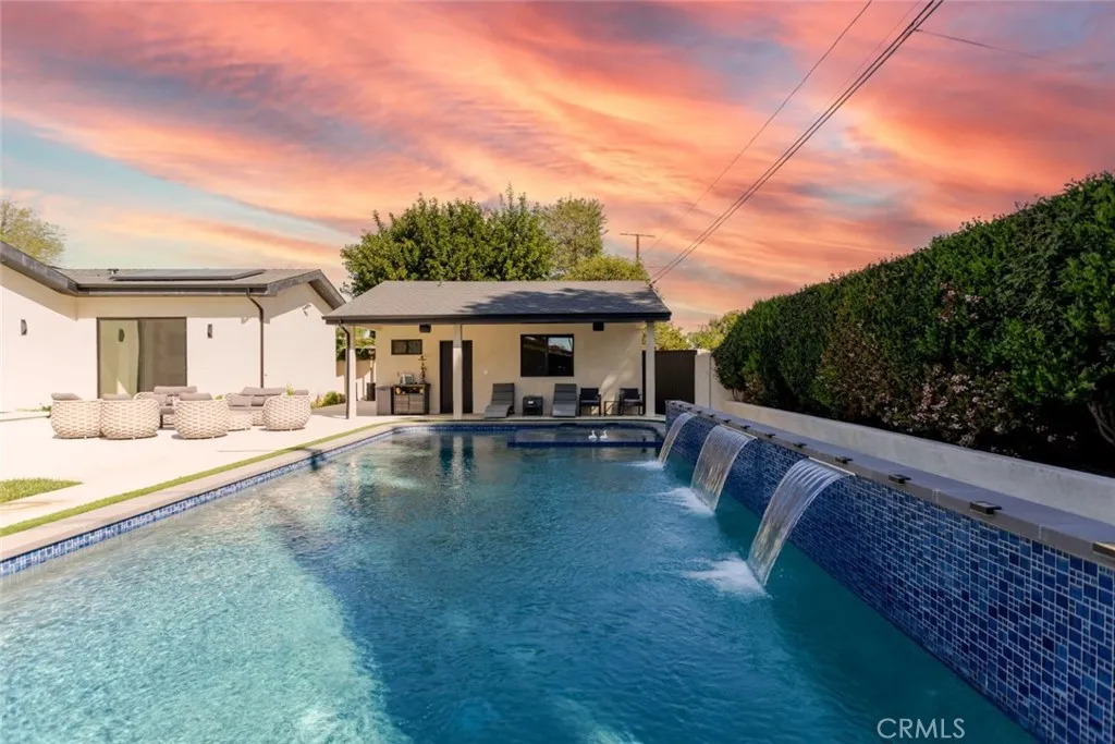 Discover refined luxury living in this newly rebuilt home located in Northridge. Thoughtfully designed with modern elegance, this stunning residence offers 3 bedrooms, 4 bathrooms, and approximately 2,267 sq ft of beautifully crafted living space. The interior showcases soaring high ceilings, recessed lighting, and a stylish fireplace that creates a warm yet sophisticated atmosphere. The brand-new gourmet kitchen is designed for both everyday living and entertaining, featuring top-of-the-line appliances, sleek quartz countertops, and contemporary finishes. The outdoor space is a true private oasis, complete with a sparkling pool and spa, ideal for relaxing or hosting gatherings. Lush surroundings and a serene setting create a resort-style experience right at home. Additional highlights include a detached two-car garage, energy-efficient solar panels, and an elegant circular driveway providing convenient drive-in and drive-out access while enhancing the home's impressive curb appeal.