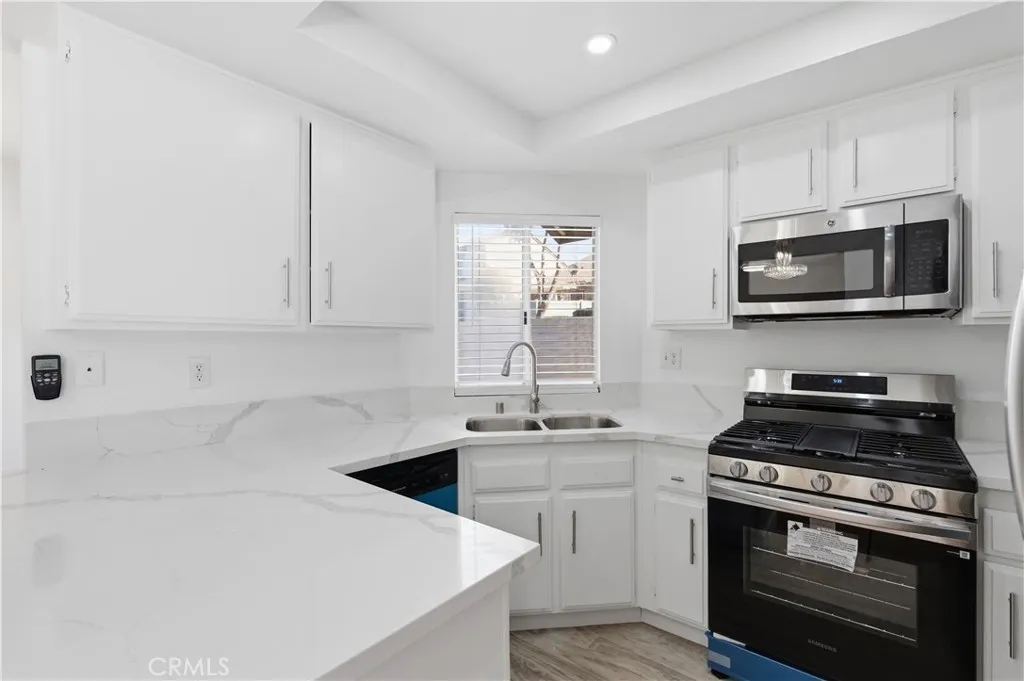 Beautifully upgraded single-story corner townhome-style condo featuring 2 bedrooms, 2 bathrooms, and approximately 1,027 sq. ft. of living space. This bright home offers an open floorplan with soaring high ceilings in the living and dining areas, highlighted by an elegant crystal chandelier. The entire home was completely renovated just last month and has not been lived in since the modern, stylish renovation, making it feel like a brand-new home. Upgrades include a brand-new kitchen, newly remodeled bathrooms, and new flooring throughouttruly no expense spared in the renovation process. Additional features include an attached 1-car garage (approx. 217 sq. ft.) with a brand-new garage door and new automatic opener, plus all appliances included for added convenience. Enjoy a private south-facing backyard filled with natural sunlight, offering a cozy sitting area and flower beds ready for your personal gardening touch. Located in a desirable community with pool, spa, and greenbelts, this home is close to the 91 and 15 freeways and conveniently situated about 30 minutes from Irvine, the beaches, Ontario International Airport, John Wayne Airport, and Orange County. Dont miss this rare opportunity to own a beautifully renovated corner townhome in a prime location. ???
