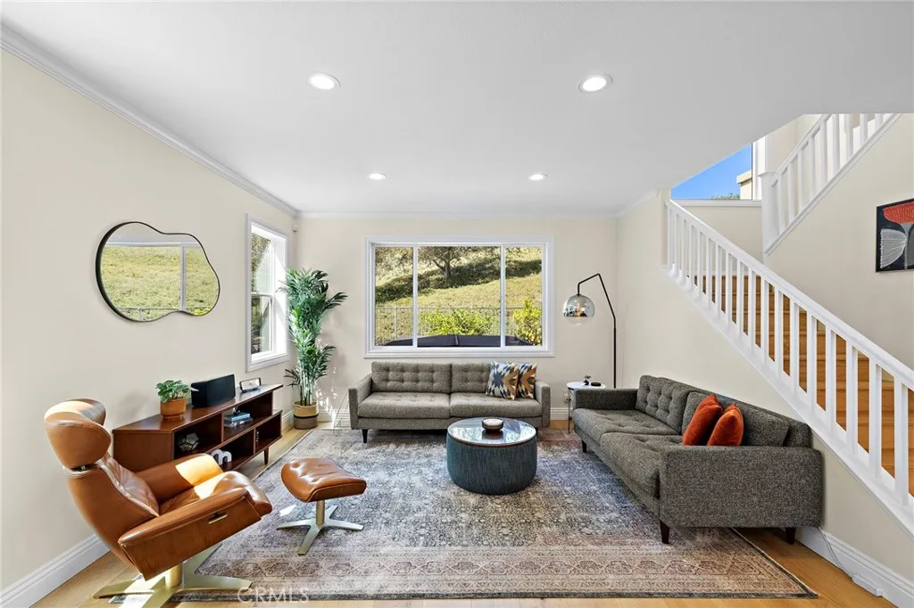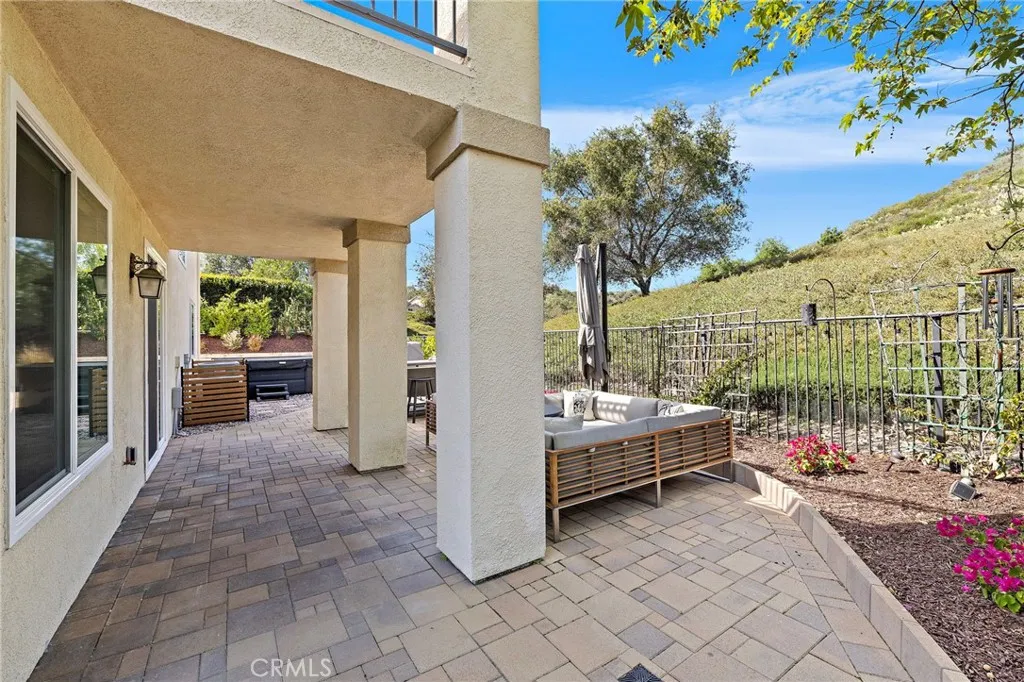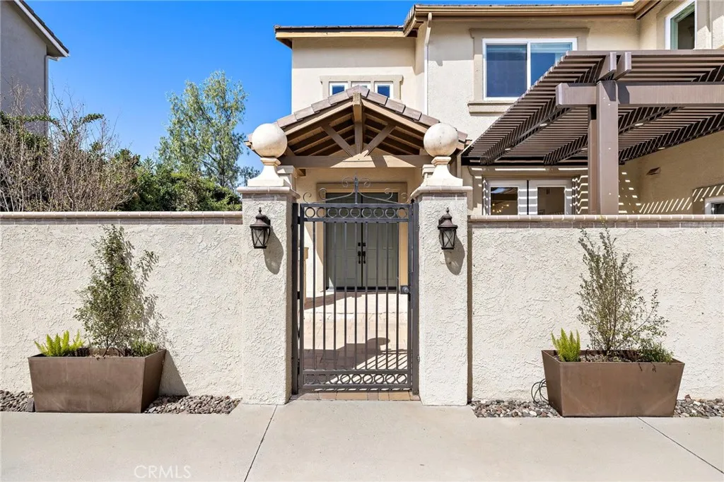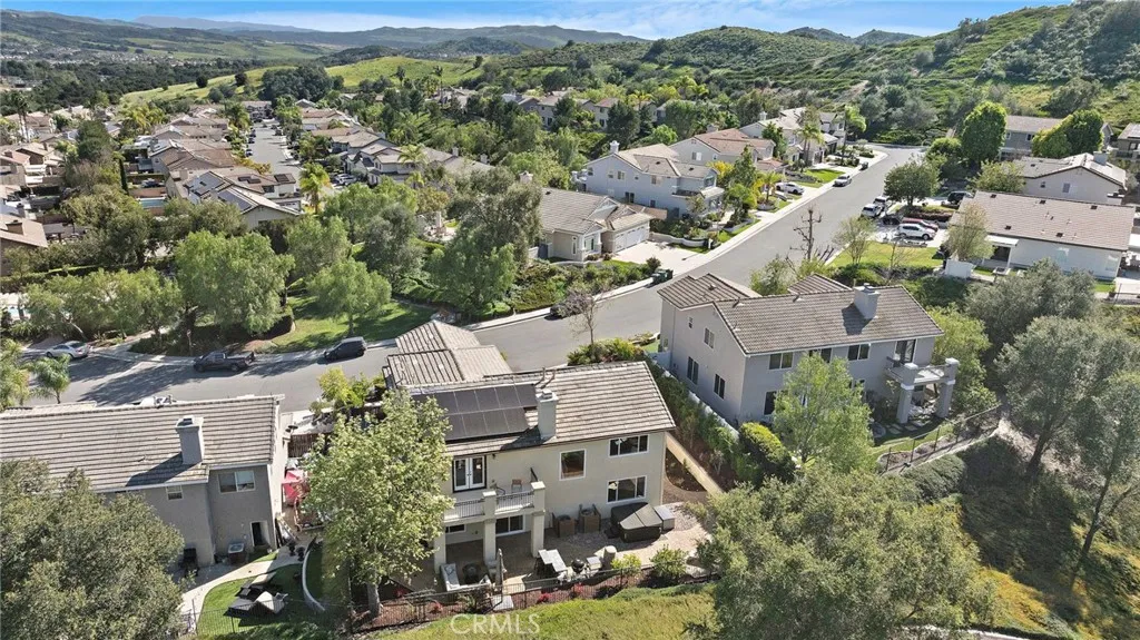 Situated in the gated community of Stonecliff this home is upgraded throughout with new gourmet kitchen, French Oak wood flooring, owned solar panels, new windows, new roof and new HVAC to name a few. This home blends modern comfort with quality finishes. French oak hardwood flooring runs throughout the downstairs, creating a warm and cohesive feel. The kitchen showcases a recent complete remodel featuring custom cabinetry and premium appliances, including a JennAir gas range, Miele dishwasher with built-in water softener, and sleek Kraus sinkscombining both functionality and style. Situated between the kitchen and formal dining area, a beautifully designed bar or coffee station features a prep sink, mini-refrigerator, and spacious pantryideal for everyday convenience and entertaining. The spacious family room, open to the kitchen, showcases a stunning rebuilt fireplace with a marble surround and custom tiled built-ins with floating shelves. A built-in surround sound system and dedicated AV cabinet complete an exceptional entertainment experience. Dining room open to the formal living area features French doors to a charming front patio featuring a pergola with integrated lightingan ideal spot to relax and unwind after dinner. The upstairs showcases the primary suite and four generous secondary bedrooms, one of which is large enough to serve as a bonus room. The primary suite features French doors opening to a balcony with serene canyon views, and an updated bathroom with new vanities, quartz countertops, and two custom closets. The private backyard offers a peaceful retrea