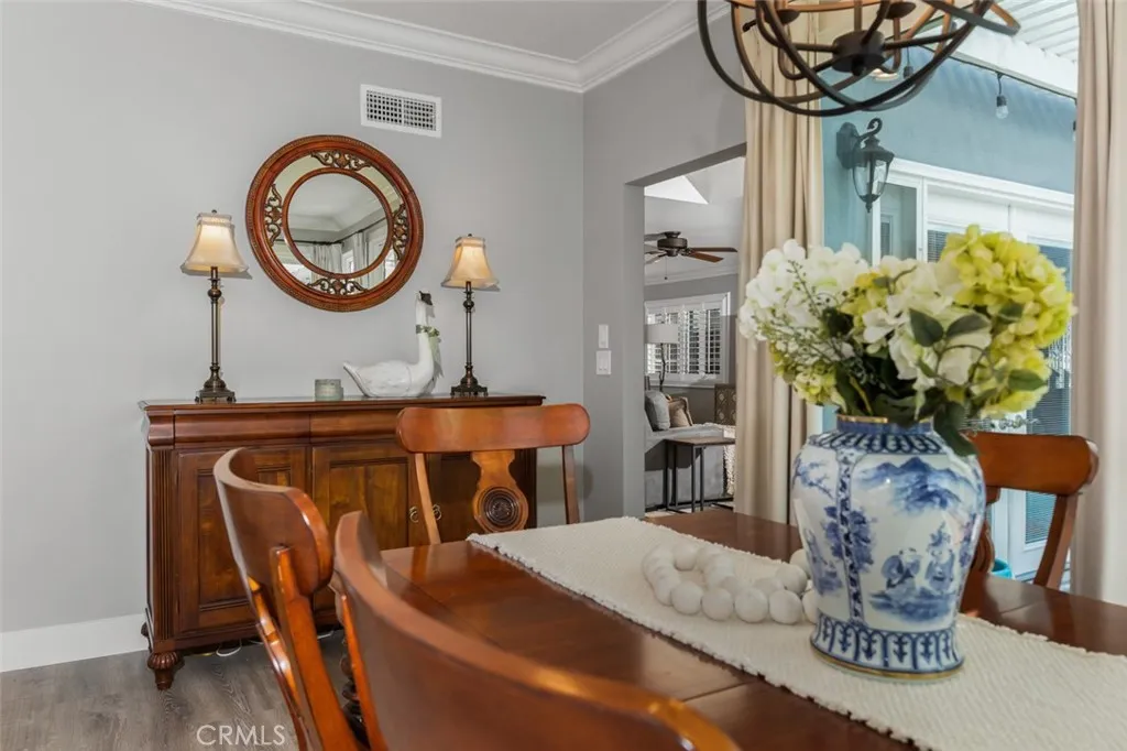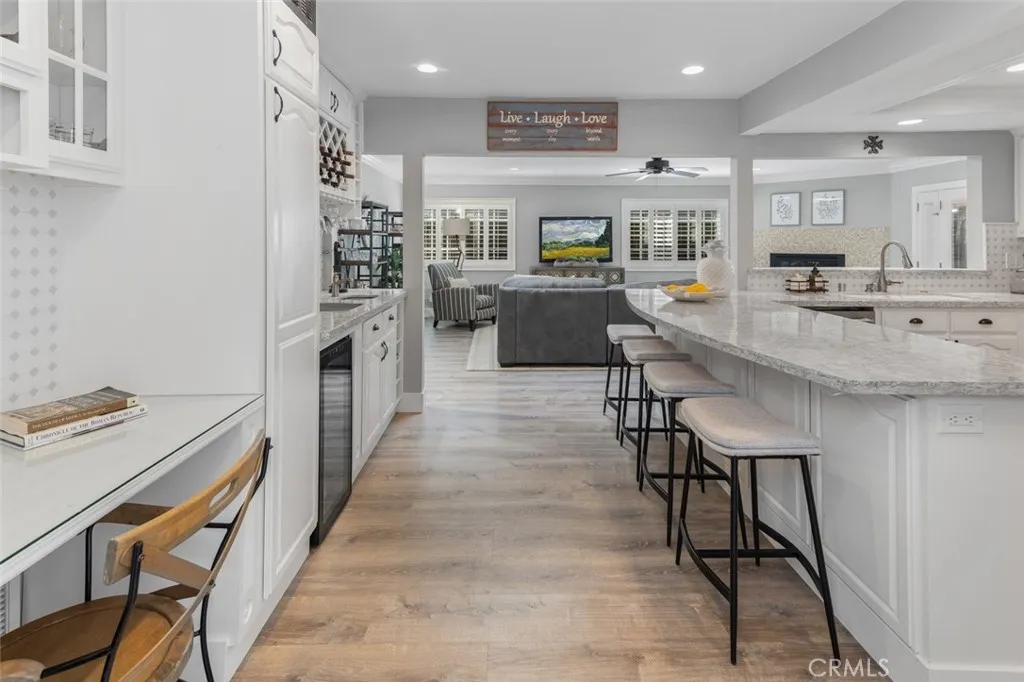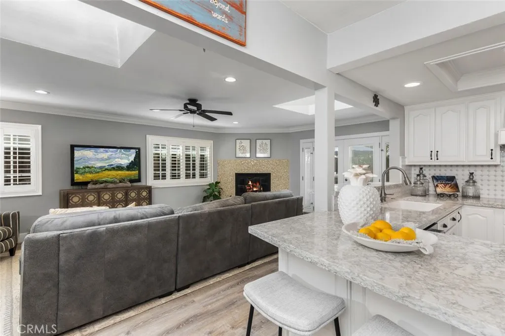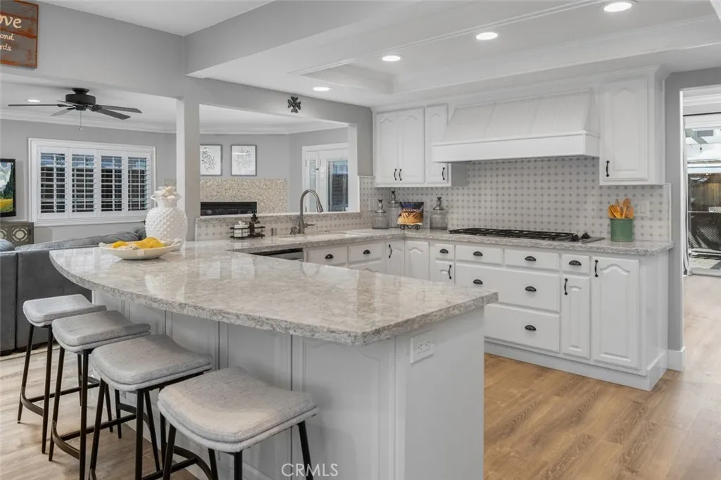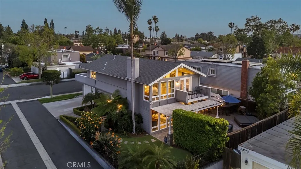 Set behind lush landscaping and warm architectural lighting, this thoughtfully designed lakeside residence blends timeless architecture with effortless California indoor-outdoor living. Inside, the main living areas are defined by soaring windows that draw in an abundance of natural light, creating an airy and inviting atmosphere throughout the home. The open layout flows seamlessly between the living and dining spaces into a beautifully appointed kitchen, where classic cabinetry, stone countertops, and an oversized island create a setting that feels both elegant and highly functional for everyday living and entertaining. The backyard extends the homes living experience outdoors. A spacious setting features a built-in kitchen, multiple lounge and dining areas, and a private jacuzzi beneath a pergola, creating the perfect environment for relaxed evenings or effortless entertaining. Upstairs, the primary suite serves as a private retreat with tranquil lake views captured through expansive windows and a private balcony. A built-in coffee bar adds a thoughtful touch to the morning routine, while the spa-inspired bathroom offers generous space and refined finishes. Two additional bedrooms are also located upstairs and share access to a massive balcony that stretches across the home, creating an elevated outdoor space overlooking the surrounding neighborhood. A fourth bedroom is conveniently located on the main level, ideal for guests or a private office. The result is a home that feels both welcoming and refined, where natural light, peaceful views, and thoughtfully designed ind
