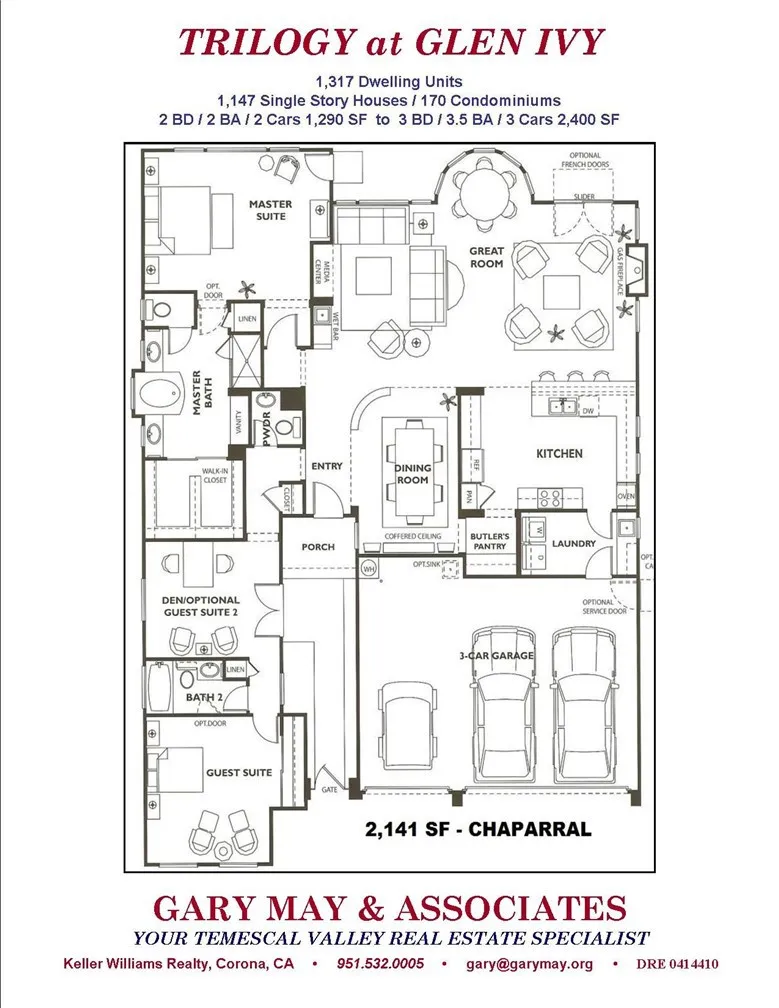 PRICE REDUCED TO SELL: Chaparral models are Trilogy's largest and most spacious SFRs (2253sf) that uniquely feature a 3-Car Garage; perfect for that Golf Cart, Custom Car or just Free/Extra Space to store "Your Stuff". With a plethora of cabinets/drawers already in place in this Garage, it may inspire you to pursue more hobbies. Inside this spacious home with an Open Floor Plan, you'll find a cozy fireplace that warms up one wall, plus a built-in "Mini Bar" with a small stainless sink in the TV Entertainment area. The Formal Dining Area with adjacent Butler's Pantry leads into magnificent Entertainer Kitchen. The spacious/open "Chef's Delight Kitchen", is highlighted by beautiful Granite Countertops over Dark Woop Cabinets - most with handy "Pull Out" Drawers. The Kitchen's Double Sinks are Stainless Steel, that set the "Stainless-Look" Motif" of the Fridge, the New Dishwasher and the Double Ovens. Natural Gas heats the Kitchen's upgraded 5-Burner Stove-Top Range. All Chaparral Models have two ample Bedrooms, plus an additional room that may serve as a 3rd Bedroom or ample Office, depending on Life-Style preferences. Two "guest-handy" Bathrooms are near the entry Hallway and Front Bedroom. However, the immense Primary Bathroom sports a "Walk-Into, Jacuzzi-Type Tub, plus a giant Walk-In Closet. Two mirrored individual Sink Vanities, settle the "His and Her's" questions, but there is also a delightful "Sit-Down" mirrored vanity here too. Outdoors, all Greenery and Shrubs are on automatic sprinkler systems; this includes watering several planted Fruit Trees. Trilogy's HOA main