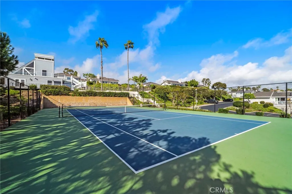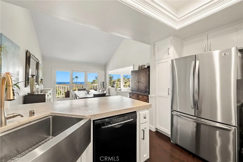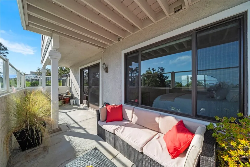 This premier first-row end-unit residence in Dana Points highly sought-after Sea Ridge community is ideally positioned along a tranquil greenbelt with ocean views from the main living areas and bedrooms. Few homes within Sea Ridge offer this combination of greenbelt frontage, ocean views, and end-unit privacy. The end-unit location provides a rare blend exceptional privacy, openness, natural light, and coastal vistas. Enter through double doors into a bright, inviting interior with abundant natural light, and expansive windows that frame both the lush greenbelt and the ocean beyond. The spacious family room with fireplace flows seamlessly into the dining area and kitchen, creating an ideal setting for everyday living and entertaining. Multiple balconies provide inviting outdoor spaces to enjoy sunset skies and ocean breezes, including a peaceful front patio overlooking the greenbelt, a private balcony off the dining area, and a spacious balcony off the primary suite. This thoughtfully designed three-bedroom home includes a custom primary bath with a luxurious shower, a dedicated laundry room, and a versatile office nook. The secondary bedroom features a private ensuite, while the main-floor bedroom has been converted into an office with direct access to the two-car garage. Sea Ridge has recently completed extensive community improvements, including exterior wood repairs, fresh paint, and a full community repipe with PEX piping. Ideally located minutes from Dana Point Harbor, beaches, scenic coastal trails, restaurants, and shopping, this home offers convenient access to the
