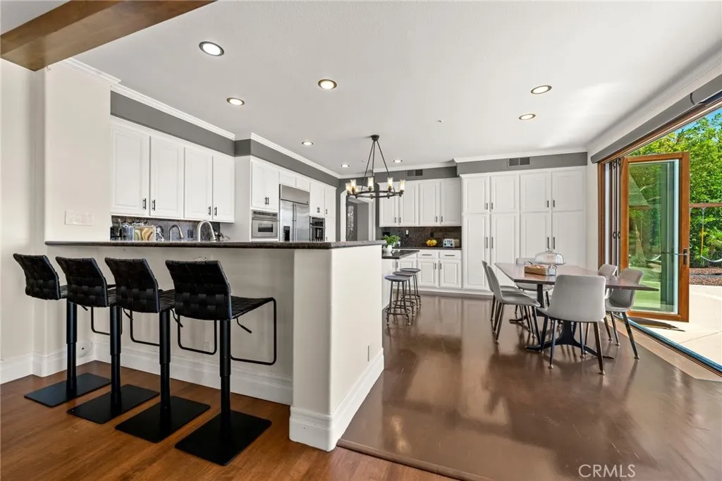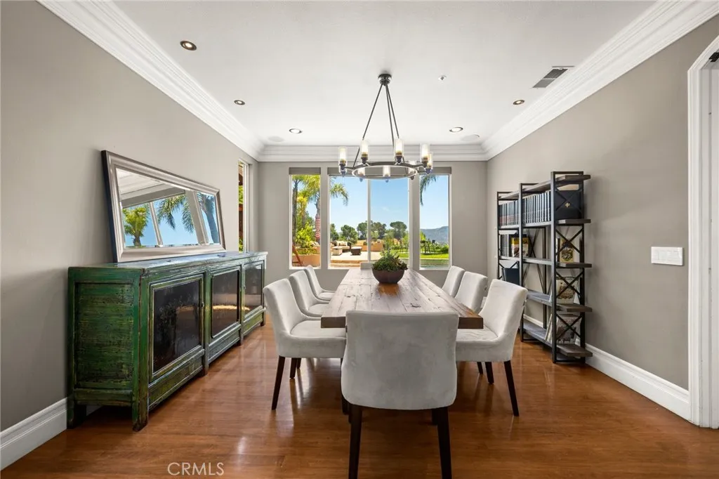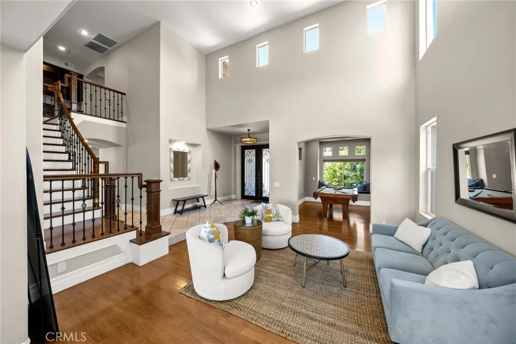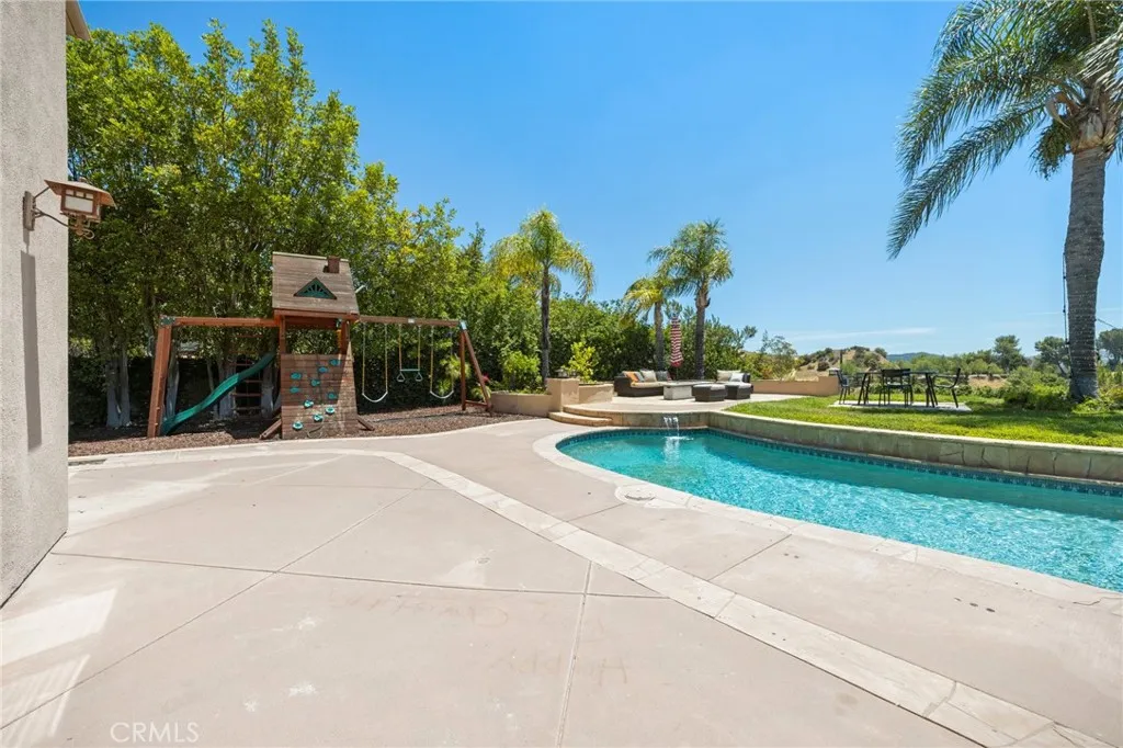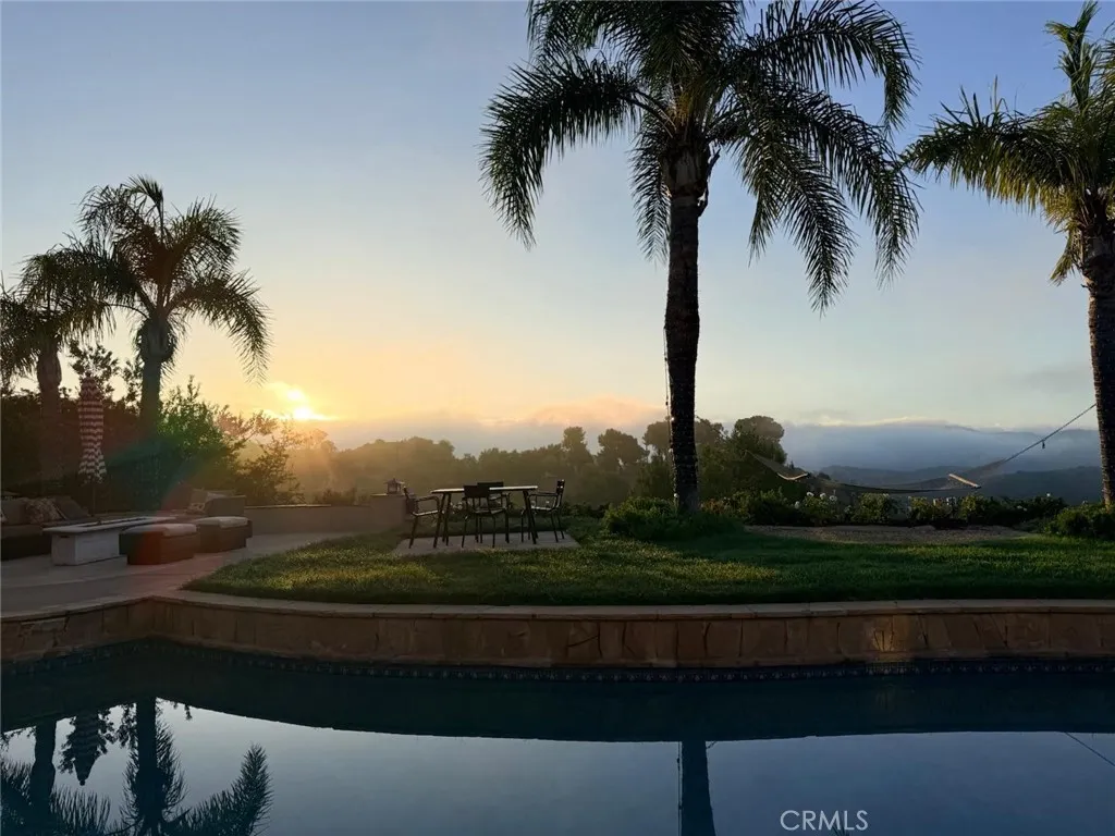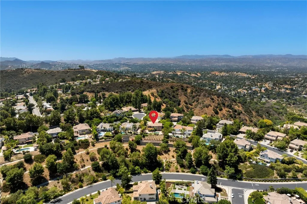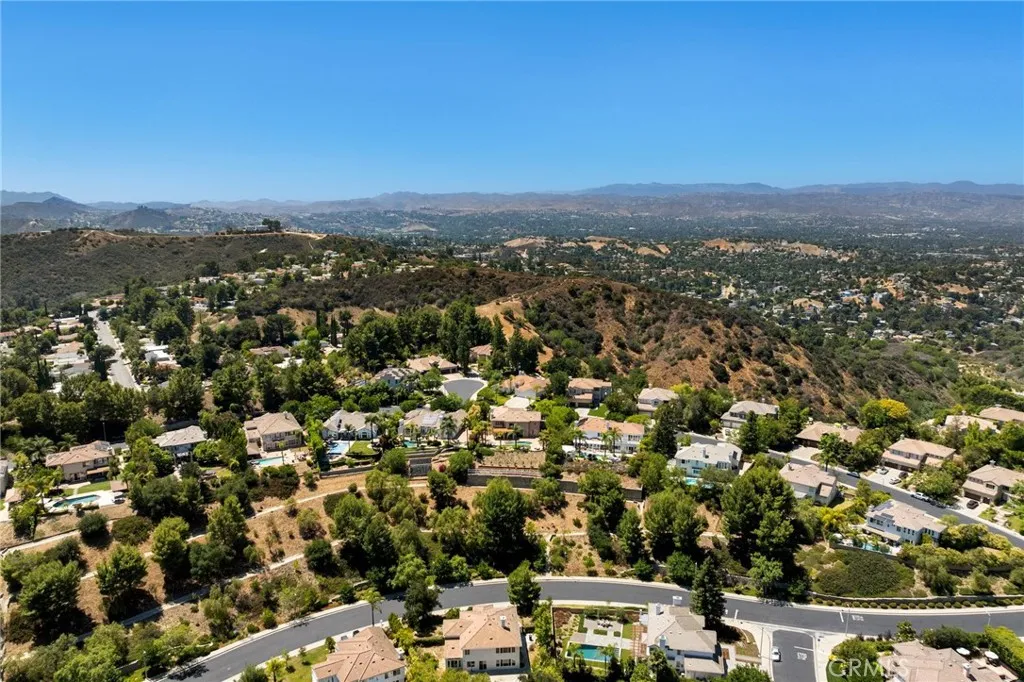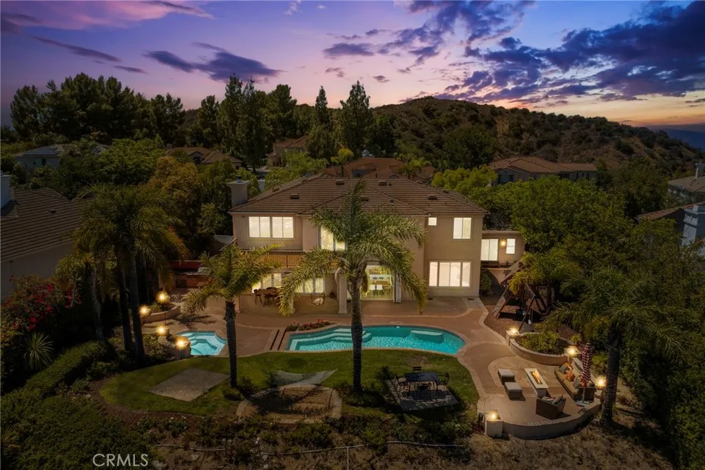 Guard-gated canyon estate with panoramic mountain and Catalina views, just minutes to Malibu beaches and Calabasas shopping and dining. Set high above the valley in Summit Pointe, this private home blends dramatic scale with peaceful canyon living. Double-height living and dining spaces frame sweeping vistas and open to a resort-style backyard with saltwater pool and spa, outdoor fireplace, built-in BBQ, covered patio, mature trees, and refreshed landscaping, ideal for entertaining or quiet retreat. Folding glass doors create seamless indoor-outdoor living. The open-concept kitchen with large center island flows into the main living areas, perfect for gatherings. The main level includes a guest suite with ensuite bath and two flex rooms ideal for a home office, gym, media room, or studio, plus powder room, laundry, and multi-car garage. Upstairs, the primary suite spans the rear of the home with a private balcony overlooking the mountains, spa-style bath, dual walk-in closets, and separate office or wellness area. Three additional bedrooms each feature private baths, including one with a steam shower. Smart home technology, EV charging, surround sound, patio heaters, and new HVAC provide modern comfort. Nearby premier equestrian facilities, including Fair Hills Farms, and easy access to Malibu beaches, canyon trails, golf, and the Calabasas-Malibu scene come together here in a way that is hard to find elsewhere.