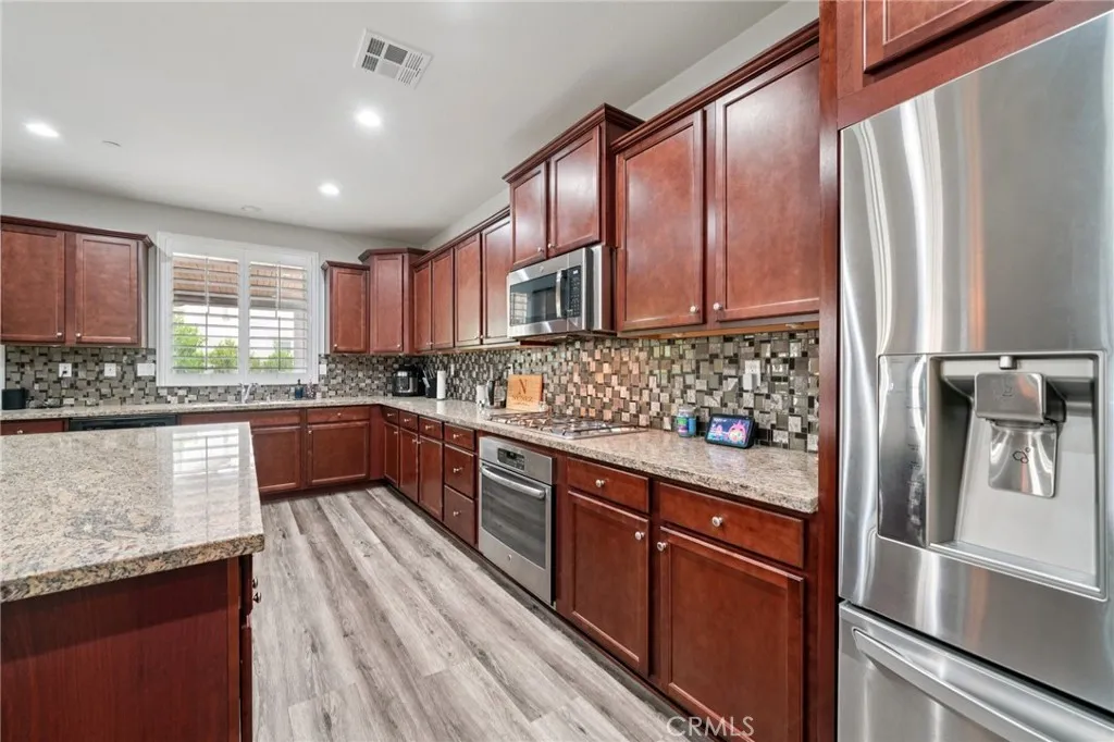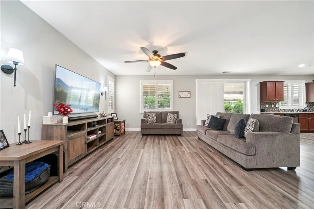 Welcome to your dream home! This beautifully maintained property is situated in a sought-after Eastvale community with low HOA fees. Nestled in a quiet cul-de-sac, this home boasts 4 spacious bedrooms and 3.5 bathrooms, perfect for comfortably. As you step inside, you'll be greeted by an open floor plan that seamlessly connects the kitchen, family room and dining area-ideal for entertaining and family gatherings. The ample sized kitchen features a cozy nook, perfect for family meals. The Master Bedroom retreat is a true sanctuary, complete with a luxurious bathroom, a walk-in closet, and private balcony to enjoy fresh air. Enjoy the upgraded wood flooring, upgraded baseboards and planation shutters throughout enhancing both style and comfort. Upstairs you'll find a mini suite bedroom with its own bathroom, along with a convenient laundry room and three well sized bedrooms. Step outside to your beautifully landscaped backyard, featuring a fire pit, patio cover and ceiling fan, stamped concrete-an inviting space for outdoor entertaining and relaxing. Gas line connections in backyard to easily install outside barbeque island. The garage is equipped with proxy seal flooring and ceiling shelfs for plenty of storage, along with a split ac unit for a perfect mancave, workshop, or gym, complemented by a tankless water heater for efficiency. Conveniently located near top rated schools, shopping, and an internation airport, making it ideal for both leisure and commuter needs. Don't miss this opportunity to make this exceptional property yours before summer! See you in escrow!