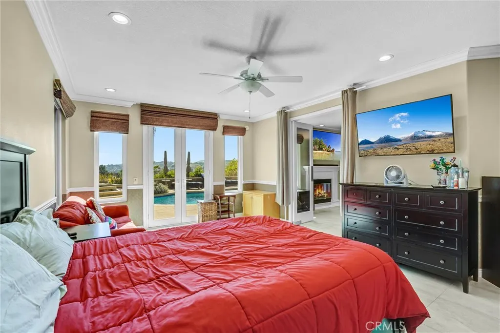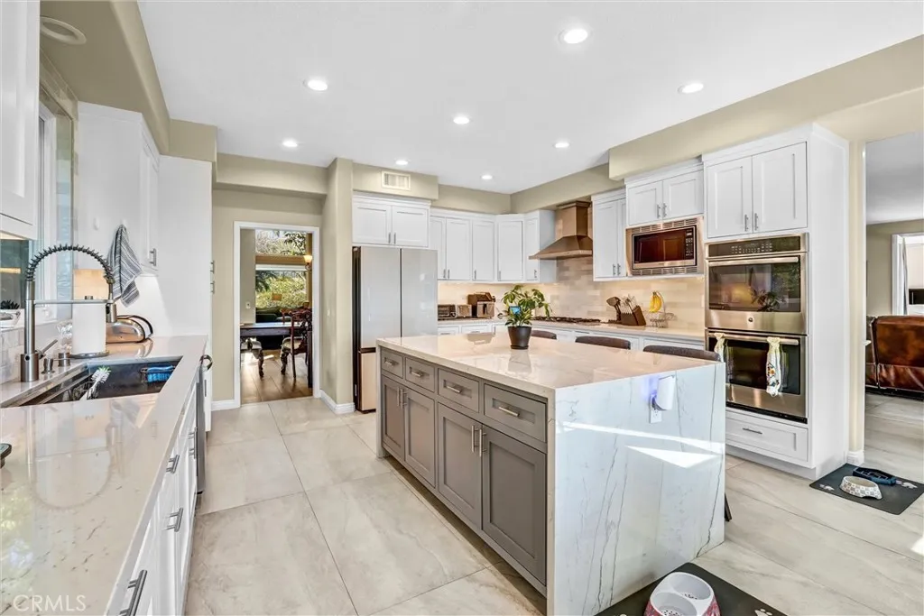 Perched in the highly desirable Monte Vista neighborhood, this impressive six bedroom, five bathroom home offers generous living space, stunning views, and exceptional upgrades throughout. A grand entry welcomes you with soaring ceilings and a dramatic staircase, setting the tone for the spacious and warm light filled interior. Step down into the elegant formal living room anchored with a custom fireplace and adjacent dining room featuring beautiful French doors. Additional living space is found in the expansive family room filled with natural light showcasing the breathtaking 180-degree valley and mountain views, along with custom shelving, recessed lightning and a cozy fireplace perfect for cool evenings. The newly remodeled kitchen is designed for both everyday living and entertainment, featuring a large center island, GE stainless steel appliances, and beautiful stone countertops. Crisp and clean white custom cabinets are abundant as well as vast counter space for large family meals or an active cook. Energy efficient dual-pane doors and windows with automated blinds provide comfort and convenience throughout the home while showcasing the beautiful lush foliage that surrounds the property. The flexible "Plan 5" floor plan includes two bedrooms a full bathroom plus powder room on the main level, ideal for guests or multi-generational living. A sixth bedroom can easily serve as a playroom, office, home gym or den. Upstairs, the grand primary suite offers a private balcony with stunning views, dual closets, and a spa-inspired bathroom complete with a soaking tub, separate