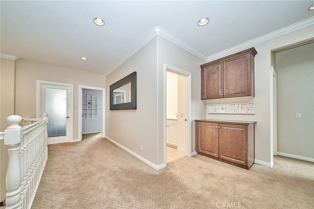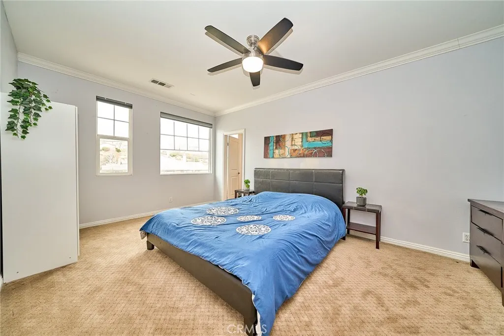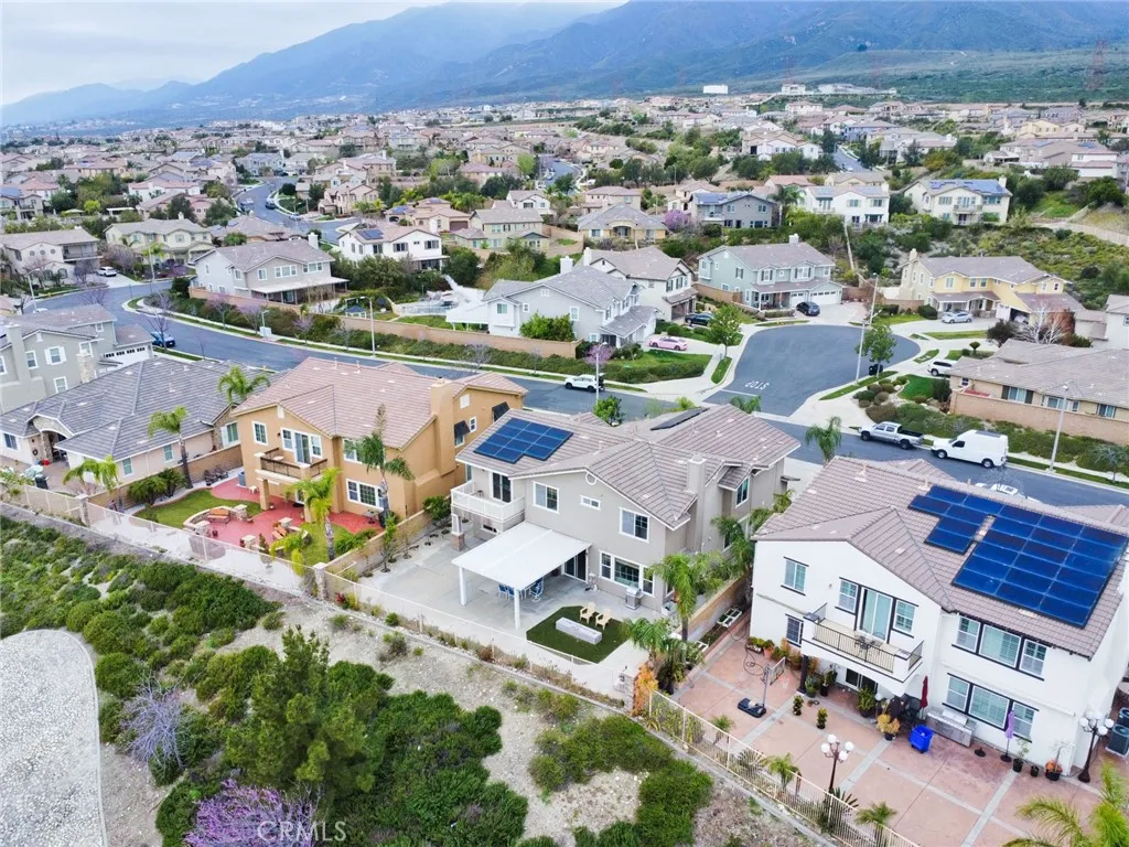Located in one of Rancho Cucamongas most sought-after gated communities within the highly acclaimed Etiwanda School District, this exceptional 5-bedroom, 5-bathroom residence offers nearly 3,900 square feet of expansive living space with panoramic city and mountain views. Built in 2006 and positioned south-facing for optimal natural light, the home blends architectural elegance with long-term value including fully paid solar panels for energy efficiency and savings. A charming private courtyard with decorative pergola entry creates a striking first impression, setting the tone for the spacious interior beyond. Inside, the thoughtfully designed floor plan offers open-concept living areas and a generously sized loft that has been creatively configured into additional flexible-use spaces, currently serving as a private retreat and home office. Whether for extended family, remote work, or personal hobbies, the layout offers exceptional versatility without sacrificing openness. The luxurious primary suite provides a peaceful escape, while the rare casita-style guest suite near the entrance adds privacy and convenience for multigenerational living or visitors. The beautifully finished backyard features a 357 sq. ft. covered patio, fruit trees, and ample space for entertaining all complemented by sweeping foothill and city light views. Additional highlights include a wide driveway and 3-car garage, all within the prestigious Rancho Etiwanda Estates community, just minutes from award-winning schools, Victoria Gardens, dining, parks, and freeway access. A rare opportunity to own a