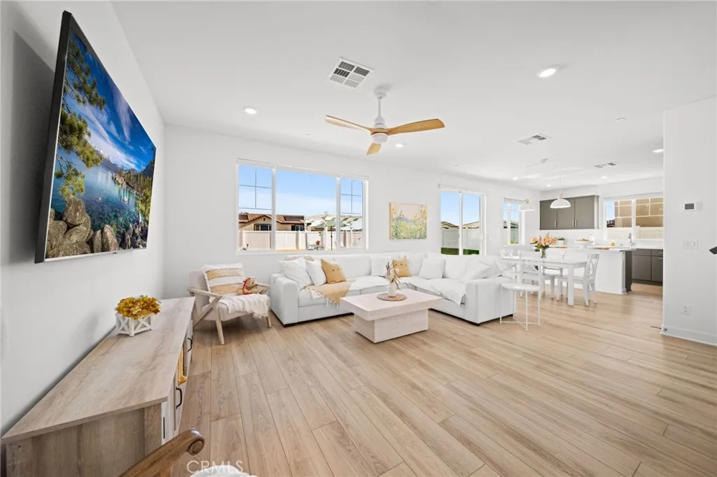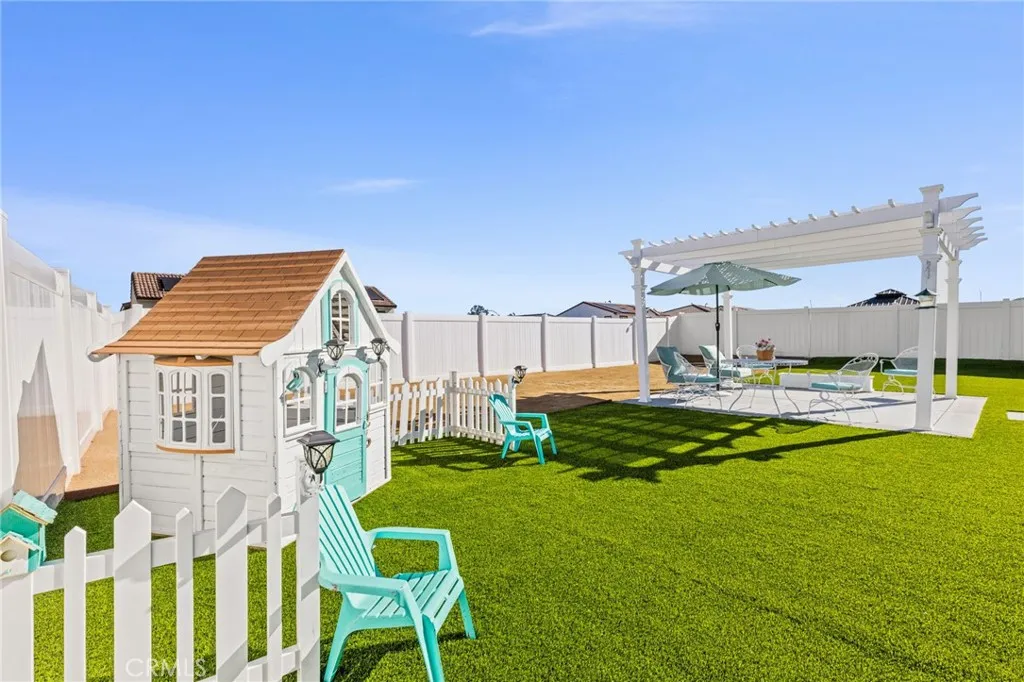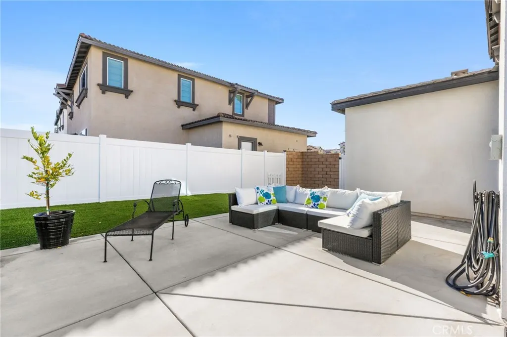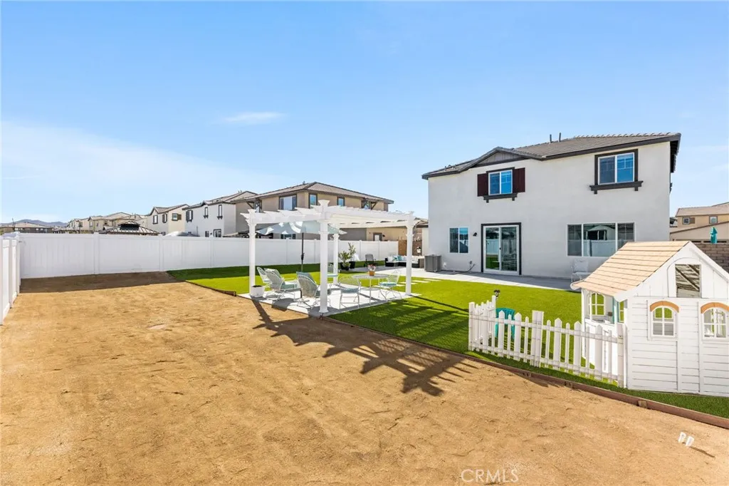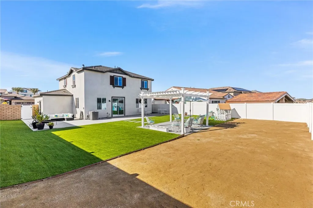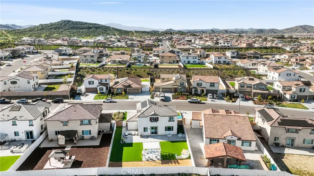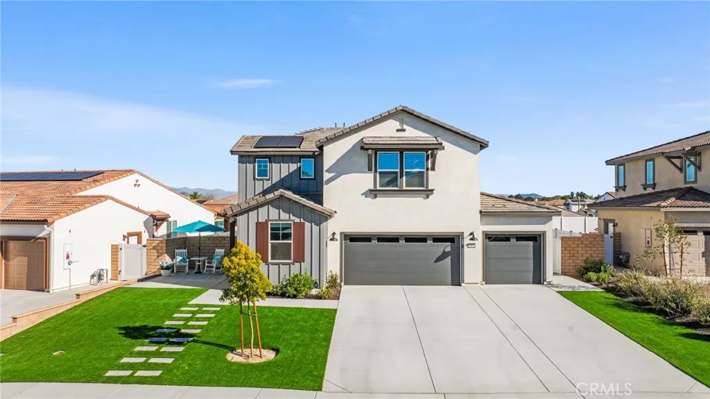 Welcome to this Desirable Quartz Ranch Spectacular Light Bright 1+year New Modern Farmhouse in the highly sought City of Menifee. Built in Nov 2024 this contemporary home offers 1824sq ft of thoughtfully designed living space. Located on a gorgeous oversized 7784 sq ft FLAT LOT, Fully Landscaped, White Vinyl fenced yard. Bask under the gorgeous white vinyl 12 x 12 Pergola on a 14x14 concrete island. All the yard is done in TURF, DG, and drought resistant plants. A gorgeous, beautiful EPOXY 3 CAR GARAGE, with OVERSIZED DRIVEWAY fitting up to 6 Cars. An additional beautiful Front Courtyard to enjoy the Sunsets and Breezes. LOW $56/mo LEASED SOLAR panels to be transferred to new owner Making Electric bill almost Nonexistent! Super LOW HOA $33/mo ! Tankless Water Heater for continuous nice hot showers. Step inside to an inviting Open-Concept floor plan filled with natural light, where the spacious great room flows seamlessly into the dining area and chef-inspired kitchen. The kitchen is the heart of the home, complete with center island, quartz countertops, stainless steel large sink and appliances, abundant cabinetry, pantry, designer ceiling fan and a designer lamp, perfect for everyday living and entertaining. All downstairs is done in Luxury VINYL PLANK FLOORS, And RECESSED LIGHTING throughout the home! A versatile downstairs office/den offers the flexibility to function as a fourth bedroom, guest room, or private workspace, conveniently located near a half bathroom on the main floor. Upstairs, youll find 2 secondary bedrooms, a full bathroom. A separate luxurious primary s