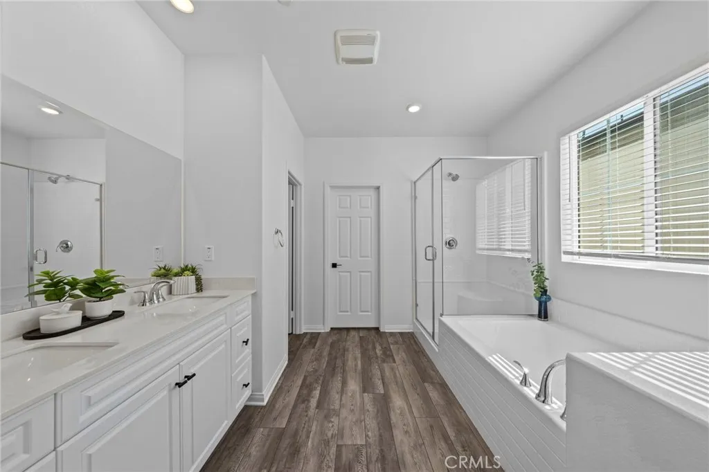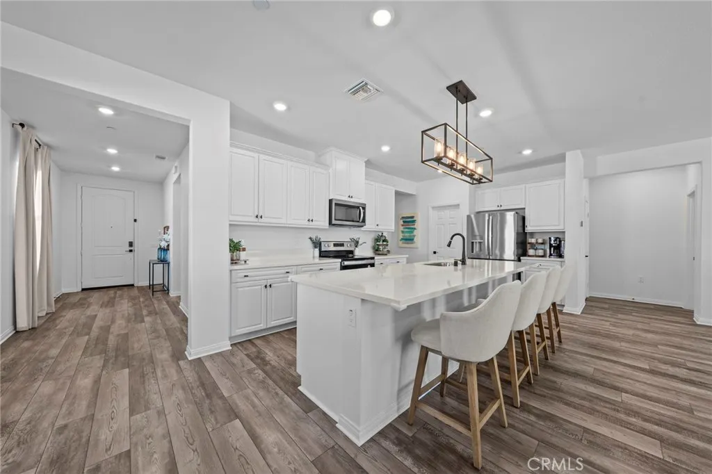 PAID OFF SOLAR!!! Located in the Rosetta Canyon community of beautiful Lake Elsinore this home has it all. Imagine coming home to a nearly new, single-story retreat where everything has already been thoughtfully upgraded for youincluding PAID OFF SOLAR. Built less than two years ago, this home perfectly blends modern comfort with effortless style. Step inside and youll immediately notice the gorgeous luxury vinyl plank flooring and an open, airy great room that feels perfect for gatherings, cozy nights in, and everything in between. The expansive kitchen island truly steals the show with quartz counters, beautiful backsplash, walk-in pantry, and a lovely chandelier that adds just the right touch of elegance. Your primary suite is a peaceful escape featuring a spacious bedroom and a spa-like ensuite with double sinks, a soaking tub, walk-in shower, and an incredible walk-in closet. The secondary bedrooms are generously sized, with one even offering its own walk-in closetperfect for family, guests, or a home office. The secondary hall bathroom is spacious and features a shower/tub combo. Throughout the home you'll notice recessed lighting, multiple closets for storage and a sizable laundry room with sink. Step outside and the magic continues. The substantial backyard was designed to let the breathtaking views take center stage, with cement hardscaping, plants, lights along the rod iron fencing and artificial turf that creates a beautiful, low-maintenance space to relax, entertain, and watch the sunsets. In the front yard you'll enjoy water wise plants also. Homes this new, th