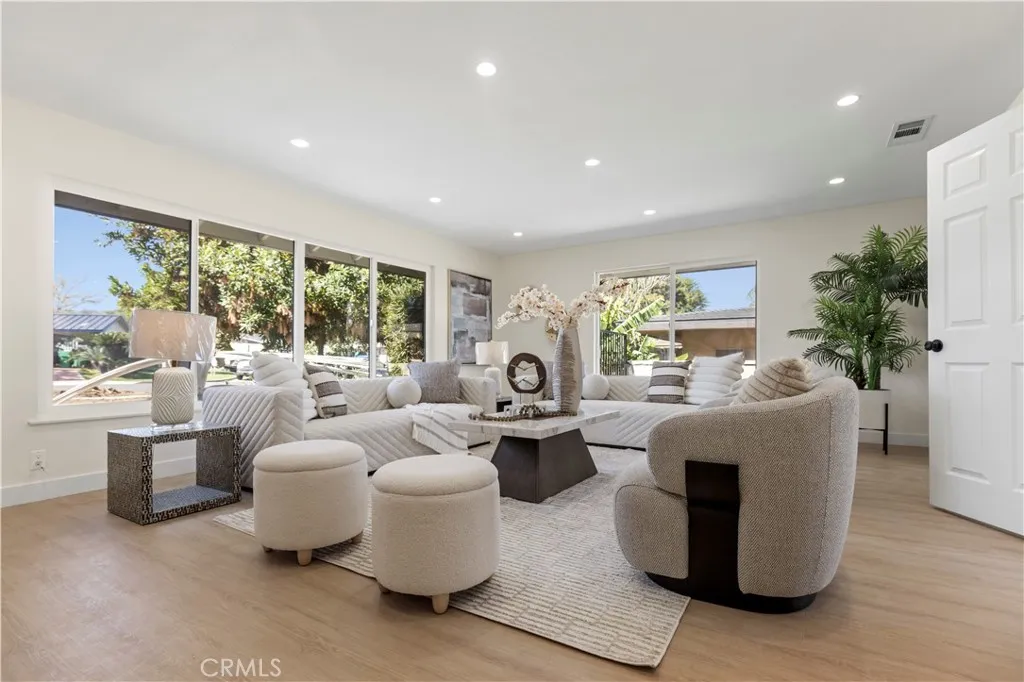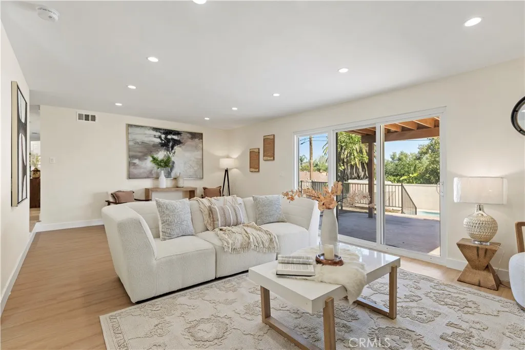 Welcome to 645 Lancer Lane, a beautifully reimagined residence located in one of Coronas most desirable neighborhoods known for its custom homes, spacious lots, and quiet residential setting. Set on an expansive 10,454 sq ft lot, this fully remodeled home offers approximately 2,377 sq ft of thoughtfully designed living space featuring 4 bedrooms and 5 bathrooms, including a highly desirable main-level bedroom and bathideal for guests, multigenerational living, or a private home office. From the moment you enter, the home showcases a bright open layout enhanced by wide plank flooring, recessed lighting, and contemporary designer finishes. The spacious living room and dining area flow seamlessly into the beautifully updated chef's kitchen, featuring abundant cabinetry, generous counter space, a center island with wine cabinet, embedded microwave and breakfast seating. A large family room with statement fireplace provides an inviting space for gathering and entertaining, with direct access to the backyard for effortless indoor-outdoor living. Upstairs offers three well-appointed bedrooms along with three bathrooms, providing exceptional flexibility and privacy. A standout feature of the home is the private outdoor deck, perfect for enjoying sunset views, morning coffee, or relaxing evenings overlooking the neighborhood. The backyard is designed for Southern California lifestyle living, complete with a private pool, expansive patio areas, and generous space for entertaining or creating your own outdoor retreat. Additional highlights include: Three-car garage (approx. 775 sq ft