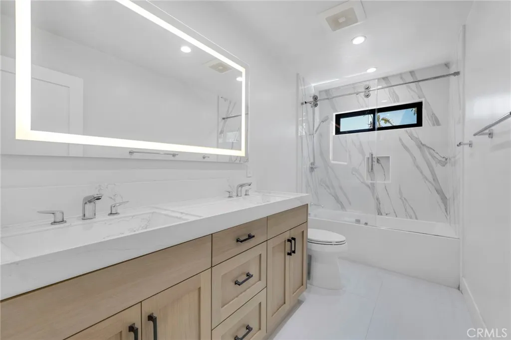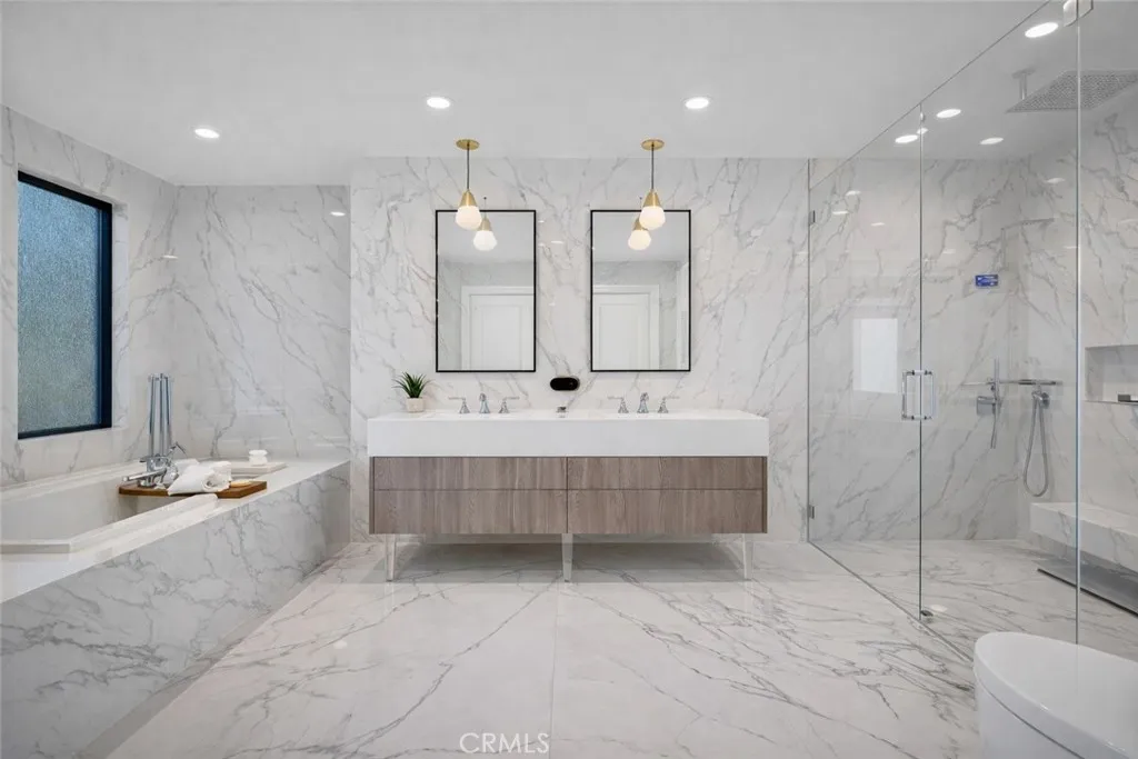 Chatsworth renovated home with open floor plan, solar, pool size spa, chefs kitchen, luxury primary suite, and entertainers indoor-outdoor living. Welcome to 20500 Blairmoore St in Chatsworth, a beautifully renovated turn-key home offering modern design, high ceilings, and luxury finishes in one of the most desirable pockets of the San Fernando Valley. This extensively updated property delivers the move-in ready lifestyle buyers are searching for, combining modern upgrades, natural light, and spacious living areas ideal for both everyday living and entertaining. The thoughtfully designed layout features a highly desirable open concept floor plan with a dramatic living room, statement fireplace wall, spacious family room, and elegant dining area filled with natural light from large windows and tall ceilings. At the heart of the home is the chefs kitchen, featuring custom wood cabinetry, high-end stainless steel appliances, professional gas range with signature red knobs, marble countertops and backsplash, and a large waterfall island with seating, making it the perfect gathering space for cooking, hosting, and everyday living. Spacious bedrooms provide comfort and flexibility, including a luxurious primary suite retreat designed as a private escape with a spa-inspired bathroom featuring dual vanities, premium stone finishes, soaking tub, and oversized walk-in shower. Large windows throughout the home enhance the warm contemporary design while bringing in abundant natural light, creating a bright and inviting atmosphere across all living spaces. Step outside and enjoy the Sou