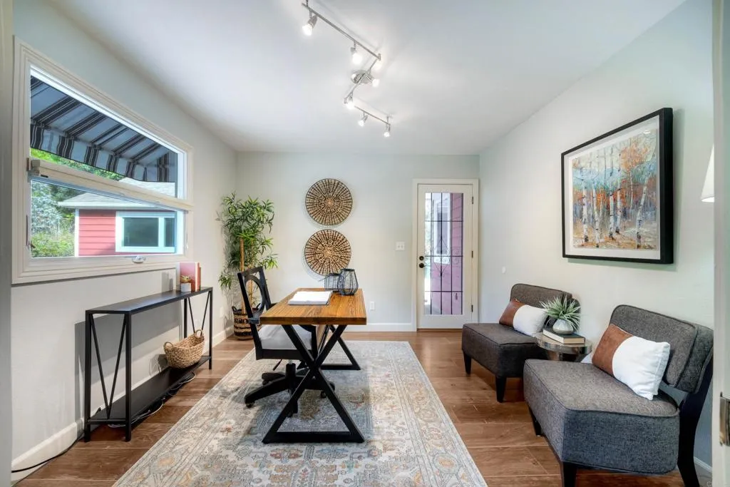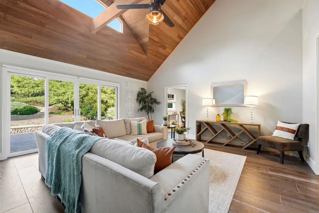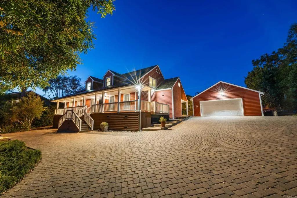 One-of-a-kind home on a fully landscaped acre in Vista, just up the hill from shopping and the 78. Wrap-around front porch, beautiful interior finishes, and flexible layout that lives like a single story. The luxurious first-floor primary suite is designed with accessibility in mind. The kitchen is spacious with multiple working surfaces, abundant cabinet and pantry space, and plenty of room to gather. A butlers pantry provides additional convenience when entertaining. A combination laundry room and full bathroom are conveniently located off the back patio entrance, a perfect spot to clean up before traversing the eye-catching engineered wood floors. Upstairs, all three bedrooms are oversized with large closets. Two also have attached bonus rooms. Look for the entrance to one, cleverly disguised as a mirrored wardrobe door! Hobbyists will delight in the 750 sq ft detached garage/workshop; athletes will appreciate the 3030 sport court. Additional features include a brick-paved private driveway, RV and boat storage, and city sewer. Paid-for solar, EV charging circuit in the garage, and a playhouse round out this exquisite and thoughtfully-designed estate.