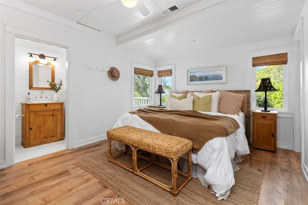 Originally built in 1939 as a classic coastal cottage, this beautifully restored home in the coveted Woods Cove neighborhood of Laguna Beach blends timeless character with thoughtful modern upgrades. Meticulously renovated while honoring its vintage roots, the residence captures the charm of Lagunas early seaside homes while offering the comfort and functionality of contemporary living.Inside, the home showcases distinctive architectural details, including a custom tongue-and-groove ceiling in the living room that highlights the cottages historic character. Natural light fills the inviting living spaces, creating a warm and relaxed atmosphere that reflects the easygoing coastal lifestyle just blocks from the shoreline at Woods Cove Beach.The flexible floor plan offers four bedrooms or three bedrooms plus a dedicated office, along with three well-appointed bathrooms. Each space has been thoughtfully updated while maintaining the homes original charm, creating an ideal balance of style, comfort, and practicality. Outdoor living is a defining feature of the property. A wraparound ocean-view deck provides the perfect setting for morning coffee, sunset gatherings, and year-round entertaining while taking in sweeping views of the Pacific Ocean, Catalina Island, and the sparkling city lights of Laguna Beach after dusk. Enchanting verandas line the pathways throughout the property, enhancing the homes storybook feel and creating inviting spaces to relax and unwind.The backyard features a spacious veranda topped with a pergolaan idyllic retreat for afternoon lounging, outdoor dining