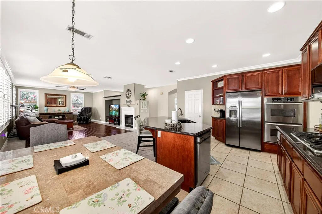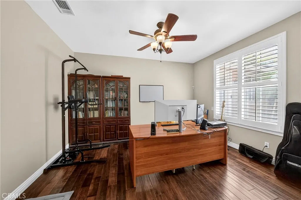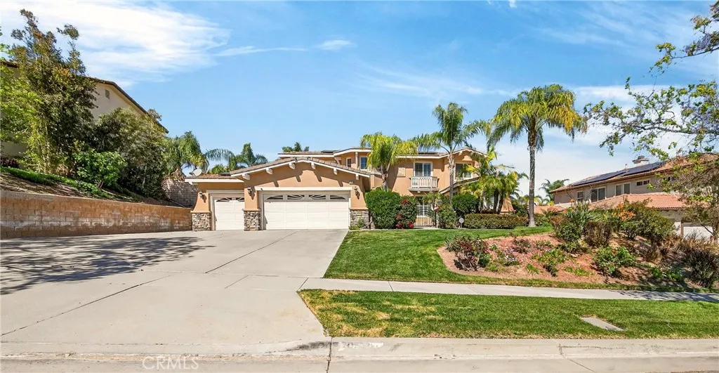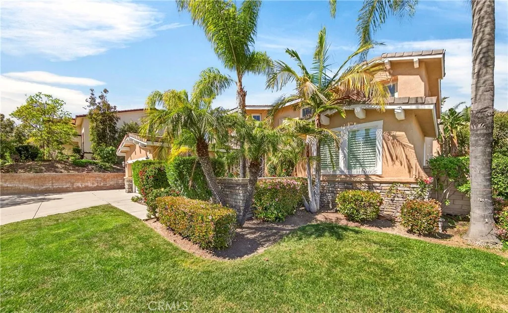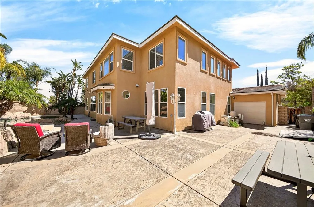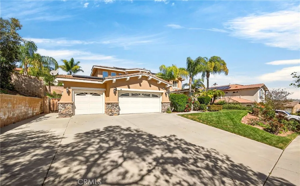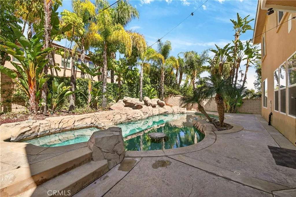 Resort-style Eagle Glen pool home with 3-car garage, flexible 6-bedroom potential, and a stunning rock pool & spa, perfect for luxury living and entertaining. From the moment you enter, you are greeted by soaring ceilings, a dramatic staircase, and an abundance of natural light that fills the spacious open floor plan. Designed for both everyday living and entertaining, the home features expansive living areas with beautiful wood flooring and seamless flow between the living room, dining area, family room, and kitchen. This beautiful home offers a bedroom and a full bathroom and an office on main level. The gourmet kitchen showcases rich wood cabinetry, granite countertops, stainless steel appliances, and a large center island with bar seating, opening to a warm and inviting family room with a fireplace. Spacious living room and formal dining room combo area. The luxurious primary suite offers a peaceful retreat with a spacious layout and a spa-inspired bathroom featuring dual vanities, a soaking tub, and a large walk-in shower, walk-in closet. Generously sized secondary bedrooms provide flexibility for family, guests, or a home office, with the potential for up to six bedrooms. Step outside into your private tropical oasis. The beautifully landscaped backyard features a resort-style rock pool surrounded by lush palm trees, natural stone accents, and multiple seating areas perfect for relaxing or entertaining. Additional highlights include a financed solar system for energy efficiency, NEWER HVAC SYSTEM (installed in 2024)and WATER HEATERS, and a desirable location with LOW