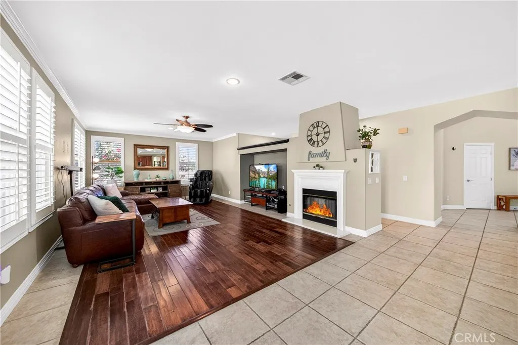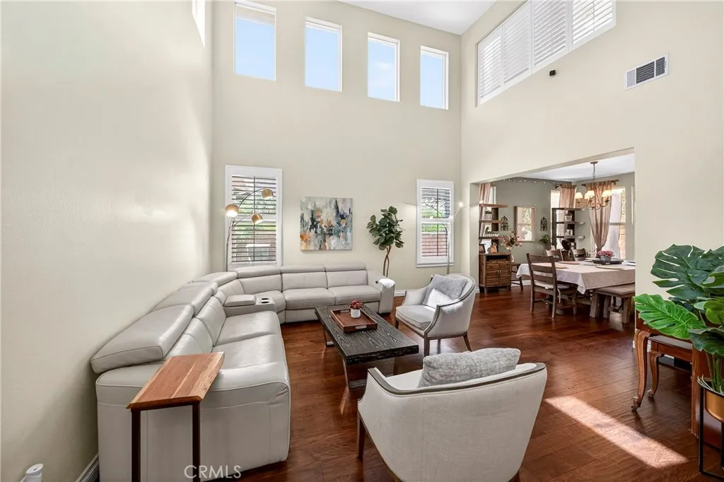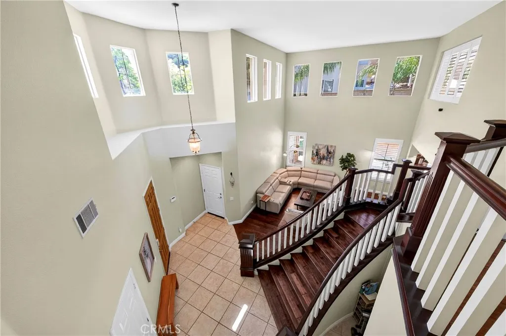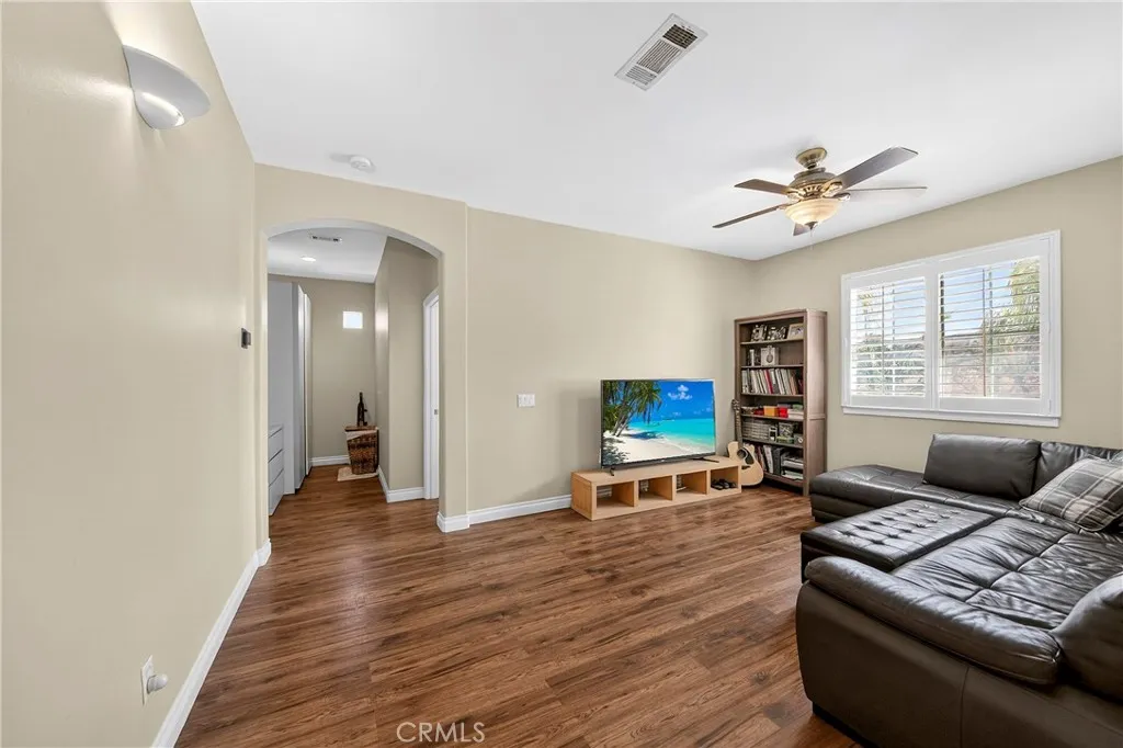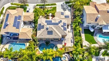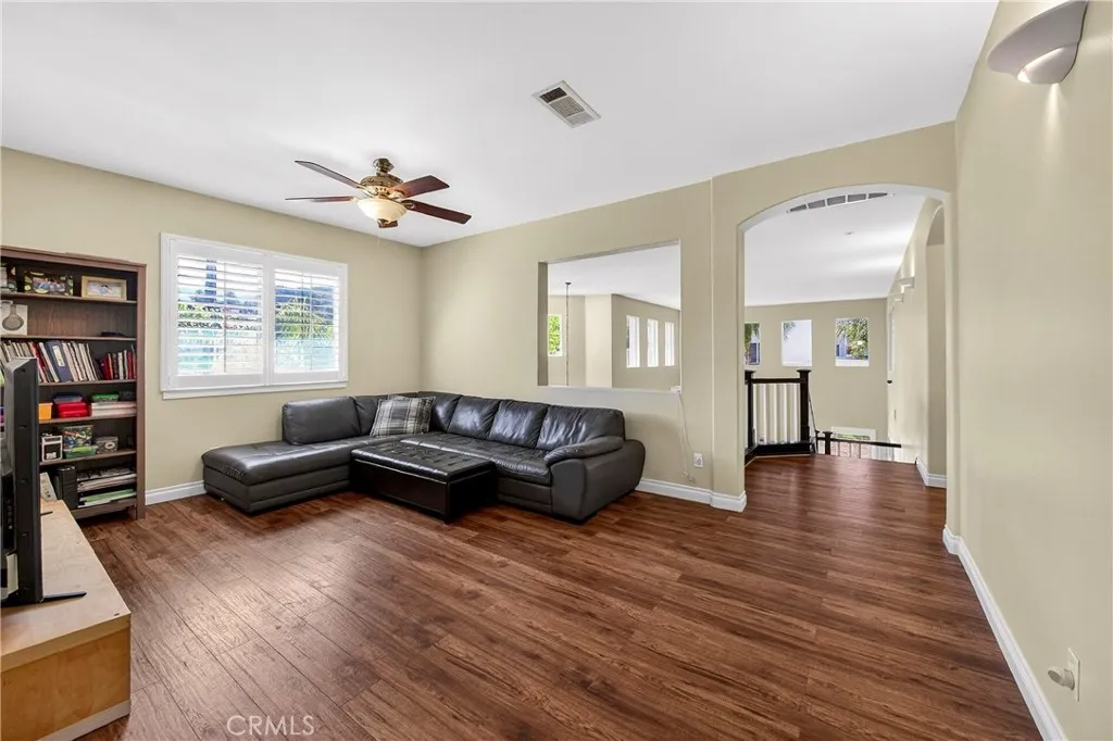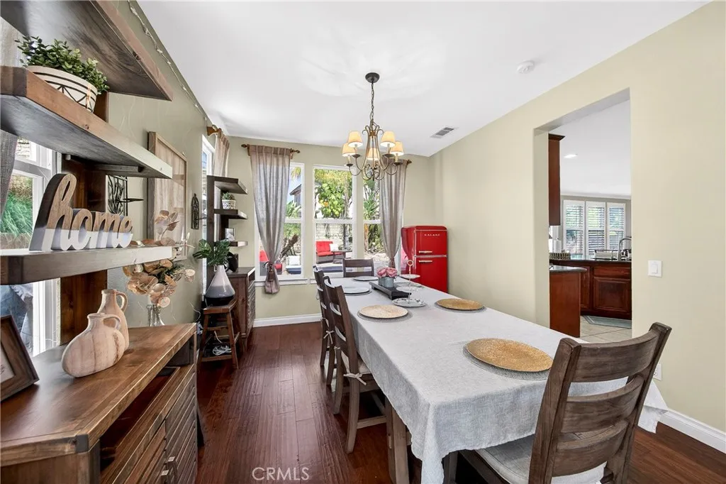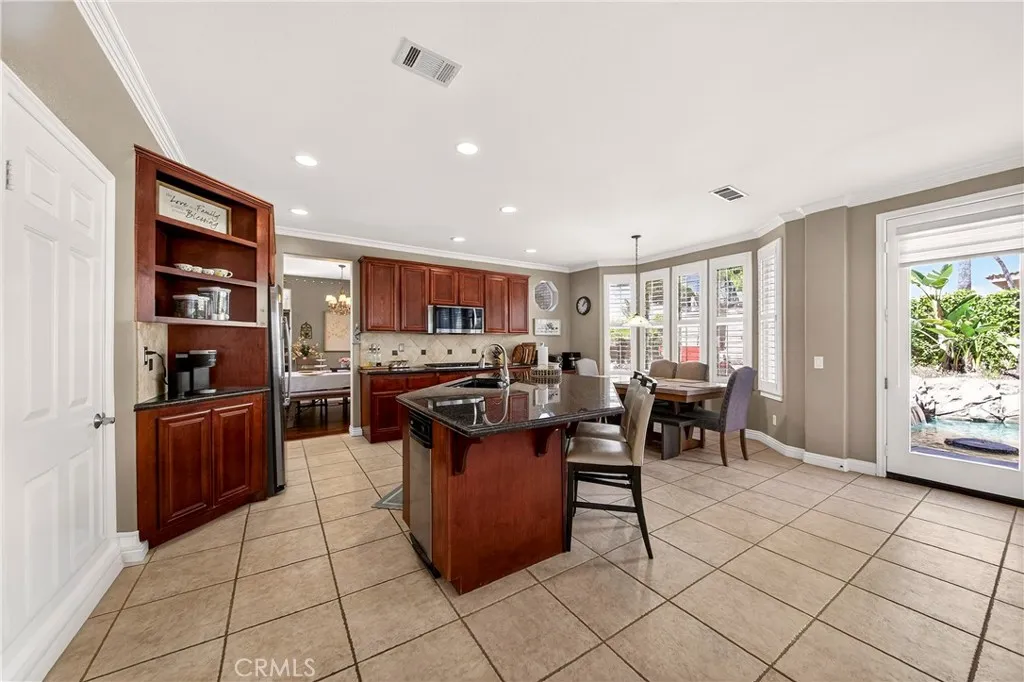 Resort-style Eagle Glen pool home with 3-car garage, flexible 6-bedroom potential, and a stunning rock pool & spa, perfect for luxury living and entertaining. From the moment you enter, you are greeted by soaring ceilings, a dramatic staircase, and an abundance of natural light that fills the spacious open floor plan. Designed for both everyday living and entertaining, the home features expansive living areas with beautiful wood flooring and seamless flow between the living room, dining area, family room, and kitchen. This beautiful home offers a bedroom and a full bathroom and an office on main level. The gourmet kitchen showcases rich wood cabinetry, granite countertops, stainless steel appliances, and a large center island with bar seating, opening to a warm and inviting family room with a fireplace. Spacious living room and formal dining room combo area. The luxurious primary suite offers a peaceful retreat with a spacious layout and a spa-inspired bathroom featuring dual vanities, a soaking tub, and a large walk-in shower, walk-in closet. Generously sized secondary bedrooms provide flexibility for family, guests, or a home office, with the potential for up to six bedrooms. Step outside into your private tropical oasis. The beautifully landscaped backyard features a resort-style rock pool surrounded by lush palm trees, natural stone accents, and multiple seating areas perfect for relaxing or entertaining. Additional highlights include a financed solar system for energy efficiency, NEWER HVAC SYSTEM (installed in 2024)and WATER HEATERS, and a desirable location with LOW