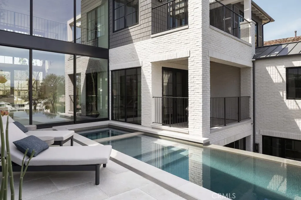 Set within the guard-gated enclave of Big Canyon in Newport Beach, this newly completed residence by JFB Custom Homes, designed by Aust Architects with interiors by Morrison Interiors, reflects a quiet sophistication where natural materials, refined craftsmanship, and thoughtful proportions create a home of enduring serenity. A dramatic double-height entry with approximately 20-foot ceilings introduces the home, where bespoke lighting, rich herringbone wood flooring, and beautifully crafted custom cabinetry establish a quiet sense of luxury. From the foyer, a dramatic sightline extends through the home, across the infinity-edge pool to sweeping vistas of Big Canyon Country Club and the mountains beyond. Interiors are shaped by a palette of warm oak, honed stone, and soft natural textures, creating an atmosphere of effortless harmony throughout. Light filters through carefully framed openings, illuminating spaces that feel generous yet intimately scaled. At the heart of the home, the kitchen serves as both gathering space and sculptural focal point. An elegant stone island anchors the room beneath custom pendant lighting, while warm wood cabinetry and dramatic veined stone create a layered interplay of texture and tone. A fully appointed butlers pantry with its own suite of appliances provides seamless support for both everyday living and entertaining. The great room opens fully through expansive pocketing walls of glass, dissolving the boundary between indoors and out and embracing the essence of Southern California living. Beyond, a dramatic infinity-edge pool and spa over