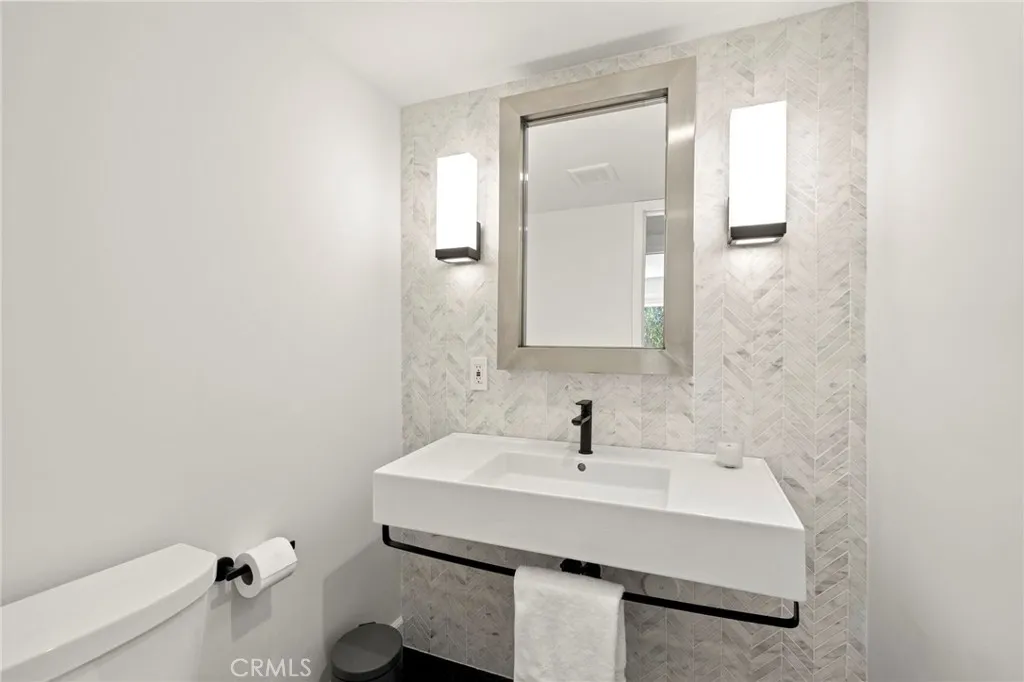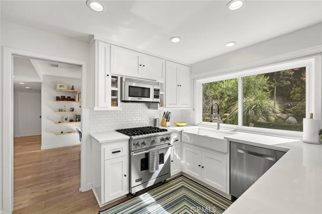 Modern design meets Laguna living at 3121 Bern Drive. Situated in desirable Top of the World neighborhood just up Park Avenue from downtown Laguna Beach. A rare Laguna find of large flat lawn with mature trees and gardens combined with ocean and Catalina Island view. Versatile floor plan that allows for main floor living if preferred with all conveniences on the main floor and no steps to access the home. Stone pathway with green plantings leads to a custom front double door with glass panes under sleek redwood siding design. The high vaulted main room enjoys an ocean and Catalina view and a gas fireplace with painted brick surround. The front dining area has built-in bench seating with storage, modern chandelier and floating wall shelving. Every room has a view to the green spaces surrounding this home, affording privacy combined with nature. The gourmet kitchen features Quartz counters, subway tile backsplash, Kohler farmhouse sink with gooseneck fixture, custom cabinetry and top of the line appliances including Viking gas range & microwave, Bosch dishwasher, new LG French door refrigerator/freezer. Dedicated dining room with glass pendant chandelier, this room can dual as a den/office, has kitchen bar seating and wonderful breezes through French & sliding glass doors that connect to the outdoor areas. The lush back patio with yard has flowering plantings, built-in gas fire pit, seating. The main floor primary suite remodeled with porcelain tile shower, dual Carrara marble vanities, walk-in closet with solid maple custom crafted organizers. An additional bedroom, remodele