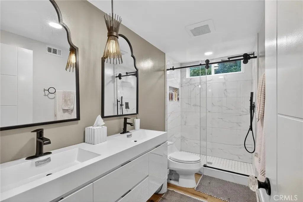 Rare single-level end unit with stunning panoramic city light views! Spectacularly remodeled. Enjoy breathtaking vistas that stretch from Downtown Los Angeles to the San Pedro Pier. This 3-bedroom, 2-bath home offers an expansive backyard and full-width patio perfect for entertaining or quiet evenings under the lights. Beautifully updated with stainless steel appliances, quartz countertops, recessed lighting, and luxury vinyl and engineered wood flooring throughout. The spacious living room with fireplace opens to the patio, seamlessly blending indoor and outdoor living. The primary suite features large closets, a walk-in, an updated bath, and direct patio access. A two-car garage provides extra storage and a 220V outlet ready for an EV charger. Located in The Terraces, a prestigious 24-hour guard-gated community with pools, spas, tennis courts, clubhouse, and playground. A rare floor plan and exceptional opportunity this one wont last!