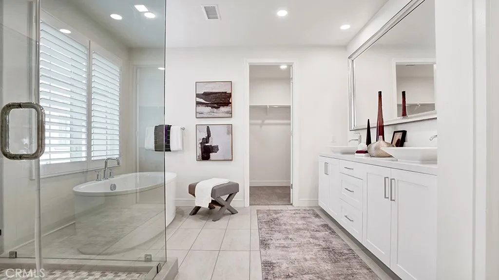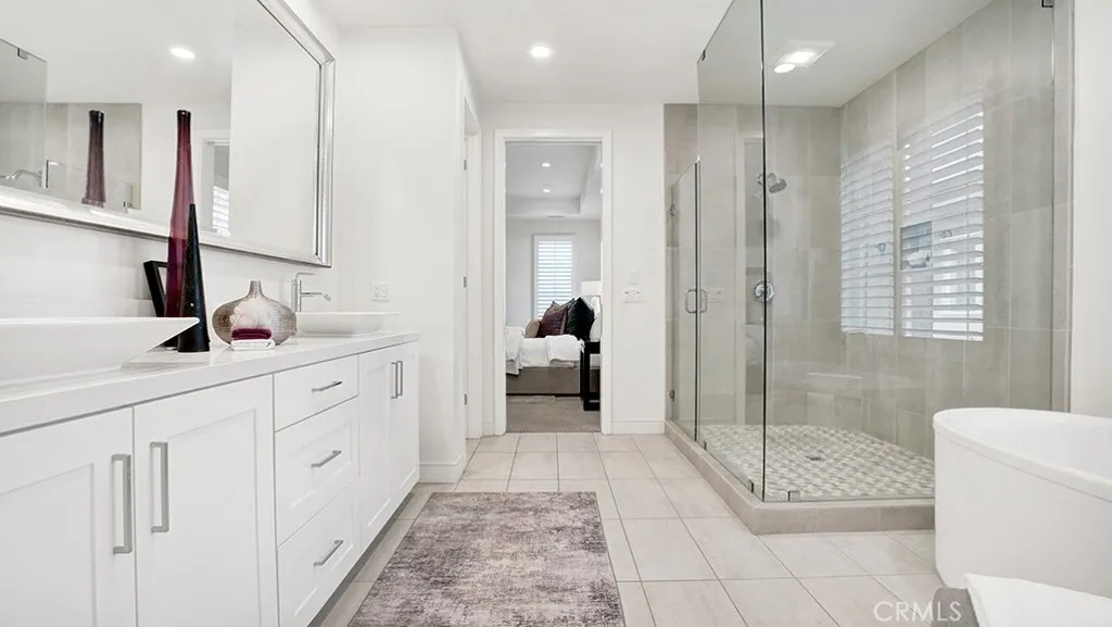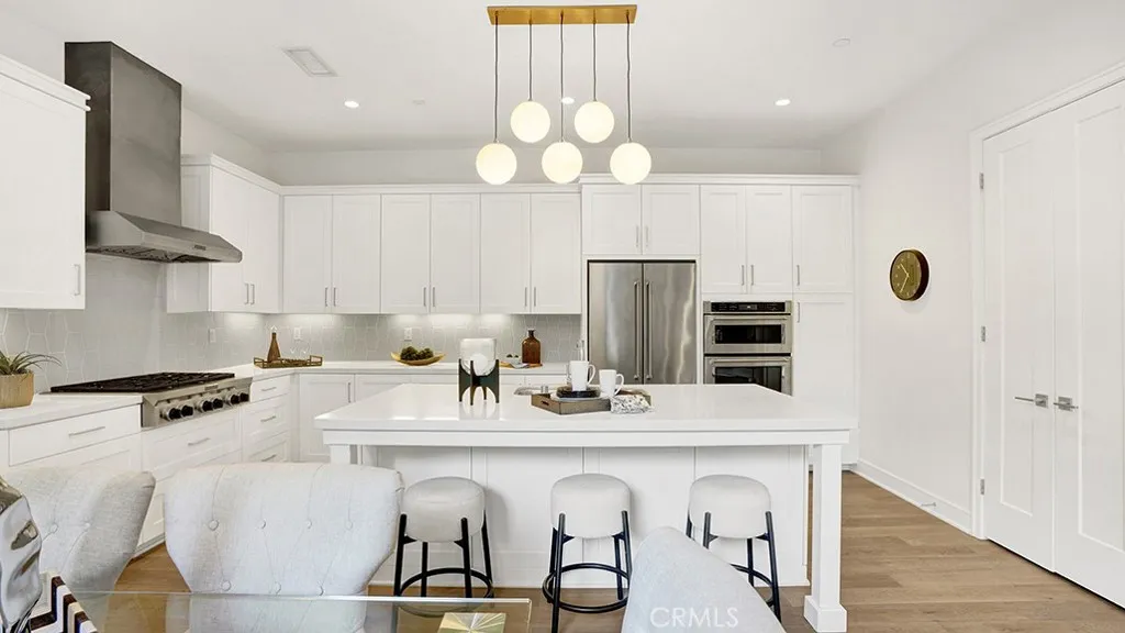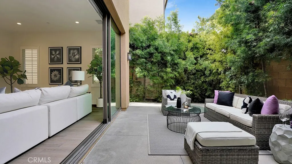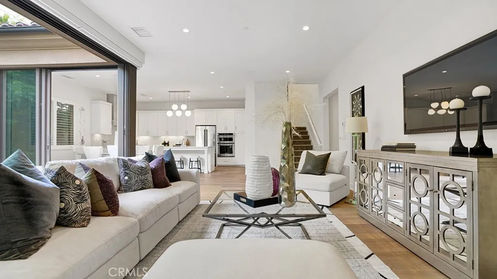 Indulge in a lifestyle of unmatched elegance within the prestigious gated community of Barcelona. This stunning, highly upgraded detached residence welcomes you with a modern open-concept floor plan, highlighted by designer laminate flooring and sophisticated LED lighting throughout. At the heart of the home lies a show-stopping gourmet kitchen, a chefs dream featuring premium KitchenAid commercial-grade appliances, a massive quartz center island with a full backsplash, and soft-close cabinetry. For seamless indoor-outdoor living, the great rooms panoramic sliding glass doors disappear to reveal a private, serene patioperfect for relaxation or morning coffee. Practicality meets luxury with a sought-after main-floor bedroom and full bath, providing the ideal setup for guests or a home office. Upstairs, the versatile loft offers a secondary living space, while the palatial primary suite serves as a true sanctuary with its deep soaking tub, separate walk-in shower, and expansive walk-in closet. No detail has been overlooked, from the custom electric Hunter Douglas shades and classic shutters to the dedicated upstairs laundry room complete with a sink and ample storage. Beyond your front door, enjoy resort-caliber amenities including a pool, spa, and the extensive parks, tennis courts, and sports fields of Los Olivos. Perfectly situated for the modern commuter, you are minutes from the Irvine Spectrums world-class dining and shopping, with effortless access to the 405, 5, and 133 freeways.