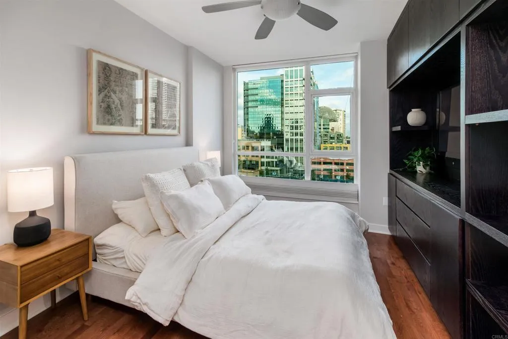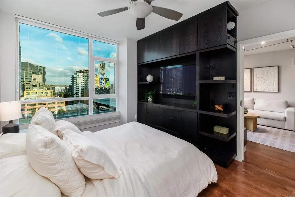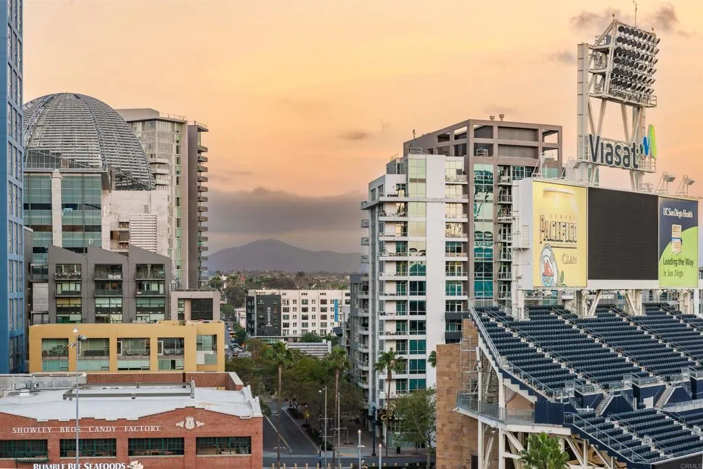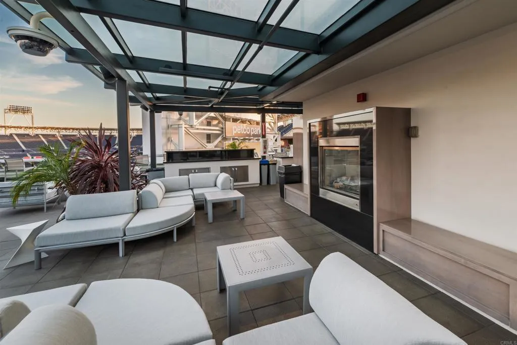 Perched above Petco Park inside the iconic The Legend, this extraordinary 2-bedroom, 2-bath residence offers one of the most coveted and truly one-of-a-kind outdoor spaces in all of Downtown San Diego. The showpiece of the home is an expansive private terraceone of the largest in the buildingpositioned directly above the stadium with jaw-dropping views into home plate and over Gallagher Square. From this unmatched vantage point, you can watch the energy of the game unfold while enjoying the comfort and privacy of your own luxury residencean experience few properties in the city can offer. Designed for unforgettable entertaining and effortless indoor-outdoor living, the terrace is a true extension of the home. Host game-day gatherings, relax beside the fire feature, or enjoy a cold drink while watching the San Diego Padres take the fieldthis is San Diego living at its most iconic. An outdoor bar with keg system, beverage refrigerator, and additional storage elevates the space even further, creating what may be the ultimate private viewing lounge in the Ballpark District. Inside, the residence has been thoughtfully upgraded with refined finishes and modern comforts throughout. The remodeled interior features updated countertops, custom lighting, built-in cabinetry and bench seating, a sleek fireplace, and a Murphy bed that provides flexible living space for guests or a home office. A Nest HVAC system adds smart climate control, while large windows frame the surrounding cityscape and bring natural light into the open living areas. Residents of The Legend enjoy resort-style ame