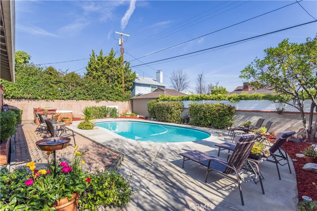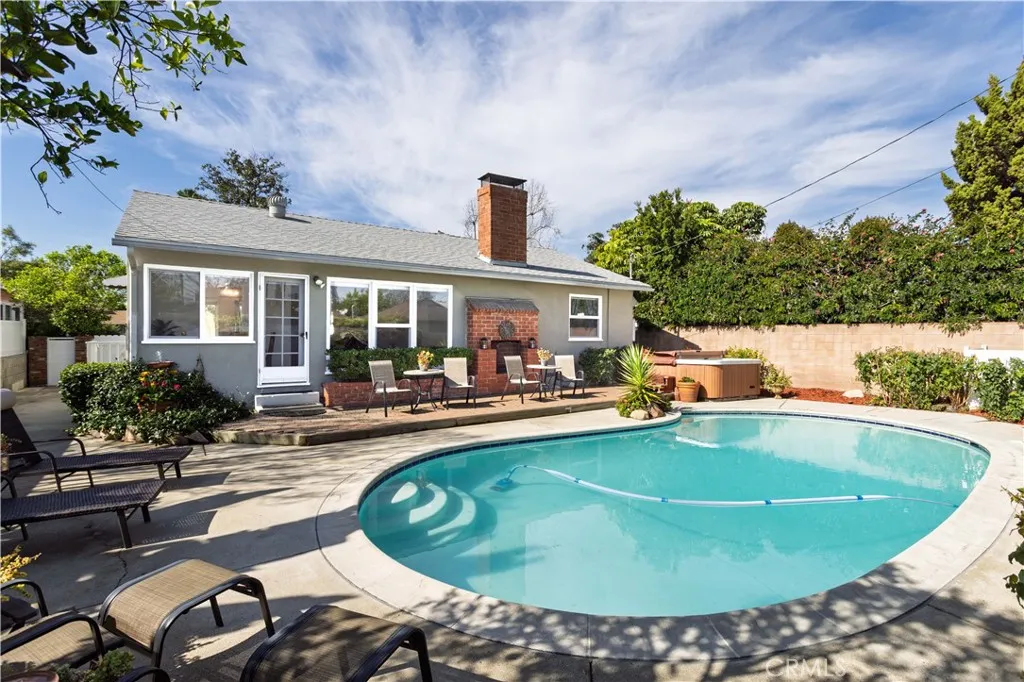 First Time Ever on the Market! Charming 3 Bedroom Pool Home with Timeless Appeal. Welcome to this stunning 3 bedroom, 2 bath pool home that exudes character and undeniable charm. Boasting incredible curb appeal, a stately magnolia tree, and a distinctive red ribbon driveway leading to an attached 2 car garage, this home makes a memorable first impression. A brick walkway and patio guide you to the inviting front door. Step inside to a bright and open living room, where original hardwood floors and large double pane windows fill the space with natural light. Exposed beams complement the brick fireplace, a unique feature that also doubles as a backyard BBQ. All bedrooms are generously sized, including a versatile convertible bedroom with wood paneling, a display ledge for art, and a full closet. The primary suite features his and hers closets and ample room to unwind. Bathrooms include a remodeled full bath with tub, a glass enclosed shower, and updated countertops, plus a convenient half bath for guests near the entry. LED lighting throughout adds a modern touch. The kitchen, lovingly maintained, showcases warm knotty pine finishes, abundant counter space, built in display shelves, and a cozy breakfast nook perfect for a bench seat. Enjoy seamless indoor outdoor living with doors from both the dining area and kitchen that open to your private backyard retreat. Relax by the sparkling pool and jacuzzi, surrounded by fruit trees and plenty of space for lounging, storage, or a lush vegetable garden. Upgrades include plumbing, sewer line, newer HVAC system, dual pane windows, new